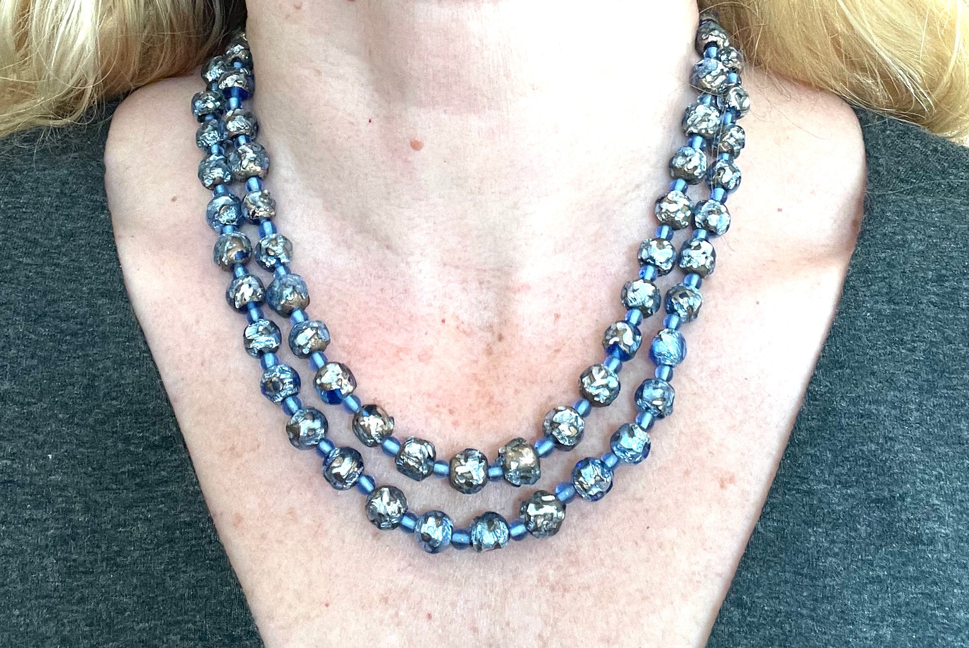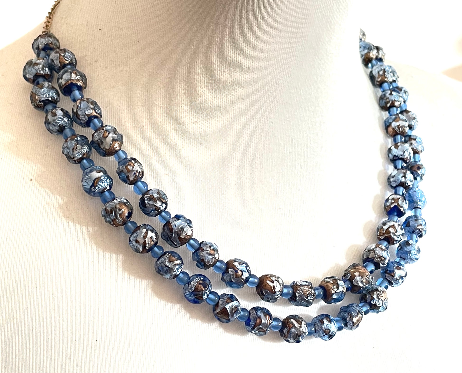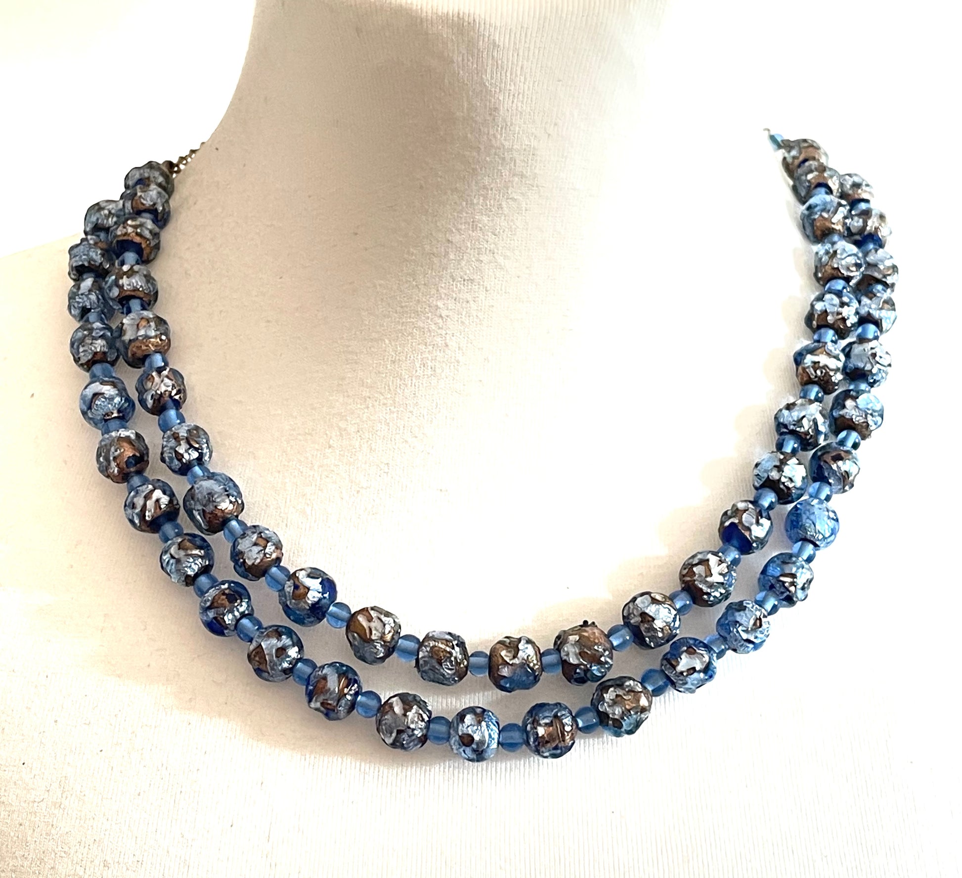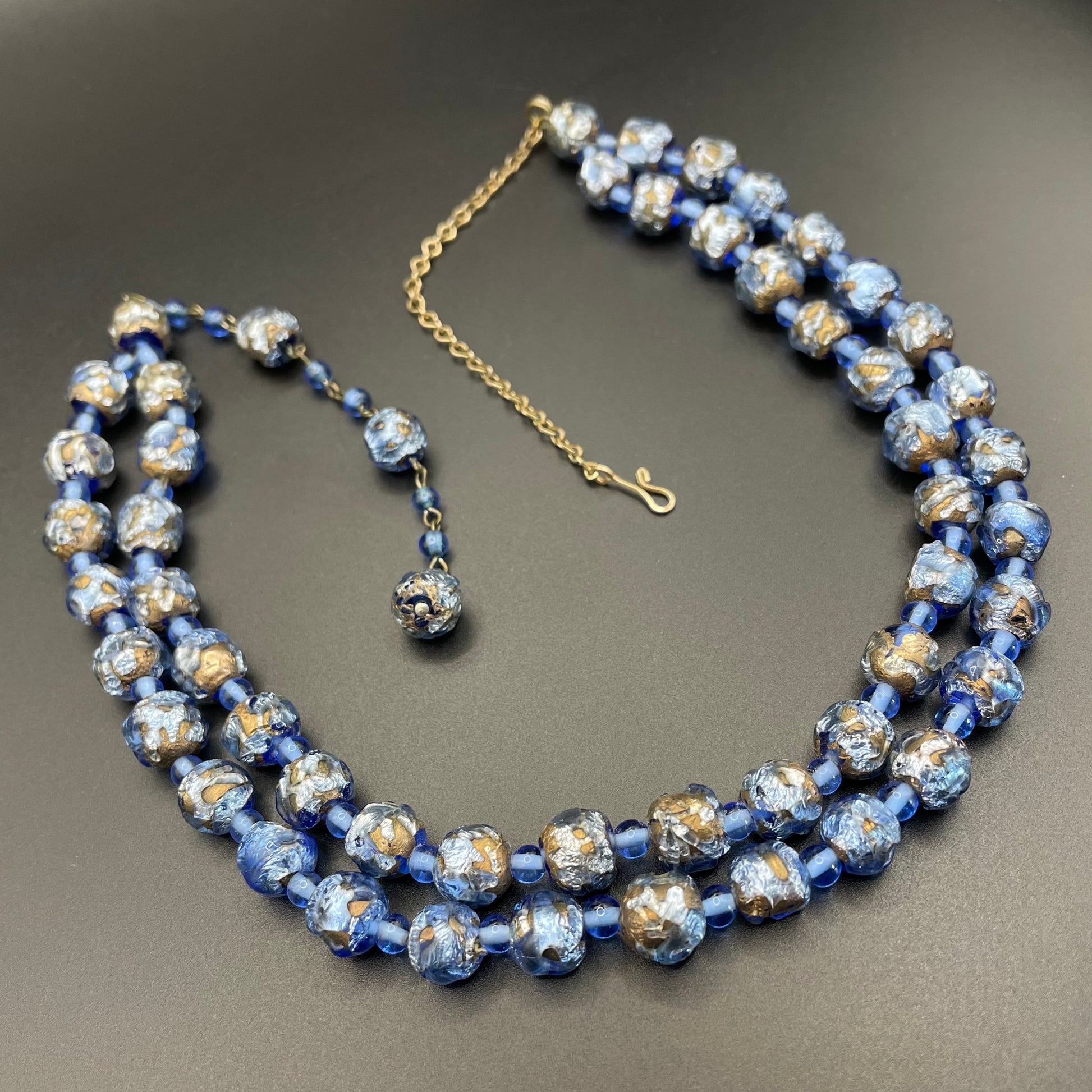 Vintage Art Deco double strand gold and shades of blue foiled glass beaded necklace, beautiful beads