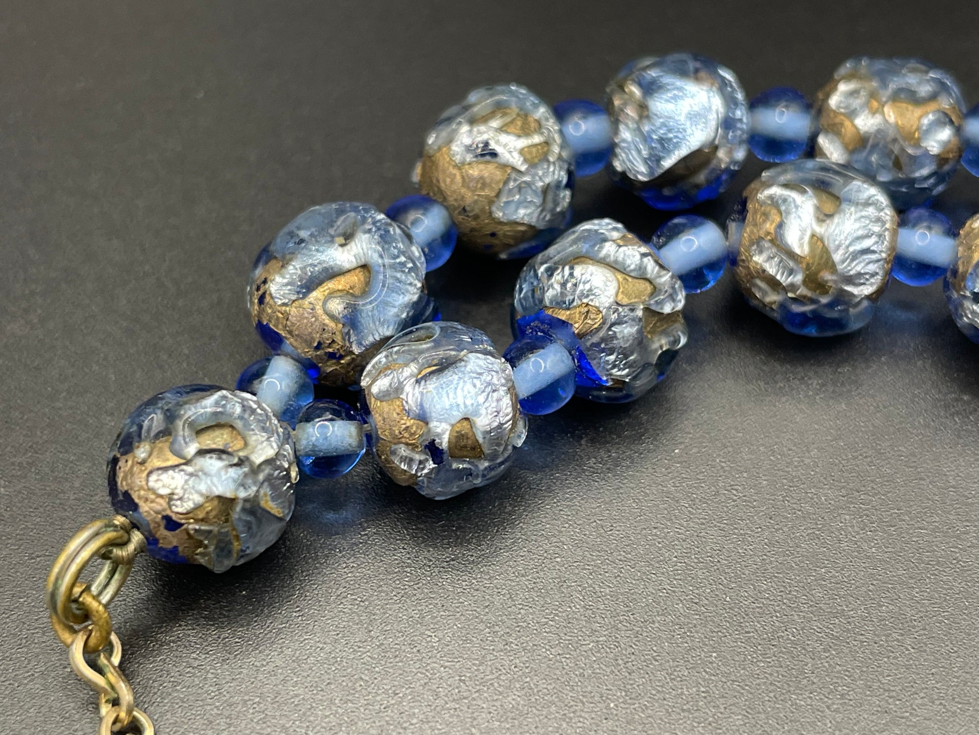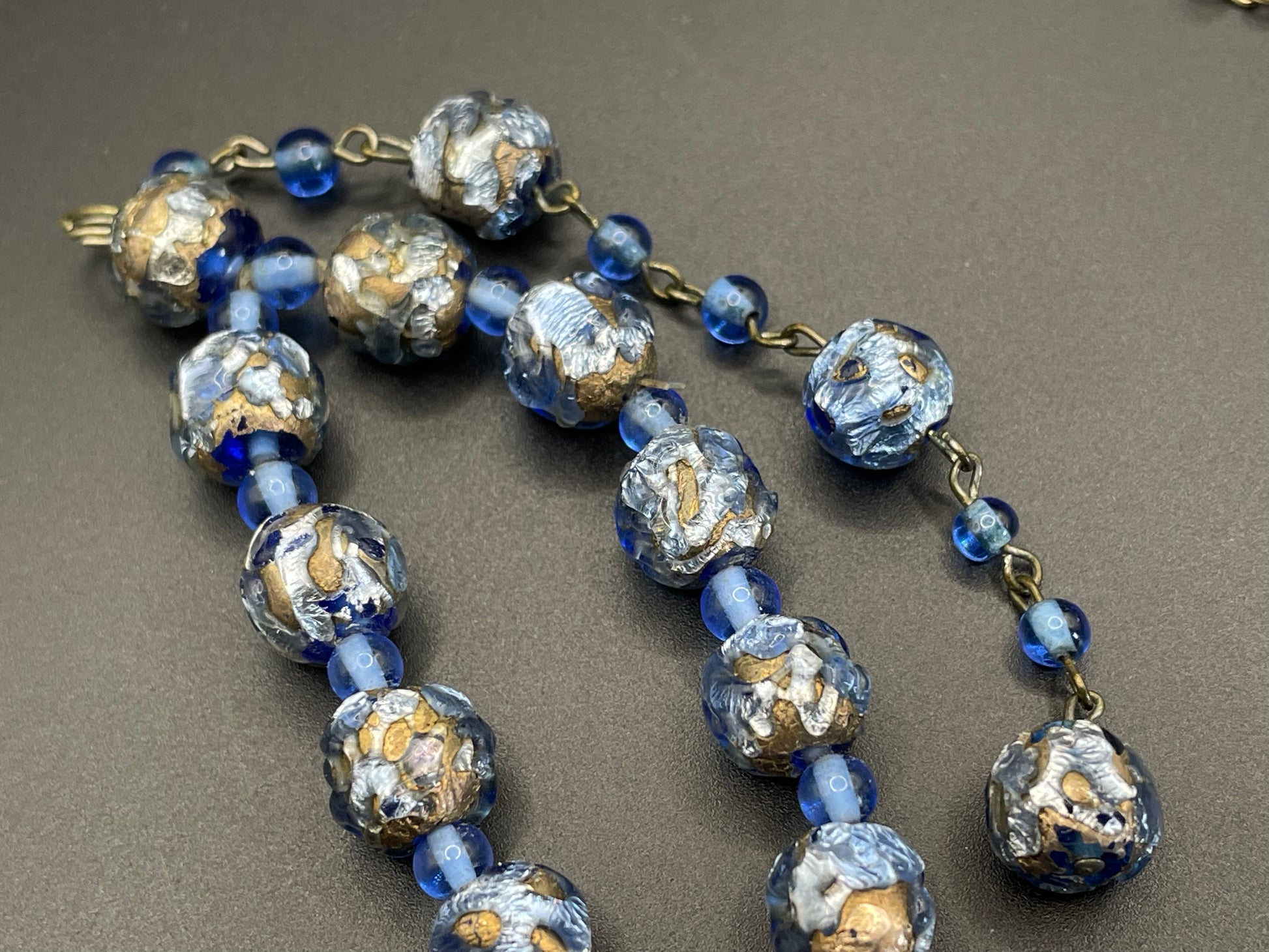 Vintage Art Deco double stranded necklace with beautiful blue and gold foiled glass beads with smaller blue glass spacer beads. Each luminescent glass bead contains a beautiful foiled texture with shades of blue and gold inclusions. I understand this type of bead comes under the Murano glass category from Italy and are hand-crafted. This textured foil effect with the gold glow I have heard called 'lava' beads. Any bead experts out there, do message me and correct me if I am wrong!