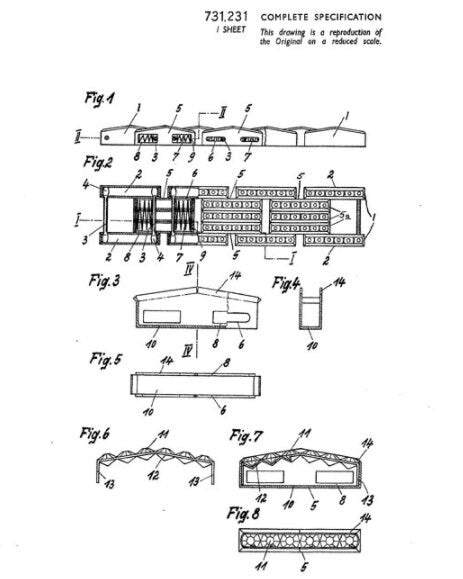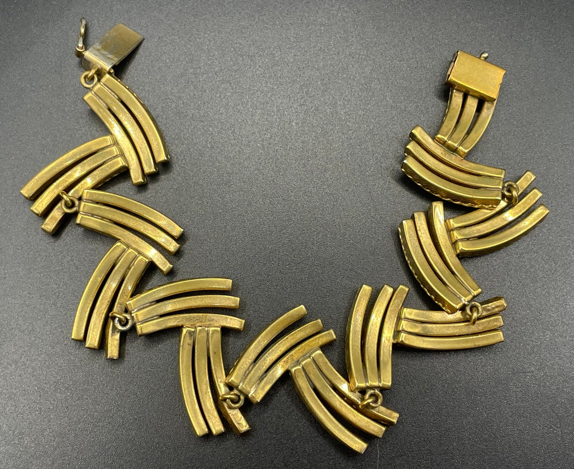 Wonderful vintage Art Deco cocktail bracelet set in yellow gold tone with geometric zigzag / chevron design and channel set clear rhinestones. This example is really unusual, as the links have been cleverly engineered and beautifully connected. The final picture shows the drawings from the patent application that includes examples of this channel setting of the stones.