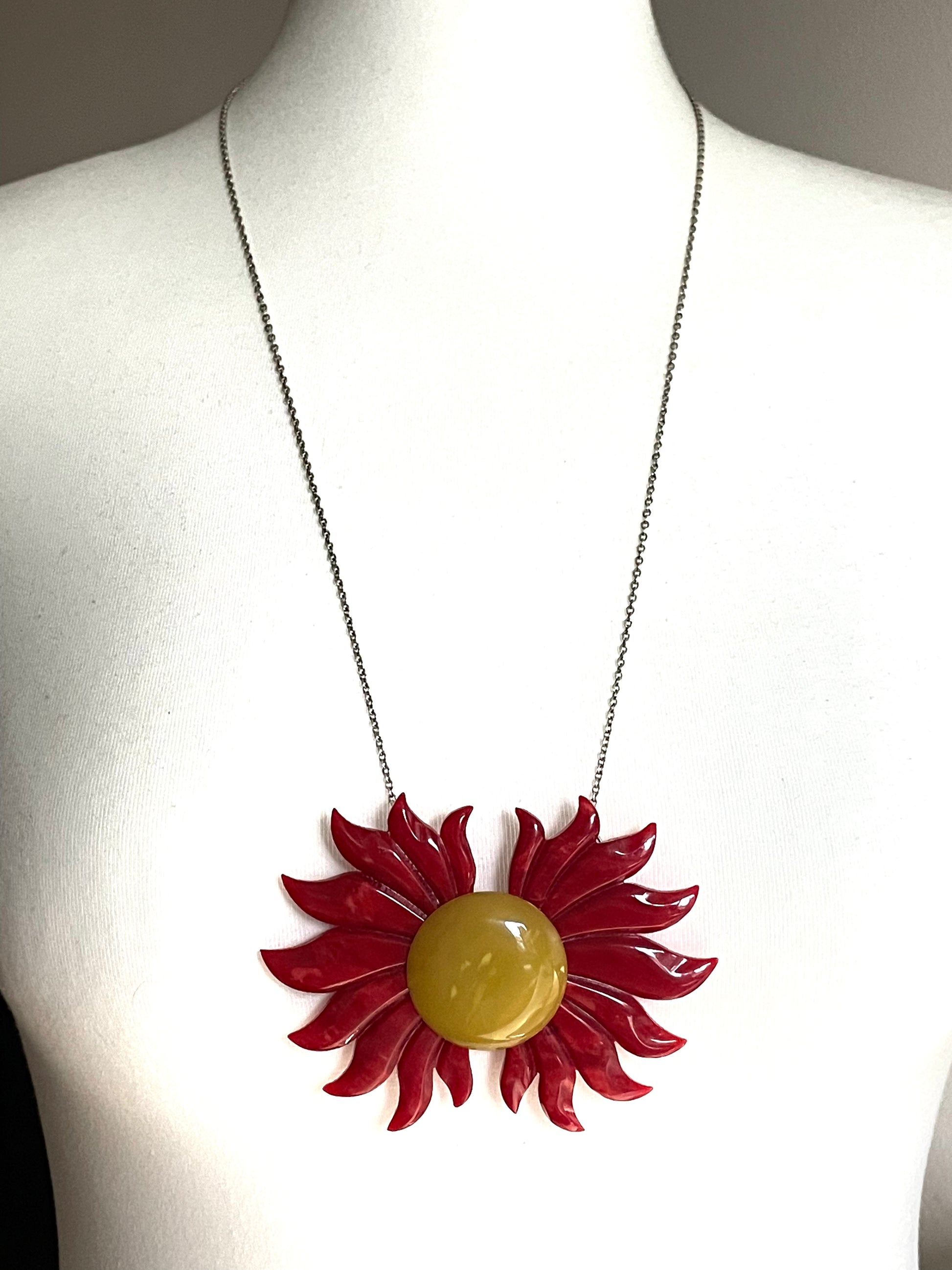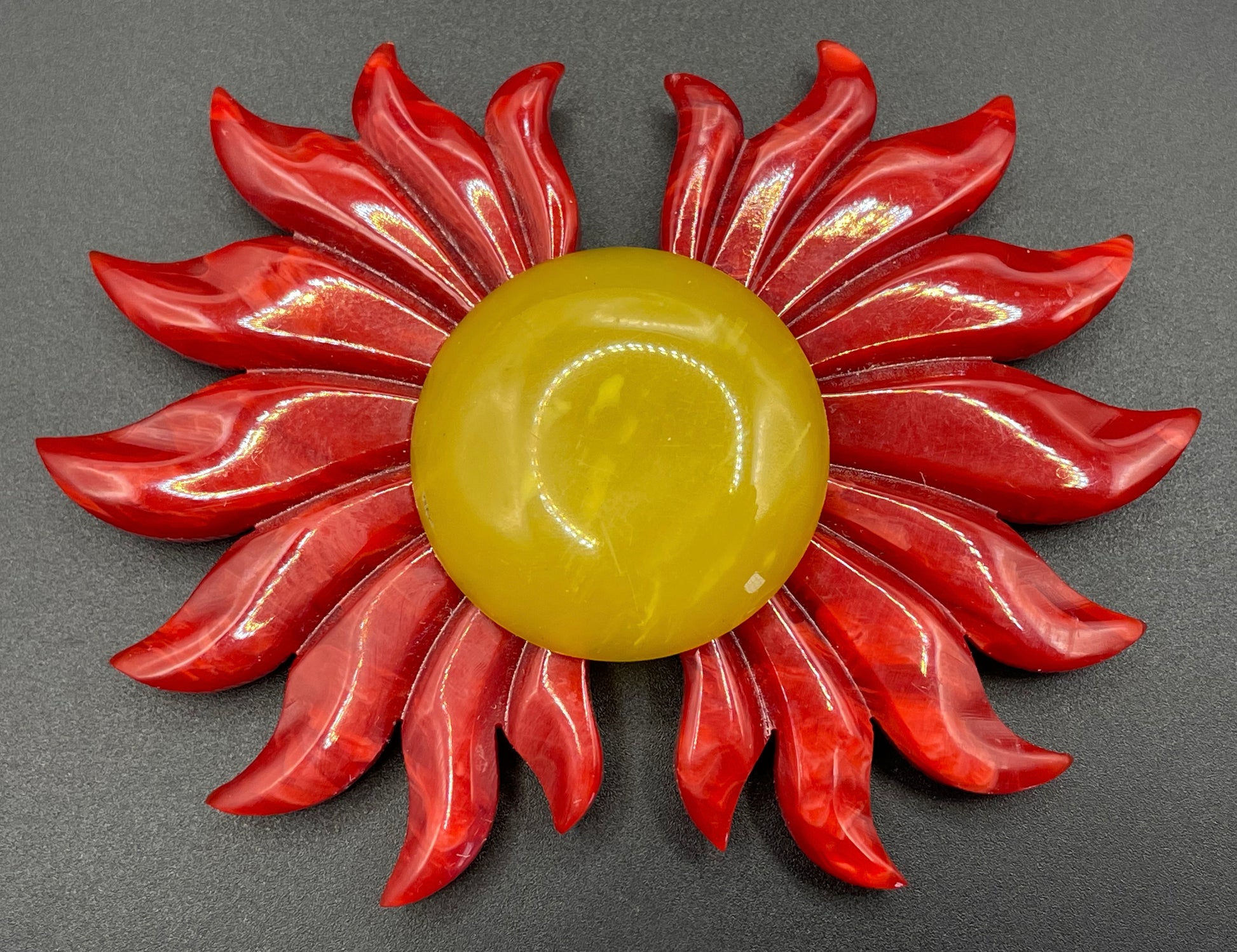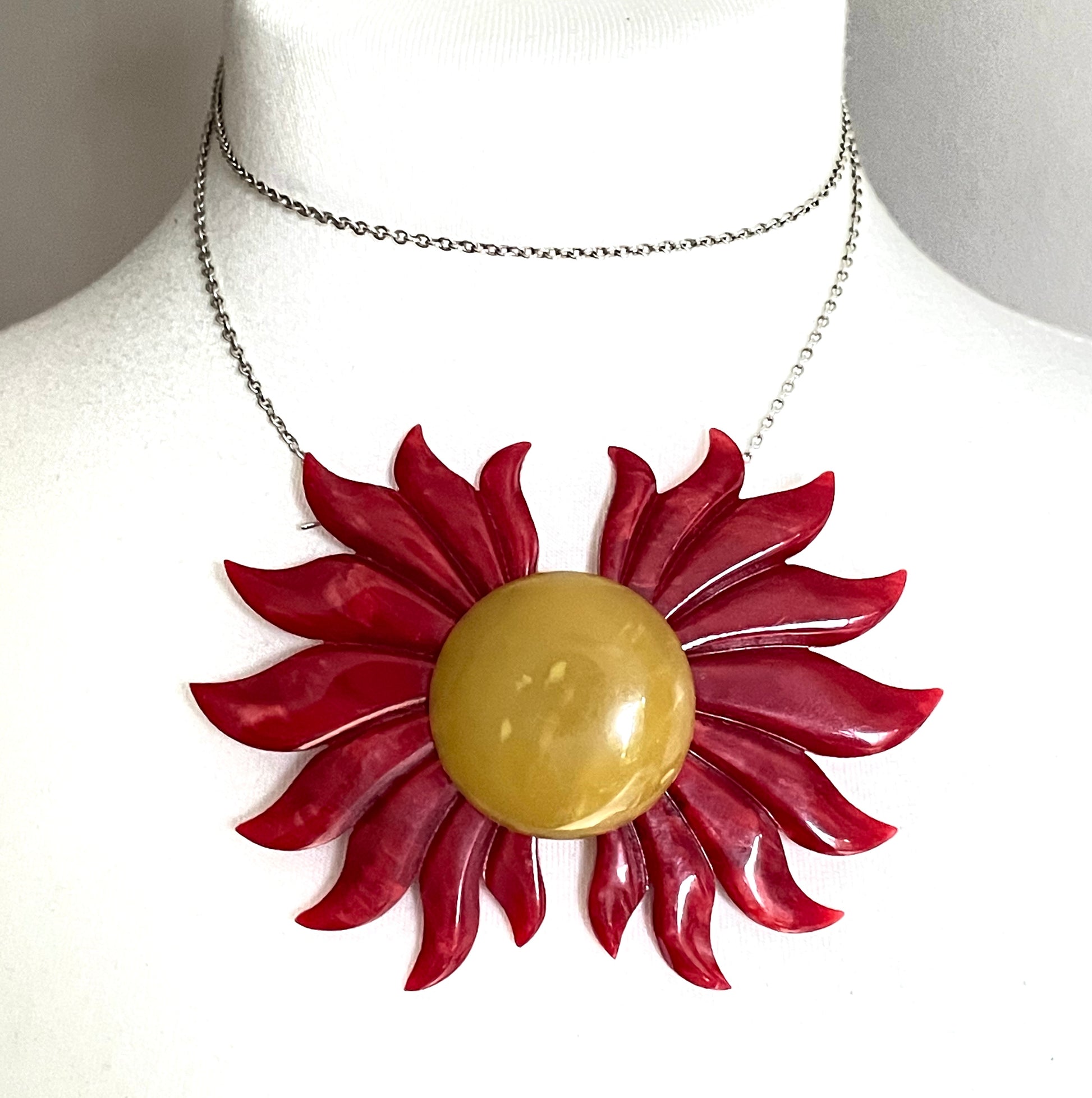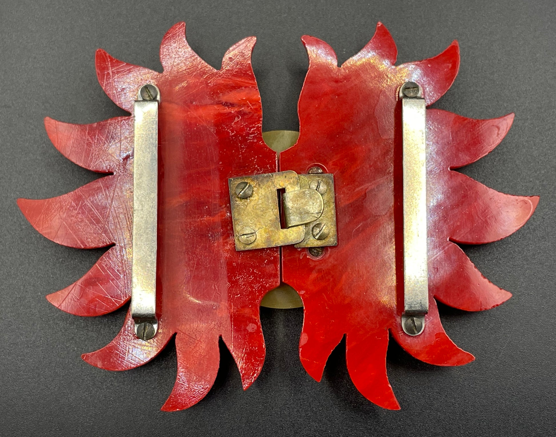 Vintage Art Deco galalith buckle with striking flame design and vibrant yellow, orange and red colours, can be worn as a statement pendant