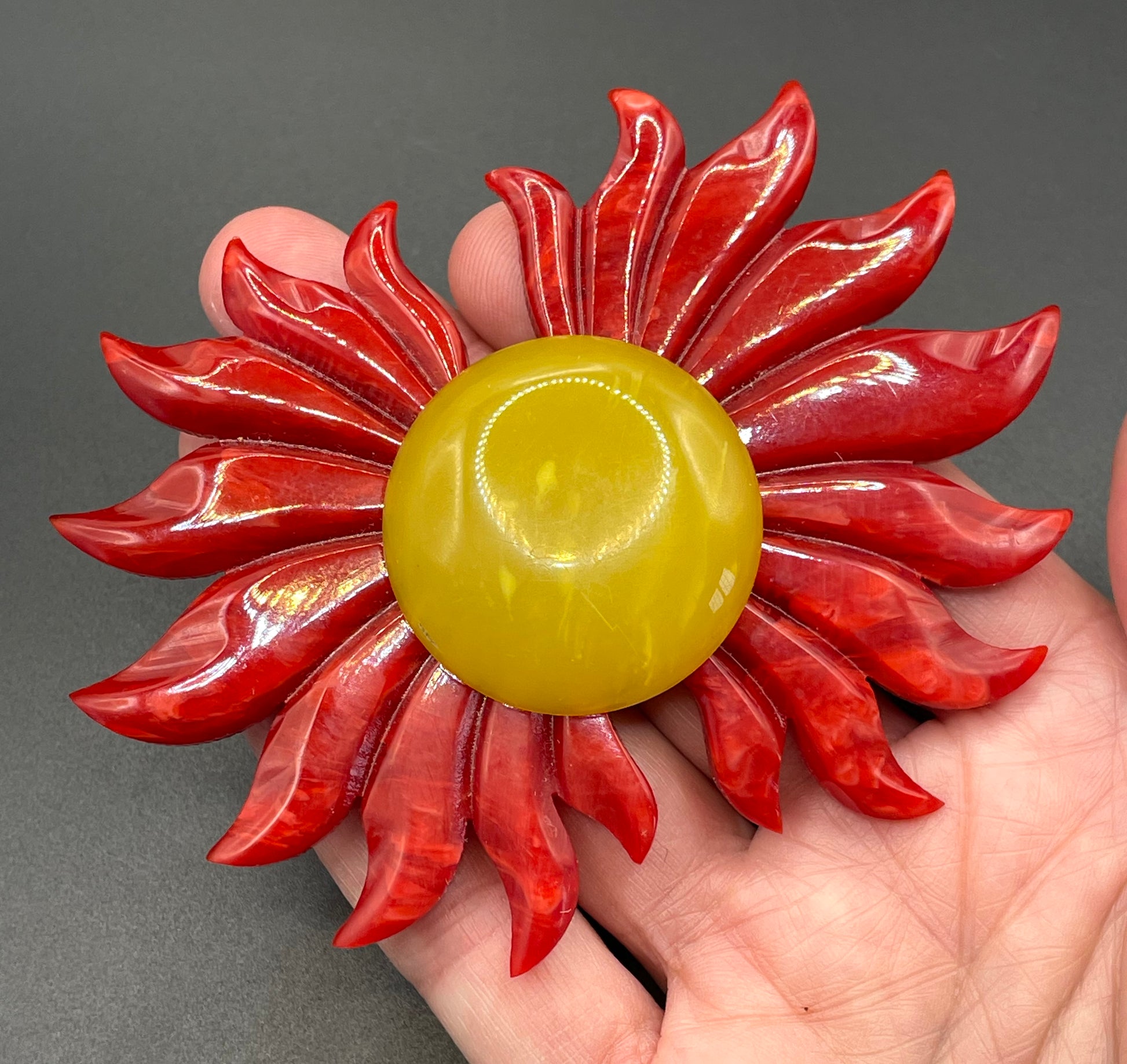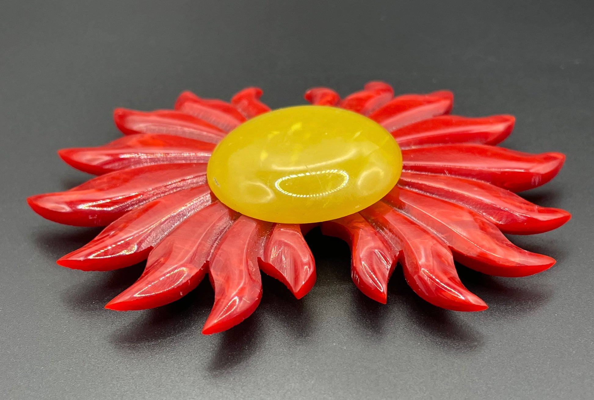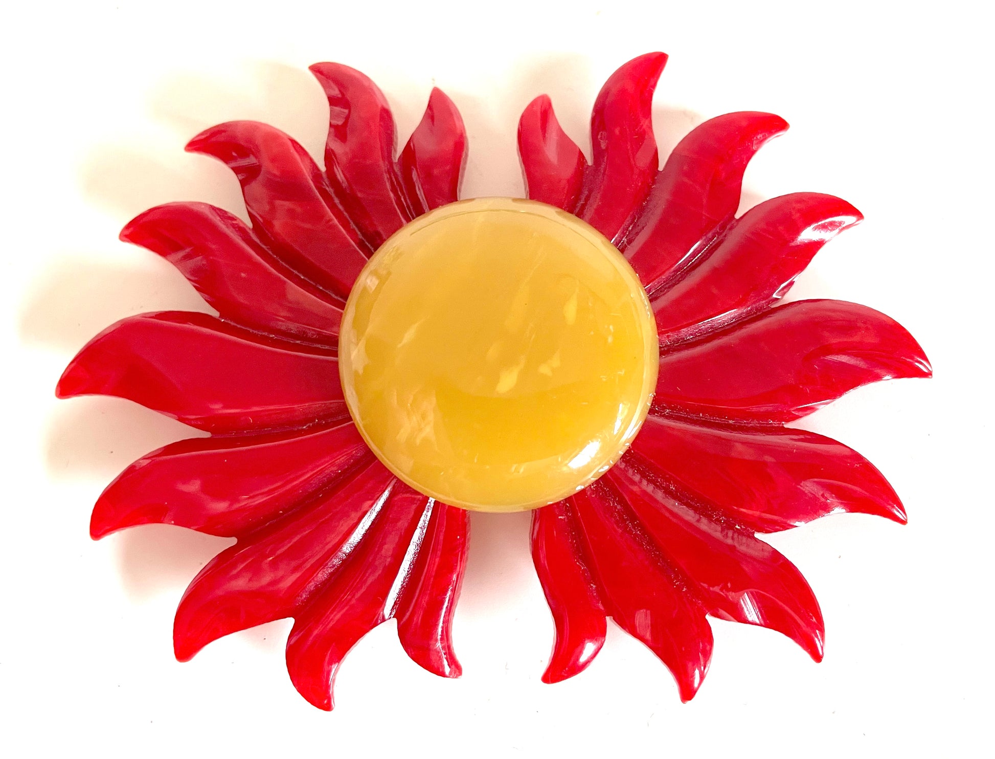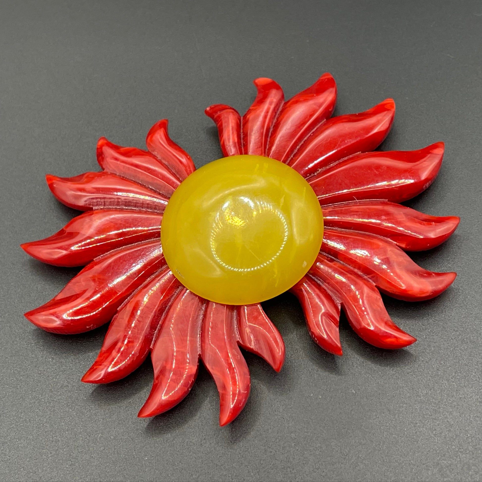 Vintage Art Deco galalith buckle with striking flame design and vibrant yellow, orange and red colours, can be worn as a statement pendant