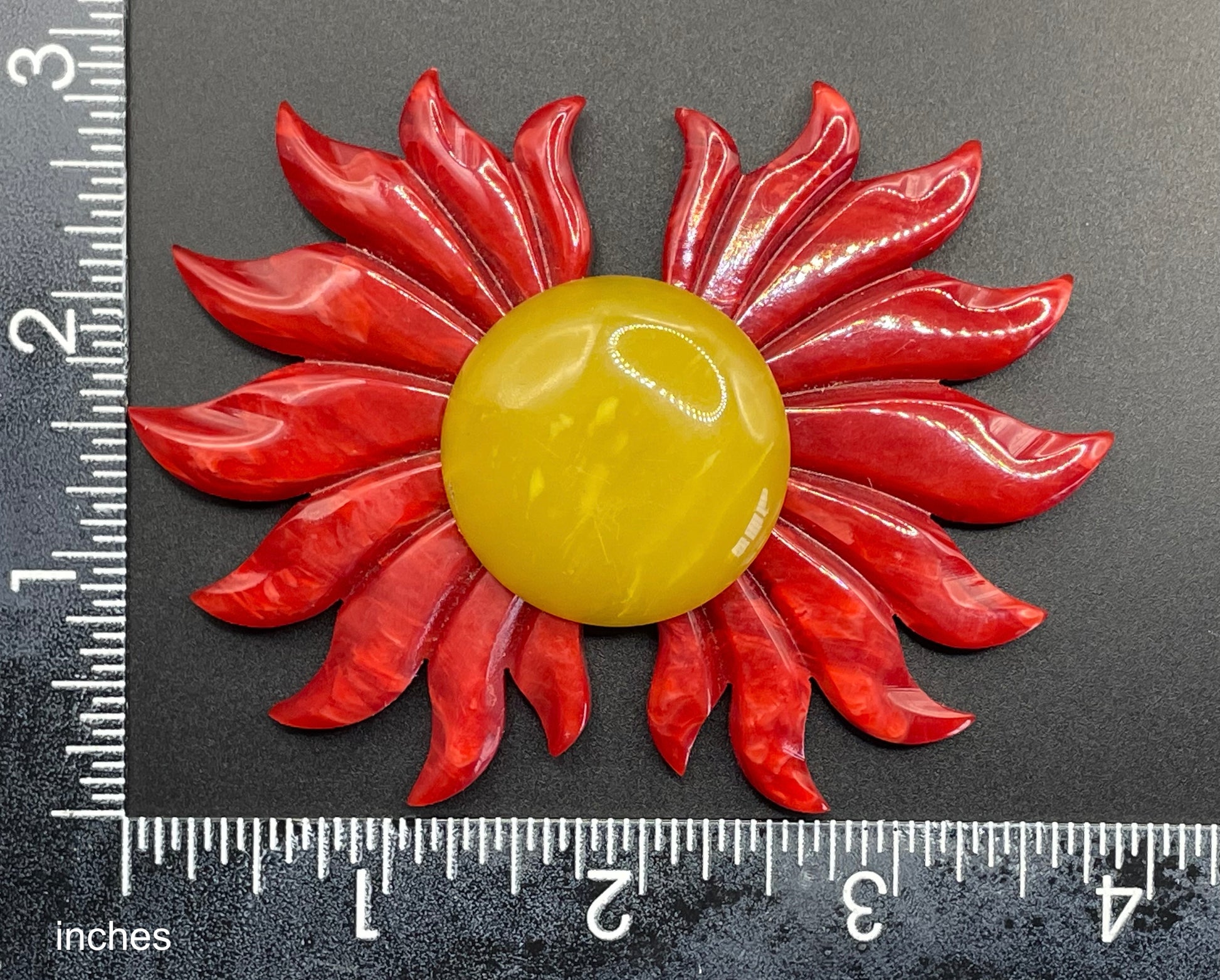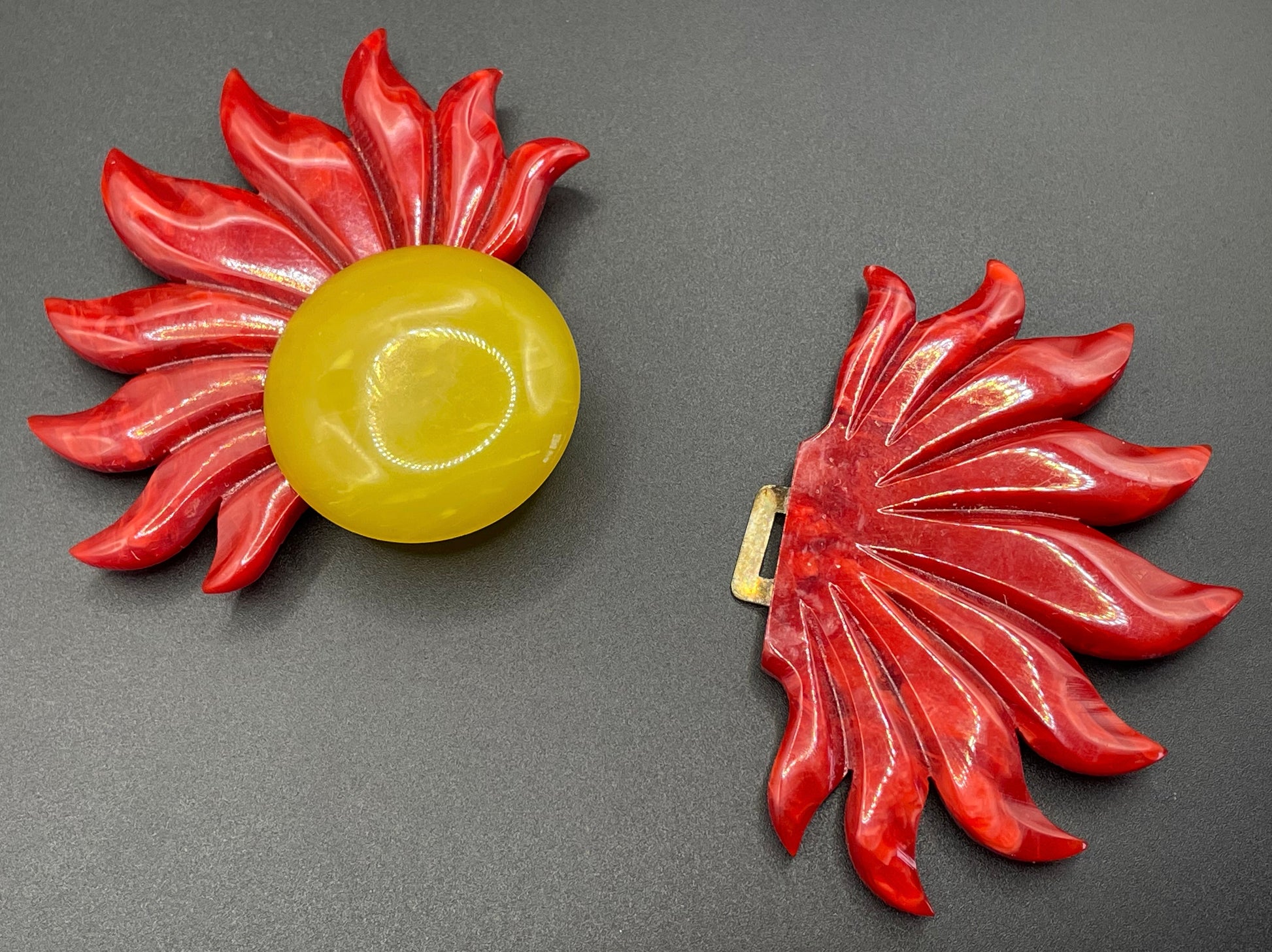 Vintage Art Deco buckle with a stunning flame or perhaps stylised floral design made from beautifully moulded early plastic. My estimation is that the plastic pieces are galalith - an early casein-based plastic used a lot in European jewellery, particularly from Germany and France in the 1920s and 30s. These pieces are beautifully shaped and have a marbled effect in the vibrant yellow and orangey red tones.