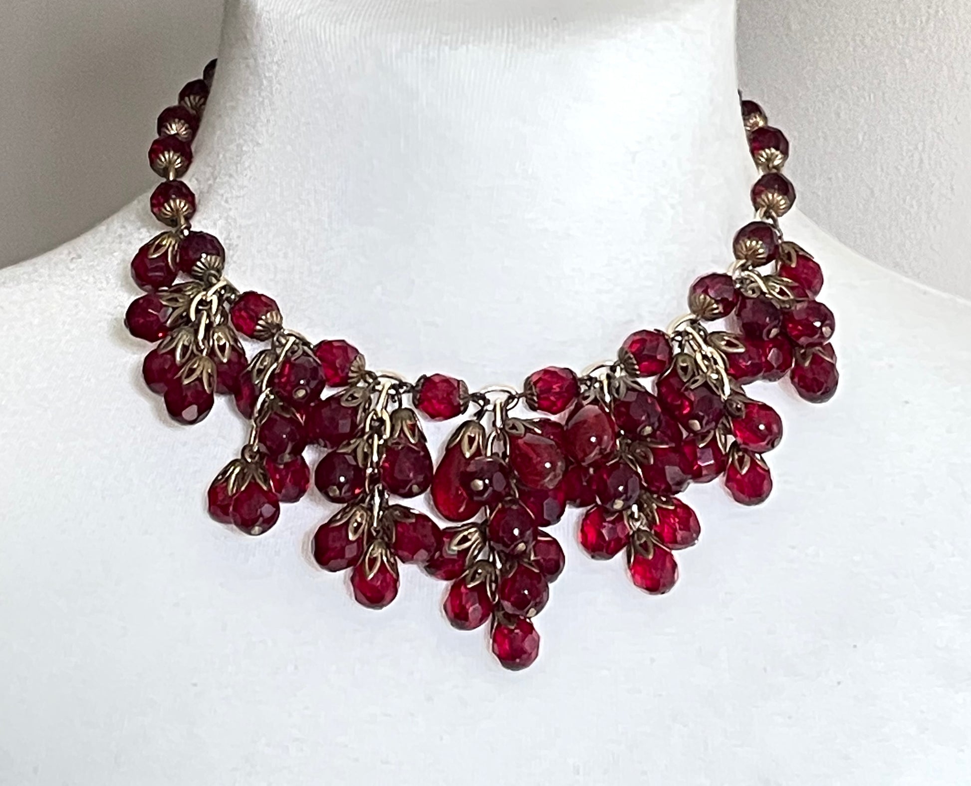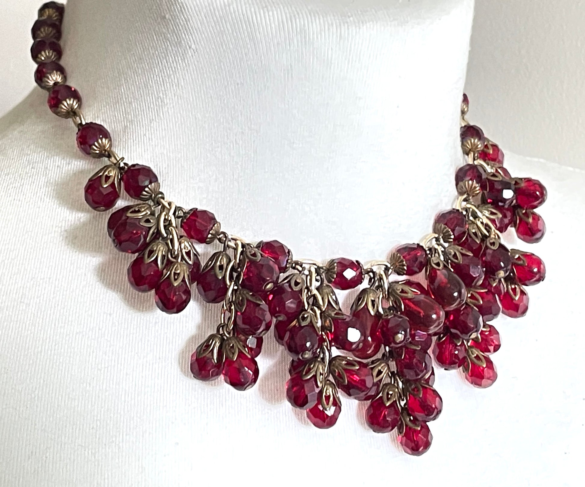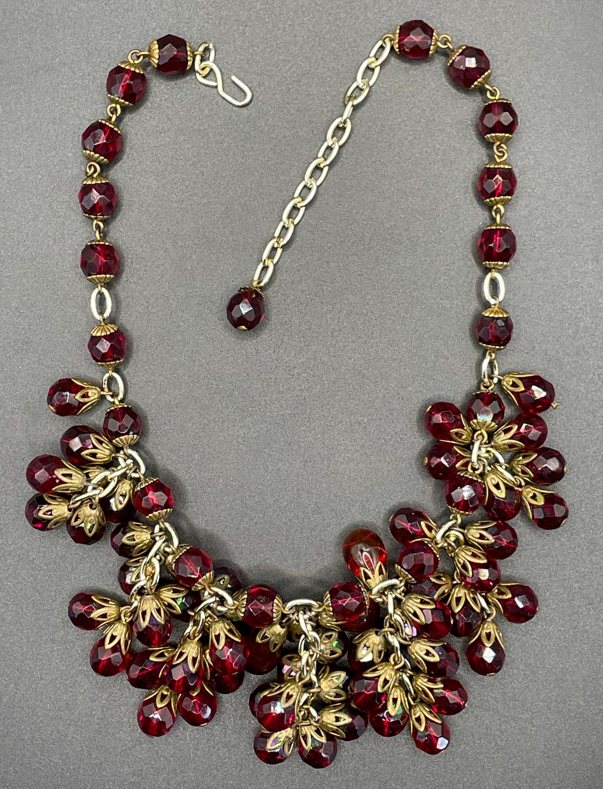 Vintage Art Deco garnet red crystal glass bead fringe necklace, beautiful deep red glass clusters, choker length