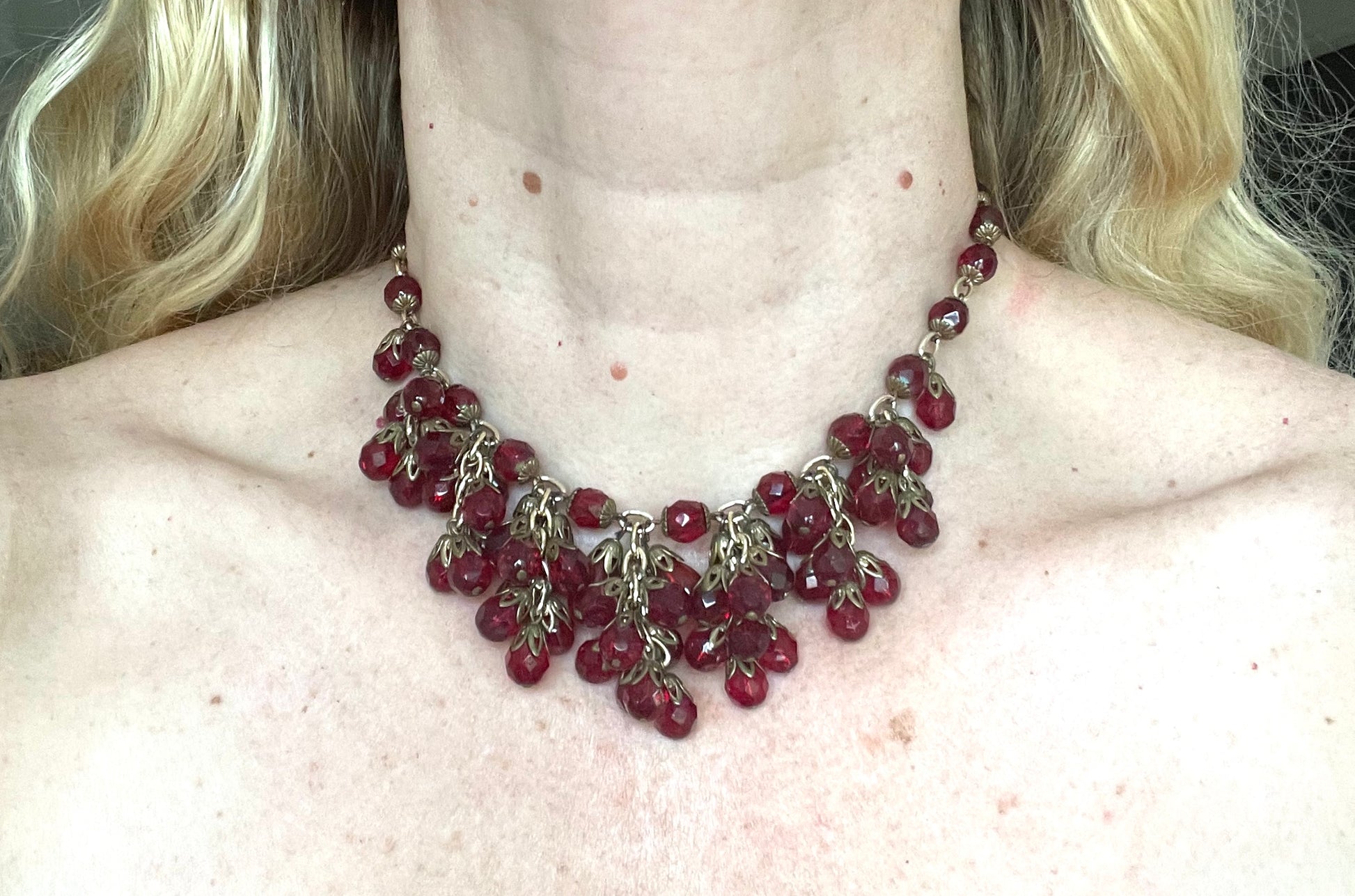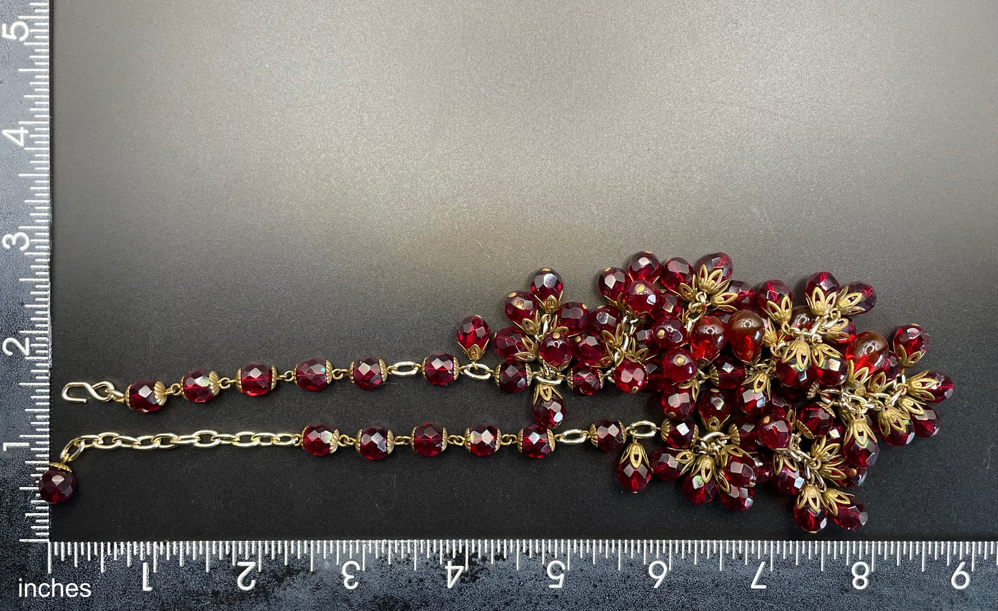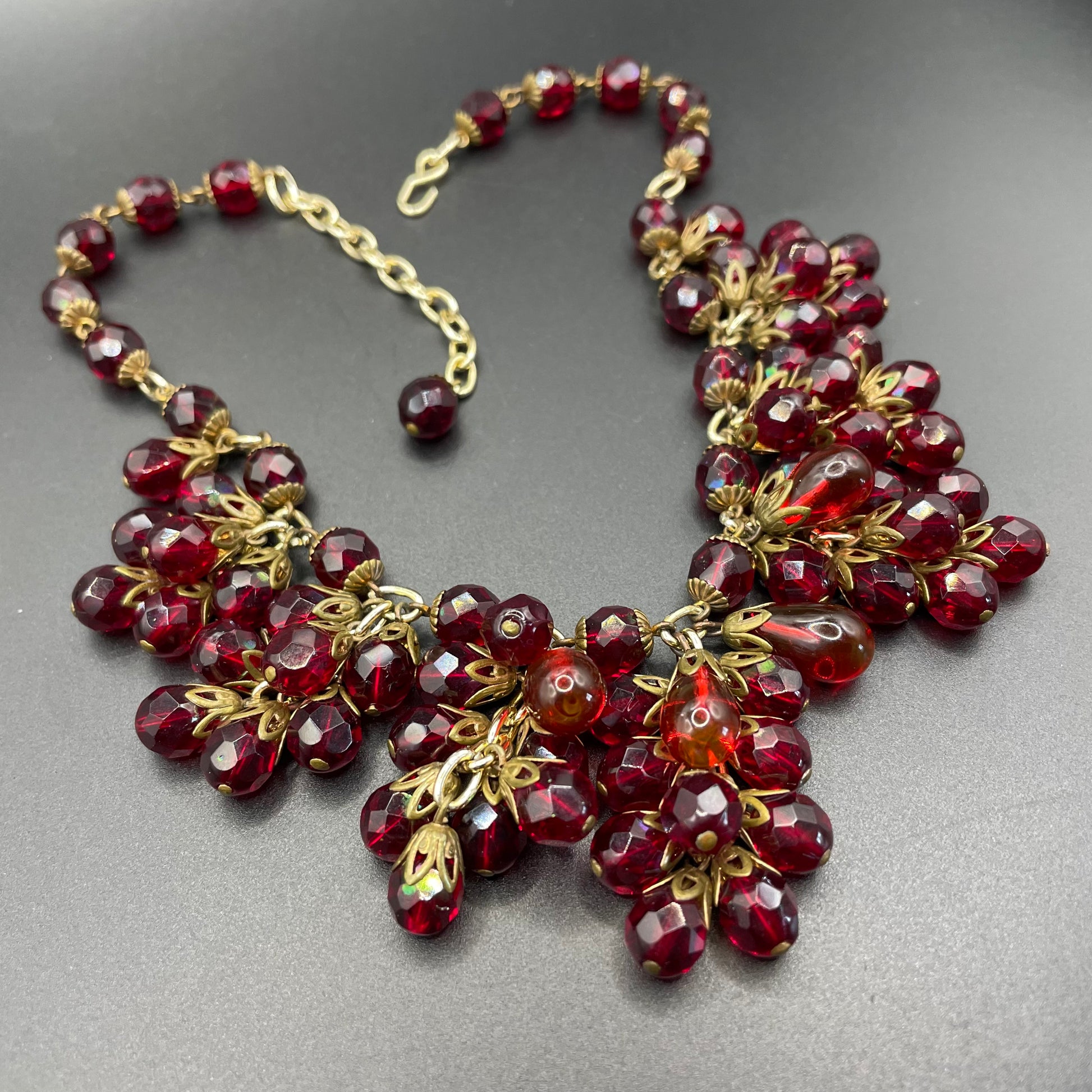 Vintage Art Deco garnet red crystal glass bead fringe necklace, beautiful deep red glass clusters, choker length