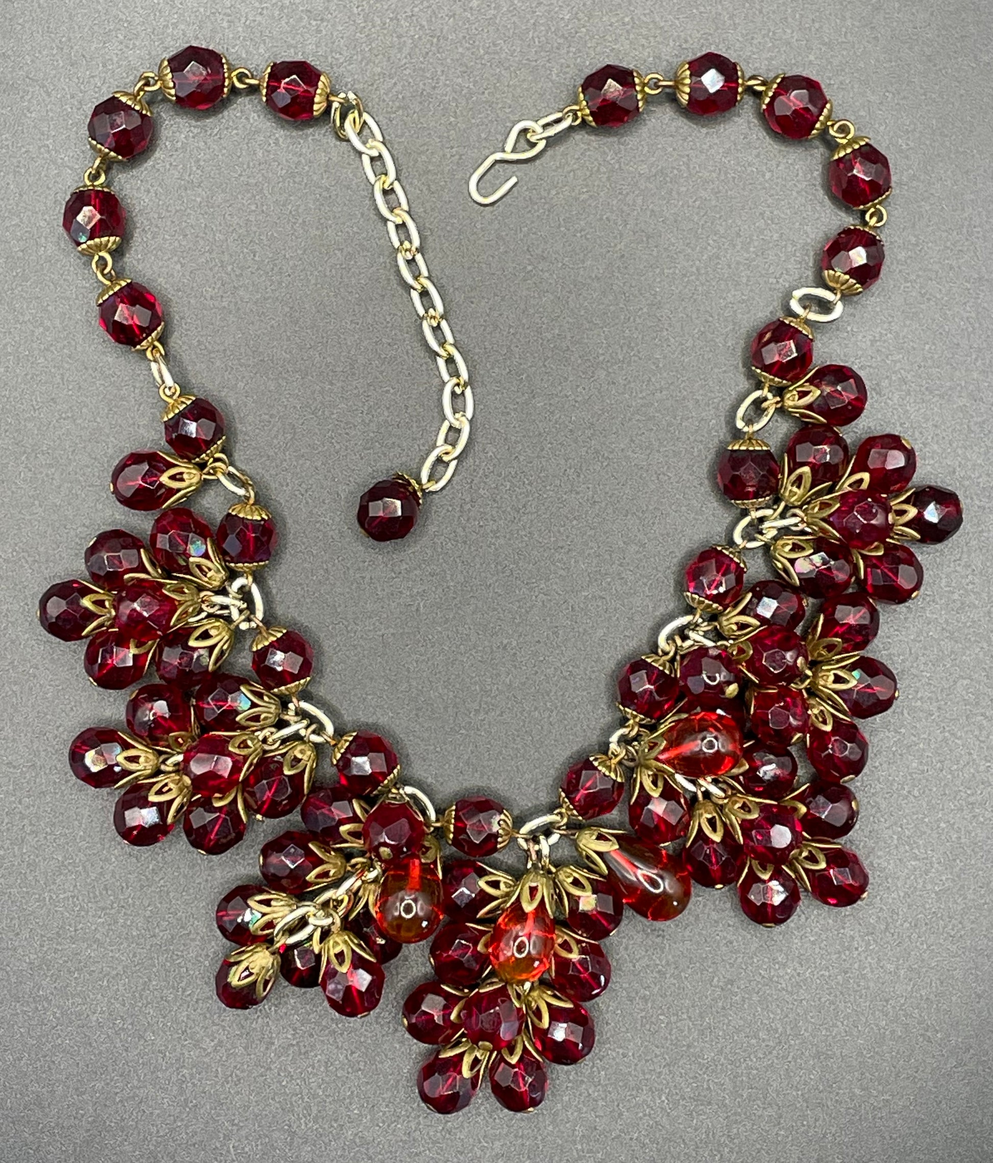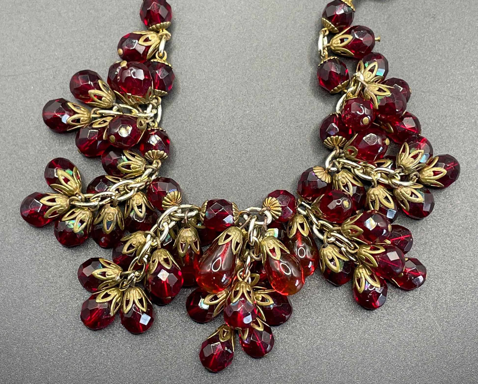 Vintage Art Deco deep garnet red crystal fringe necklace with pretty faceted and smooth teardrop beads with gold tone fittings and attractive bead caps. This necklace is very much in the style of Miriam Haskell pieces, but I have no provenance to suggest who the maker may have been.