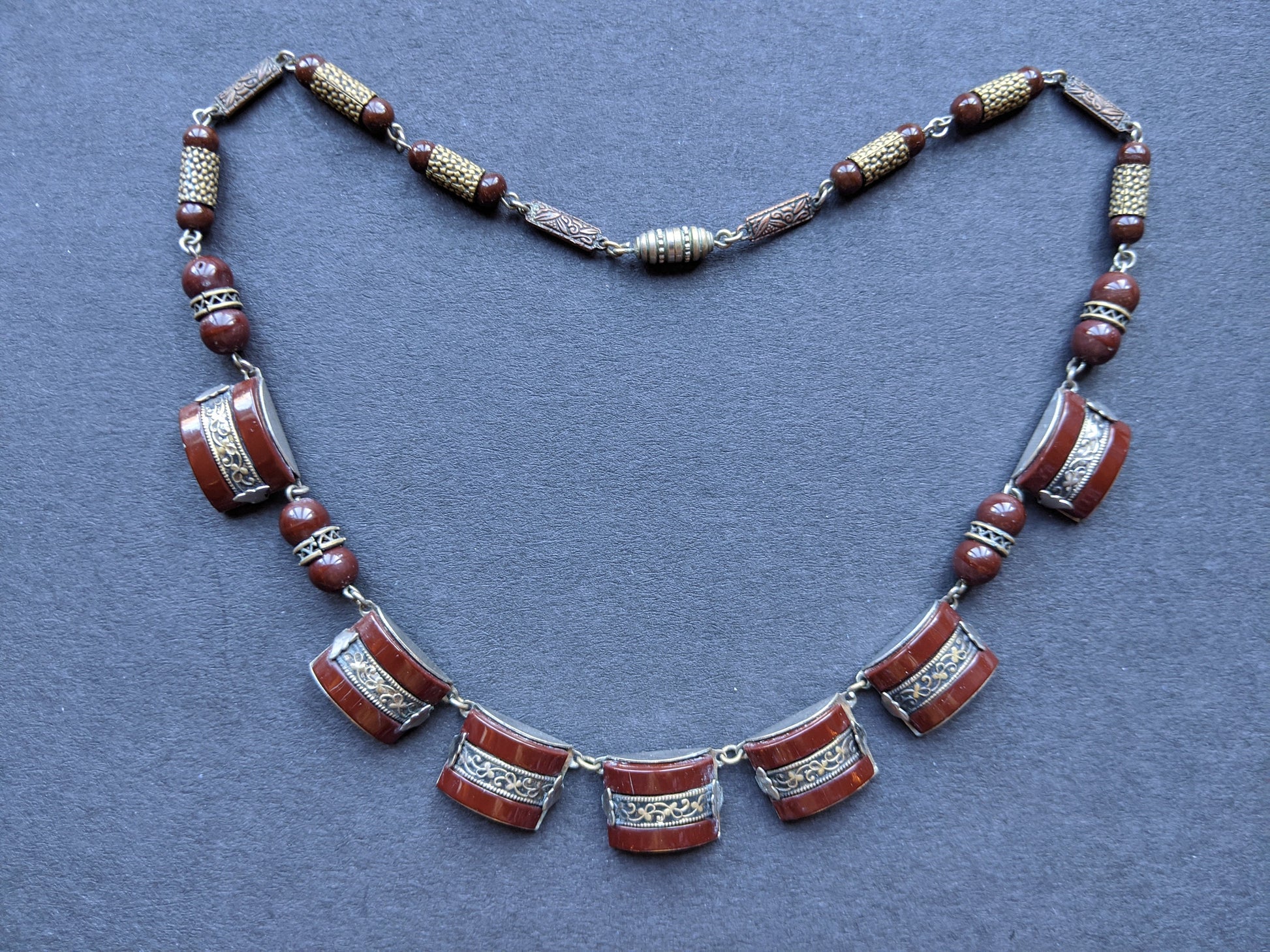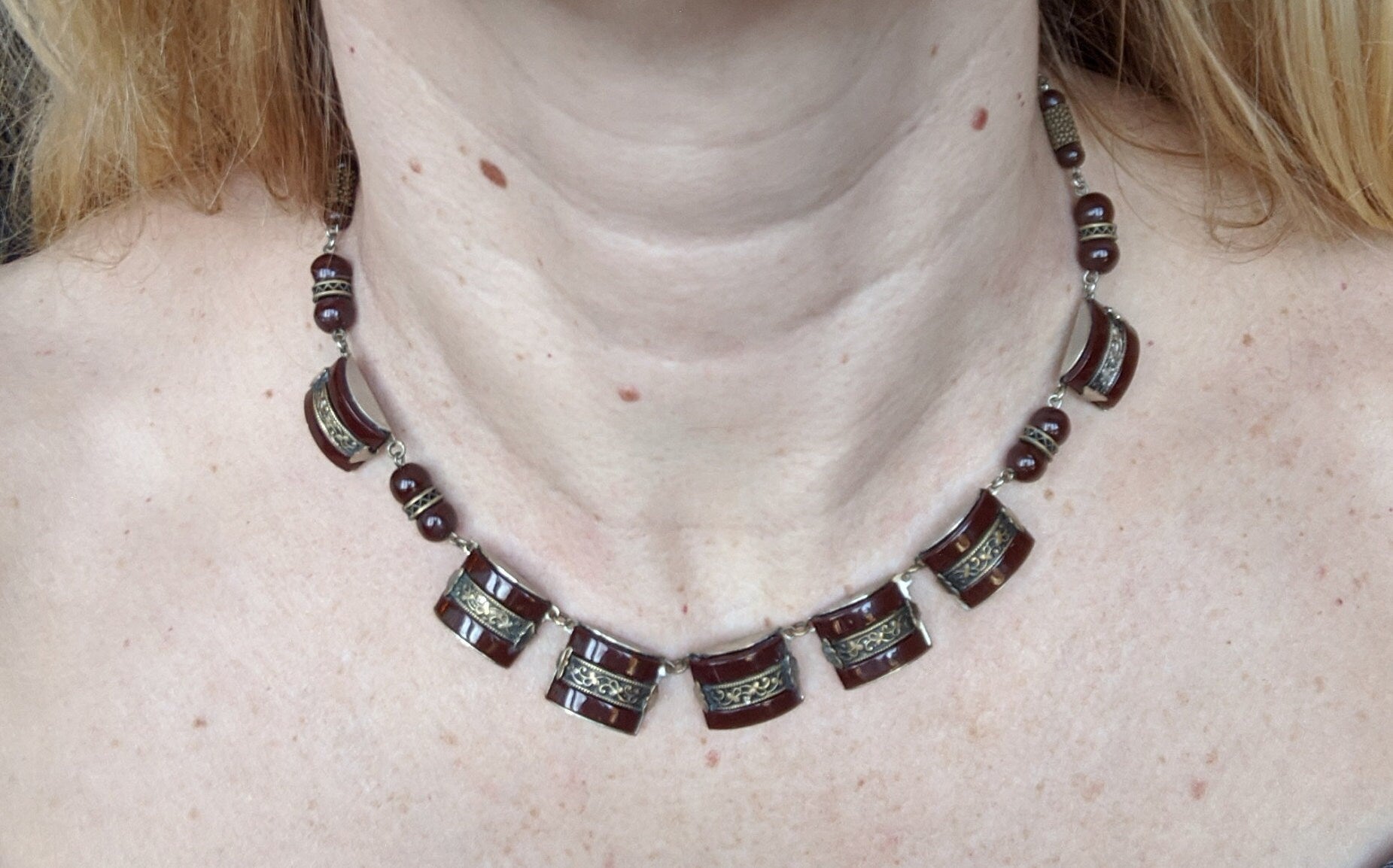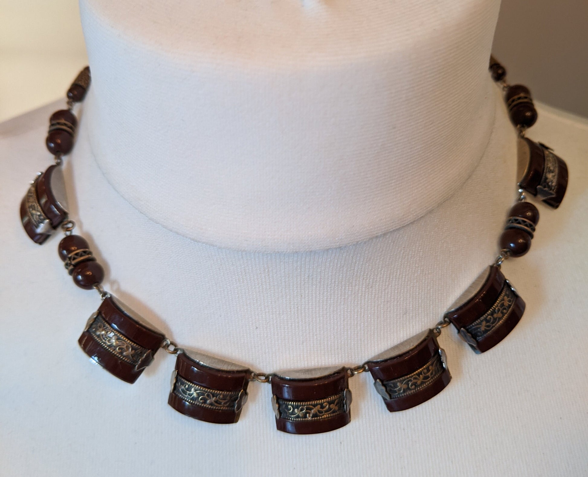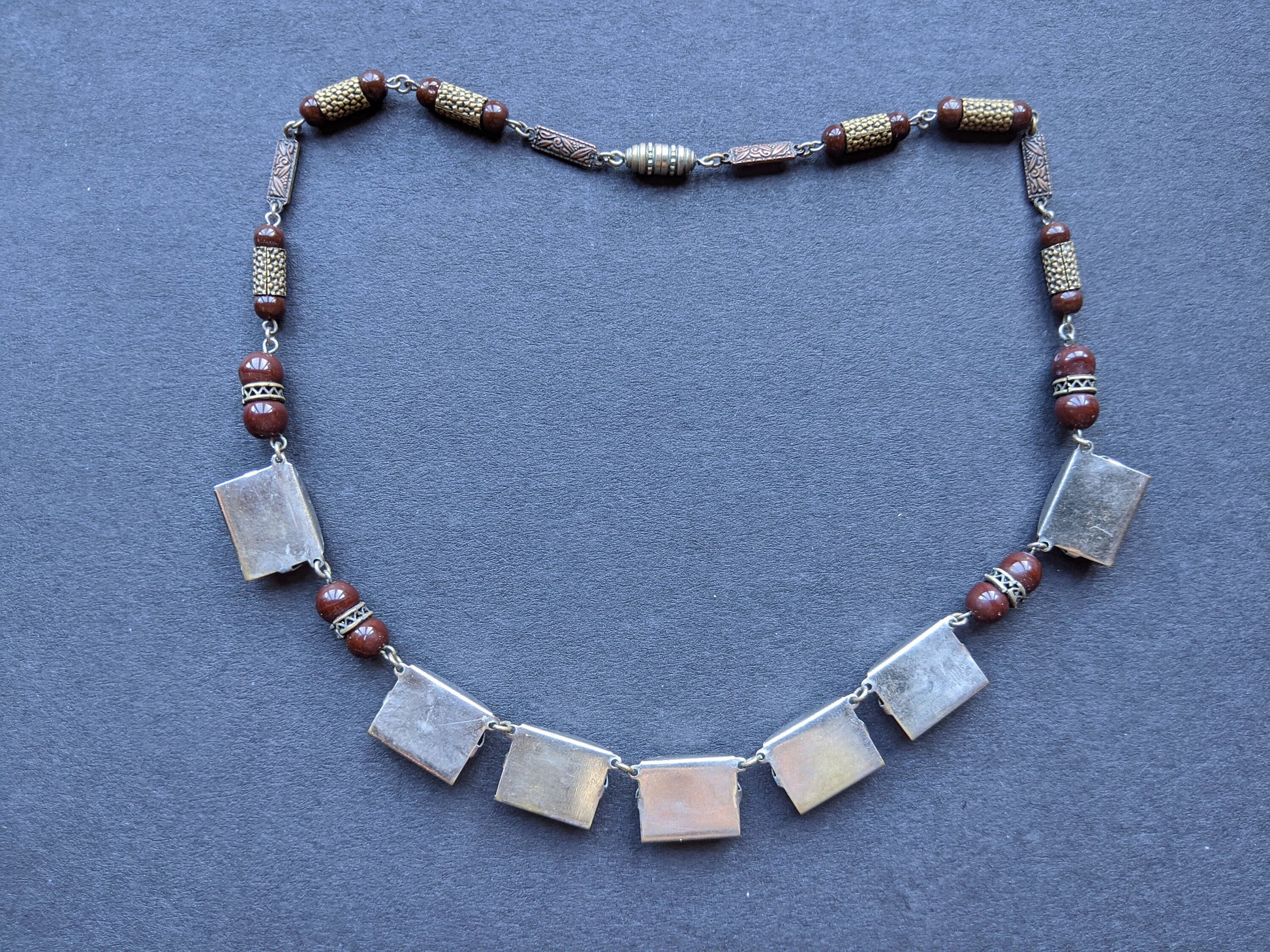 Vintage Art Deco machine age chrome, burgundy / brown glass geometric necklace with filigree detail
