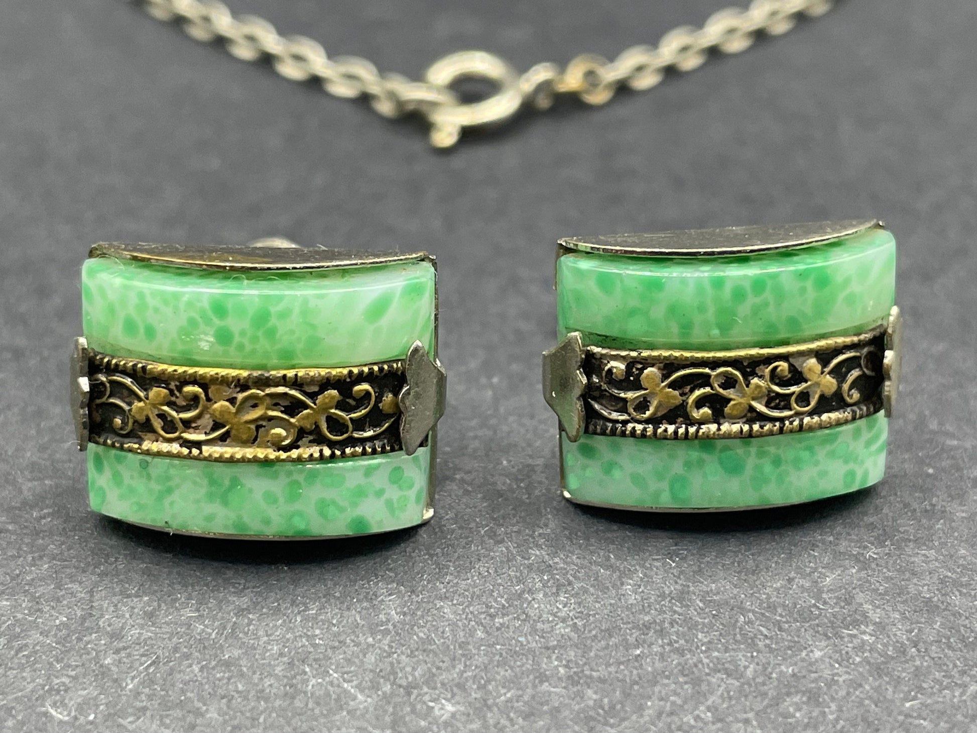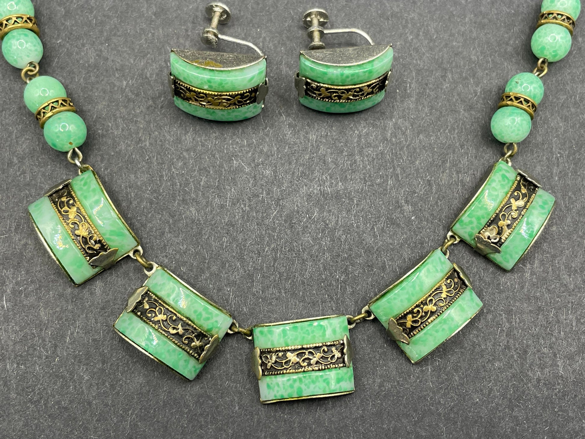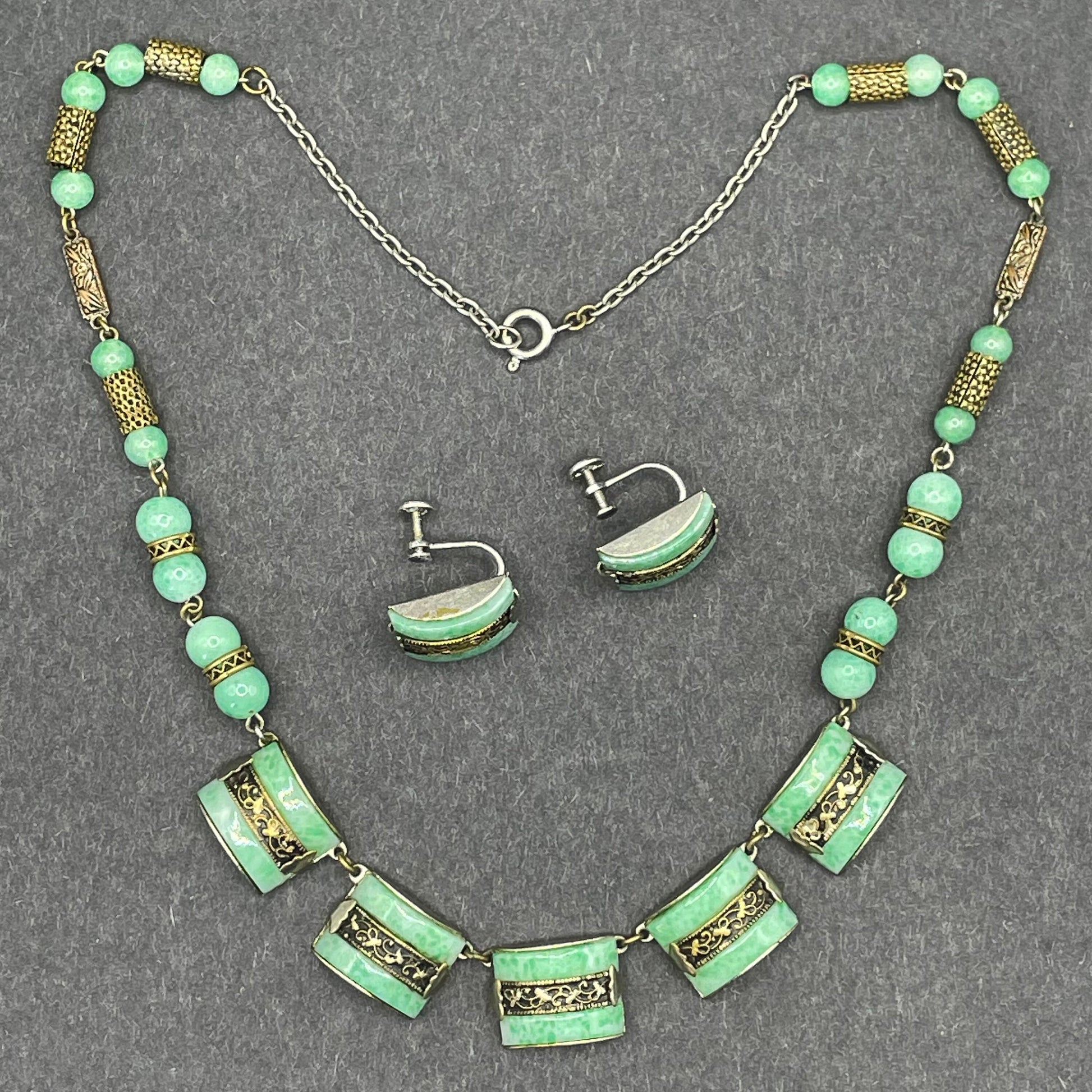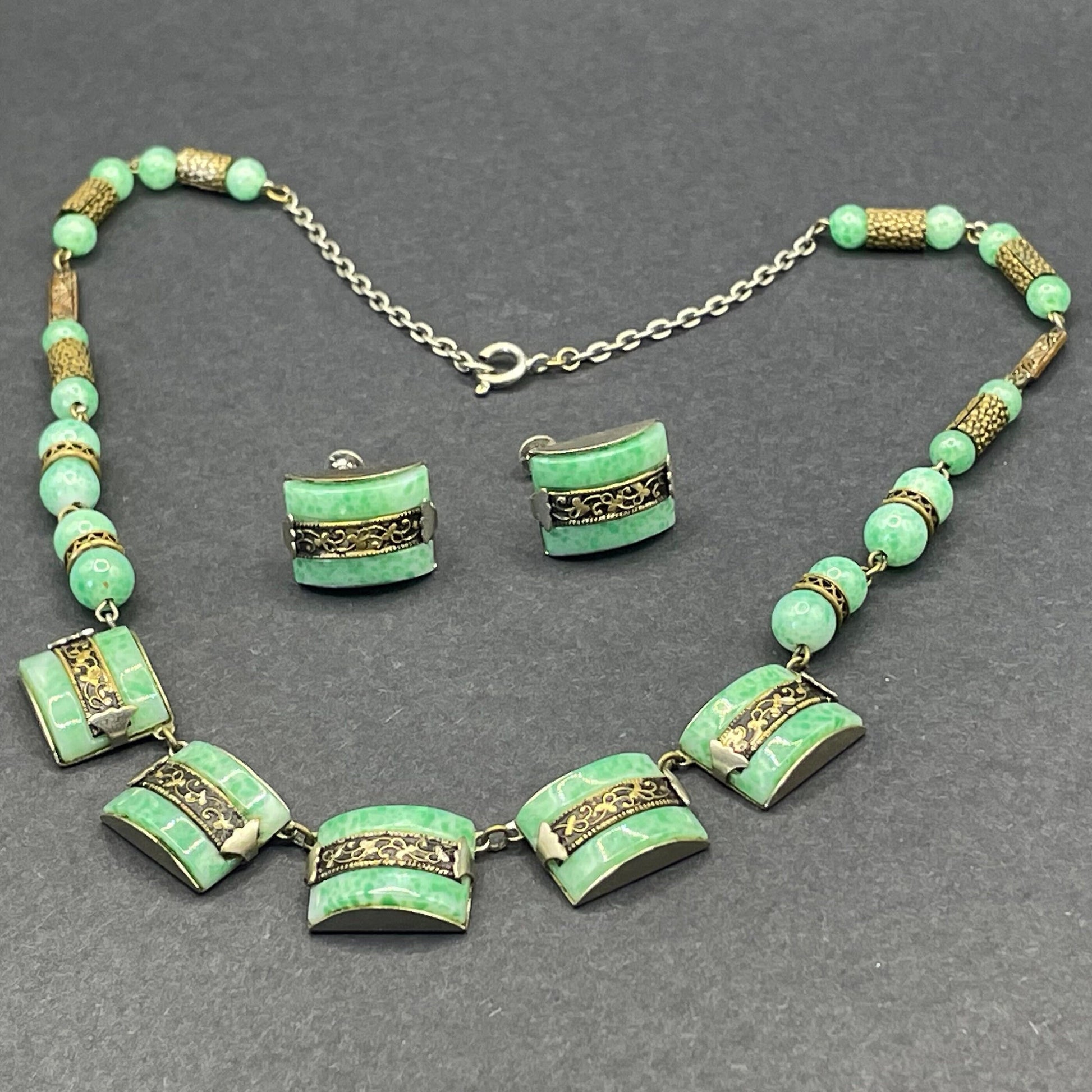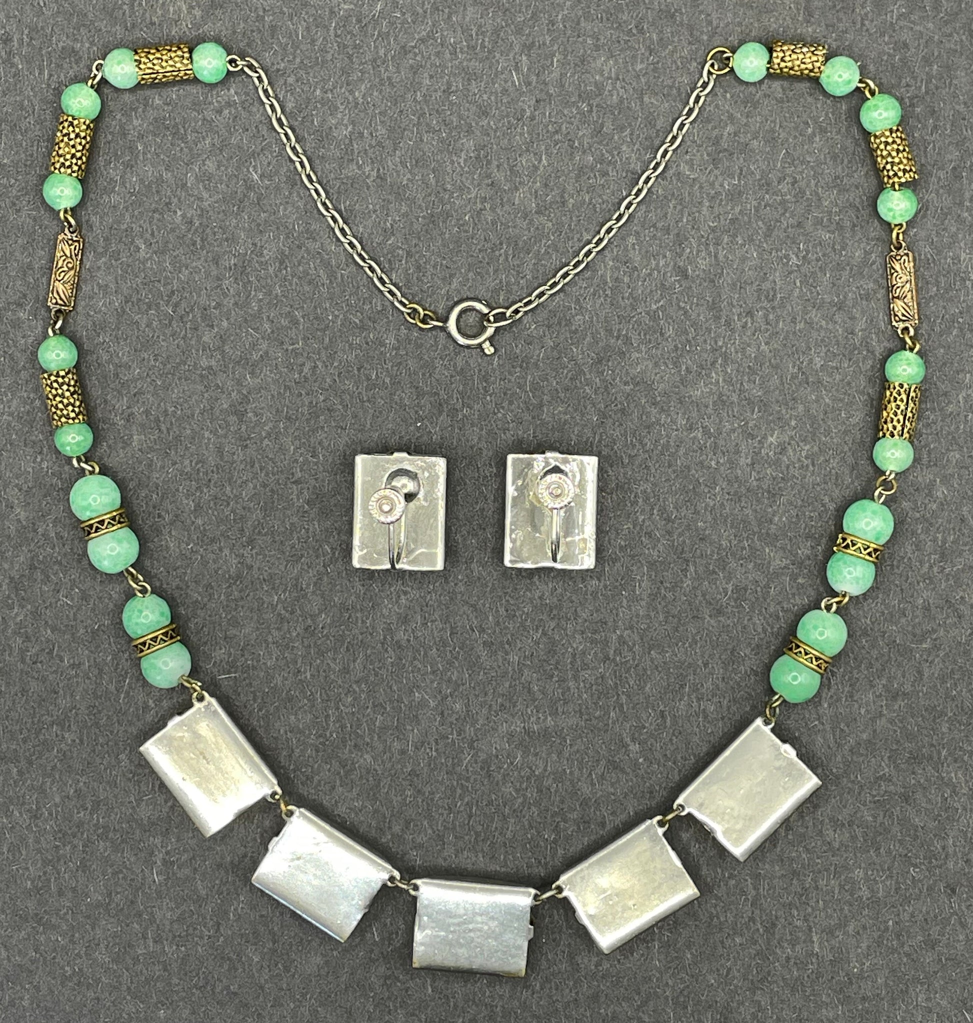 Vintage Art Deco machine age chrome silver tone and brass gold tone, green 'Peking' style glass necklace and screw back earrings set