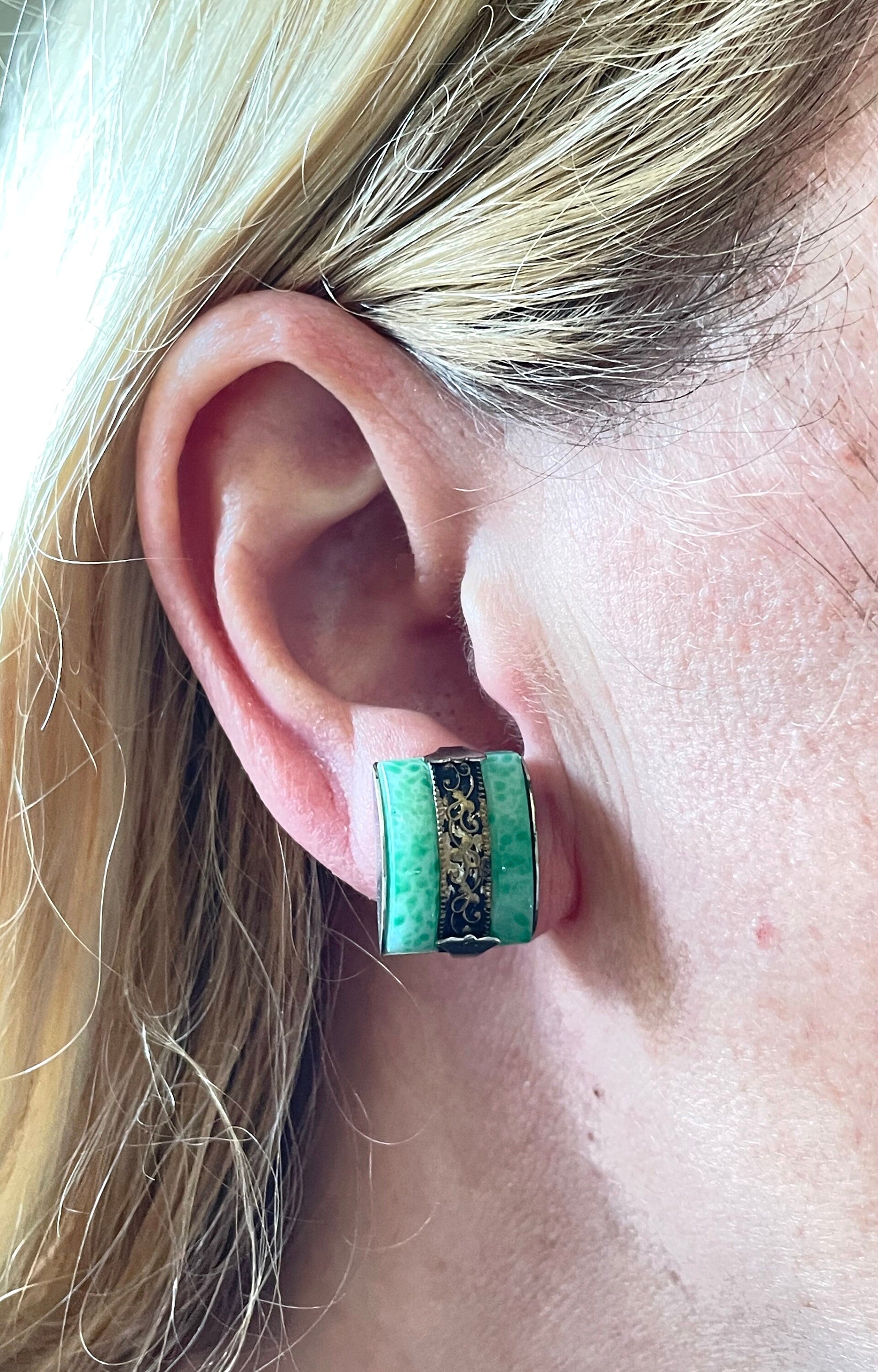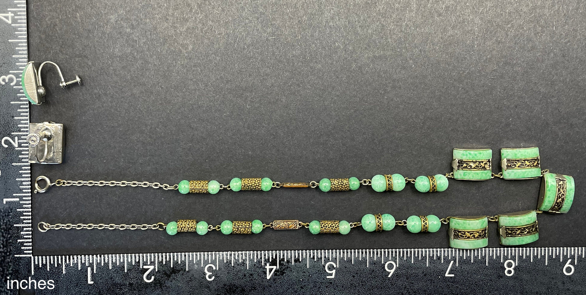 The necklace has a length of about 17.5 inches and fastens with a secure spring ring clasp. The earrings are a little over half an inch long and fasten with antique screw backs (so no piercing is required). The set is in very good vintage condition. I also have a similar necklace listed with burgundy glass pieces instead of the green.