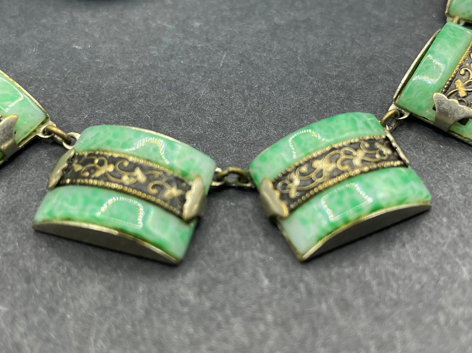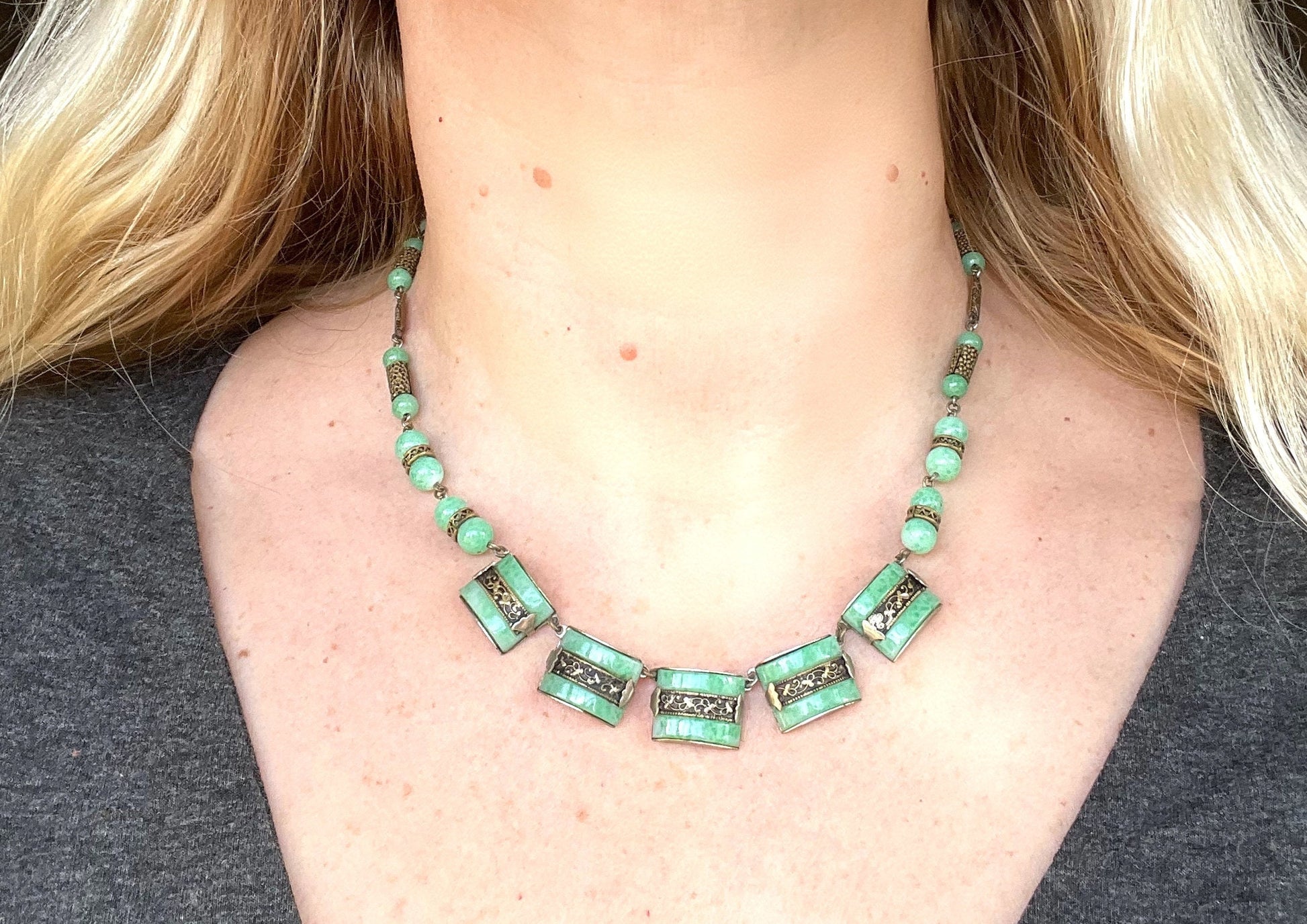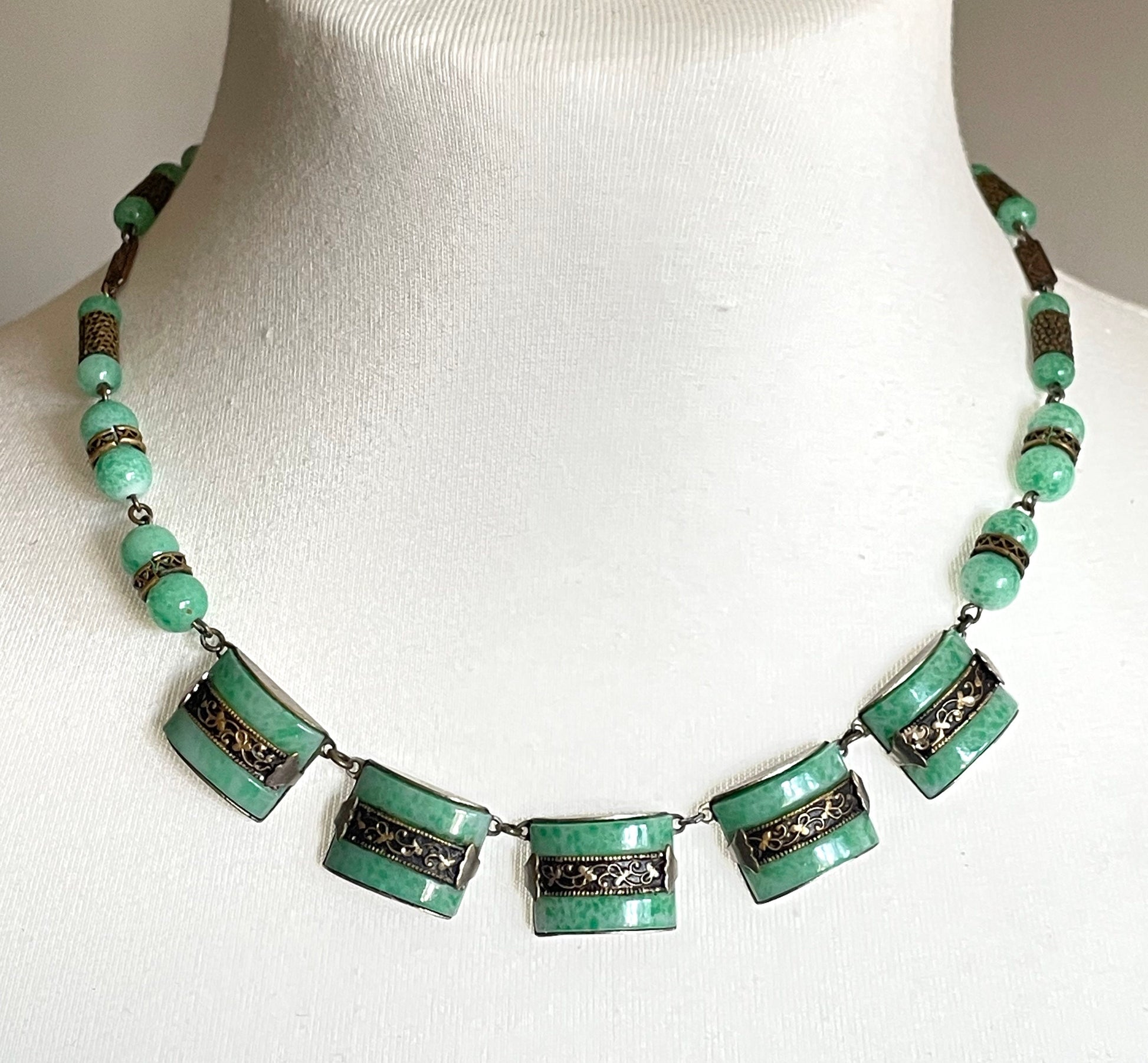 The design has classic Art Deco streamlined lines, with beautiful silver and gold tone metal work detailing. The glass colour is a stunning mottled green - the glass pieces and beads are 'Peking' style glass.