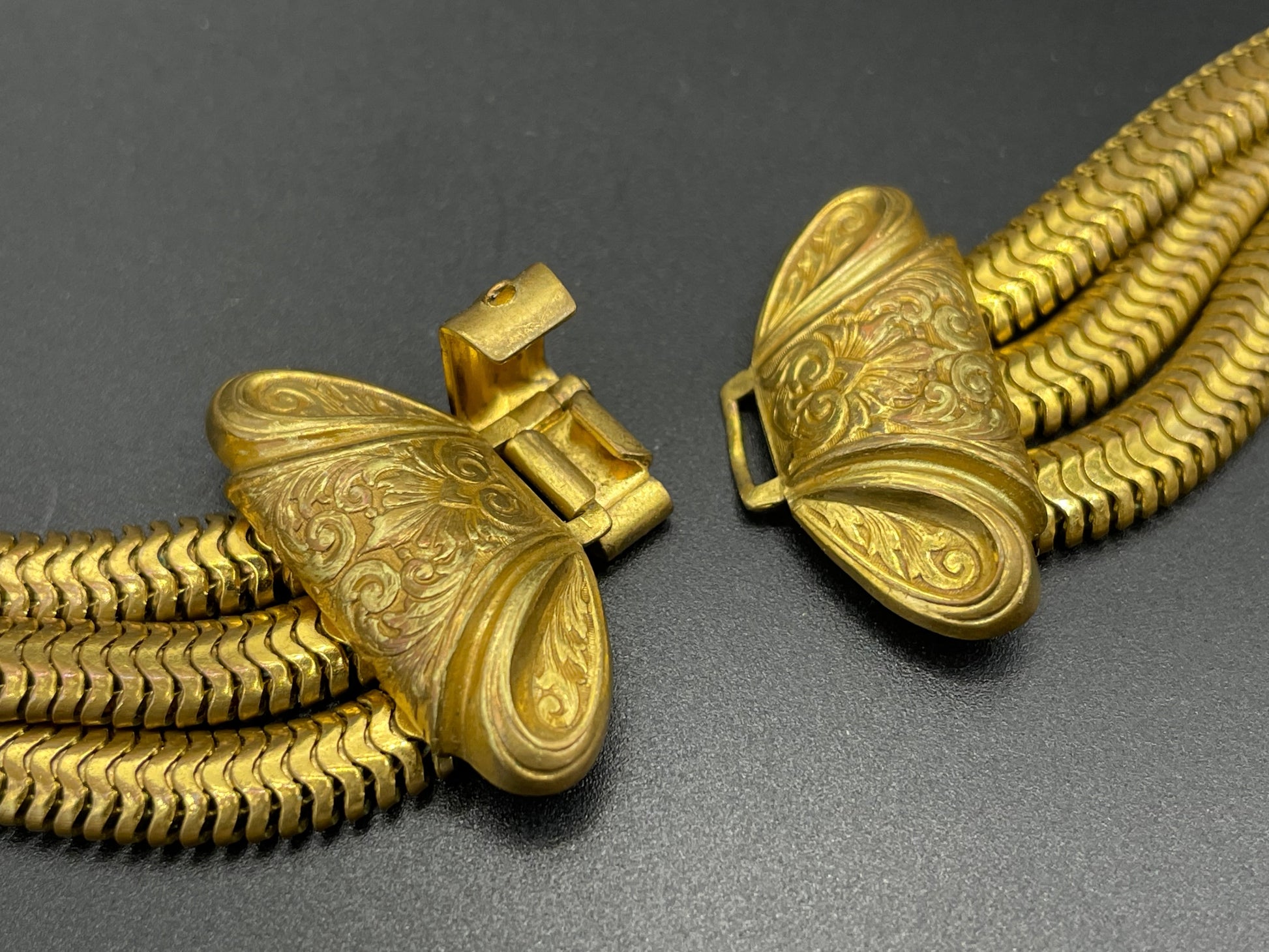Vintage Art Deco machine age repousse bow clasp triple strand thick gold tone snake chain necklace