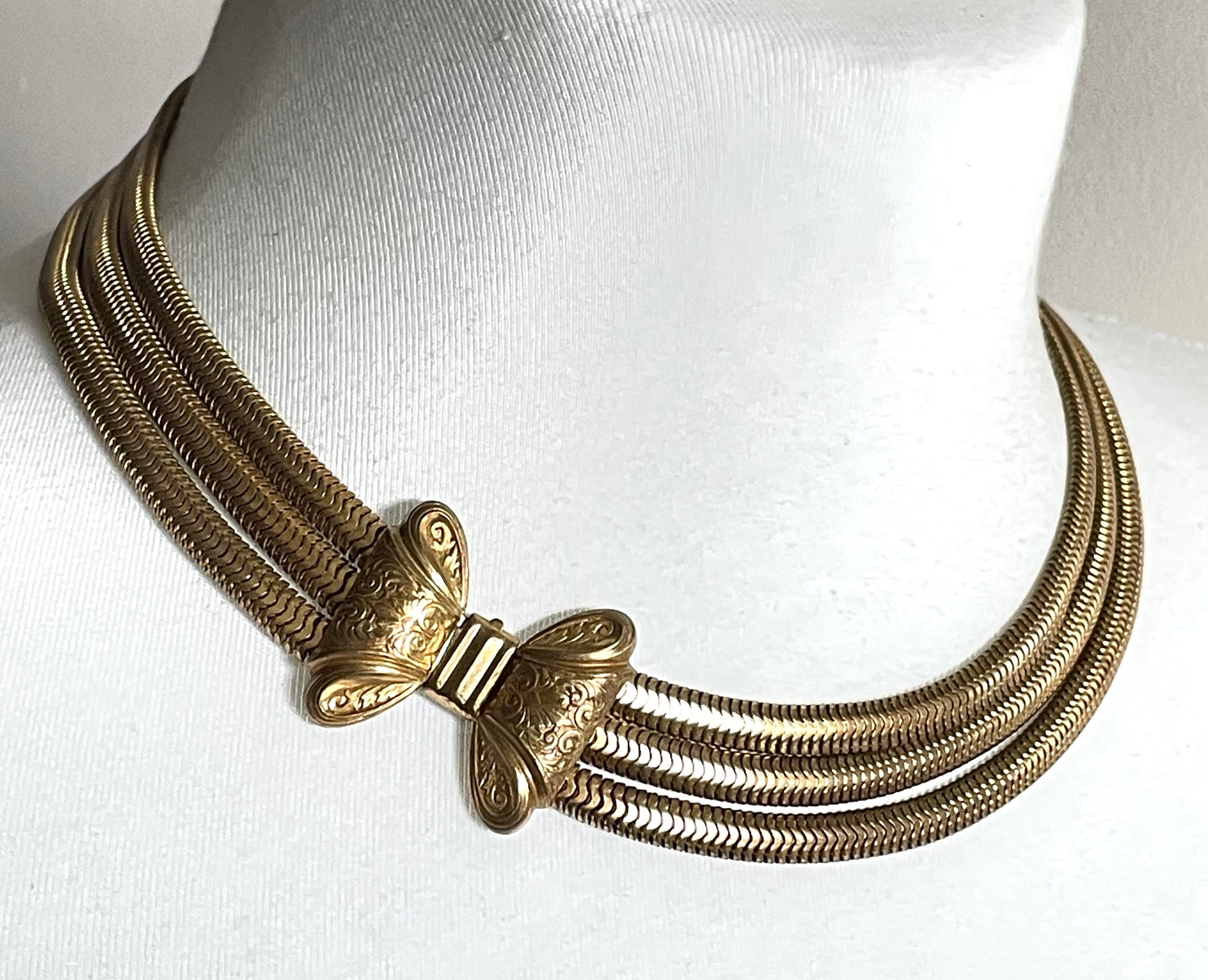 Vintage triple stranded flat snake chain necklace in yellow gold tone with a fabulous moulded gold tone bow clasp. The centre of the bow lifts up and the two ends can unhook - it is a secure, hinged clip that clicks down firmly.