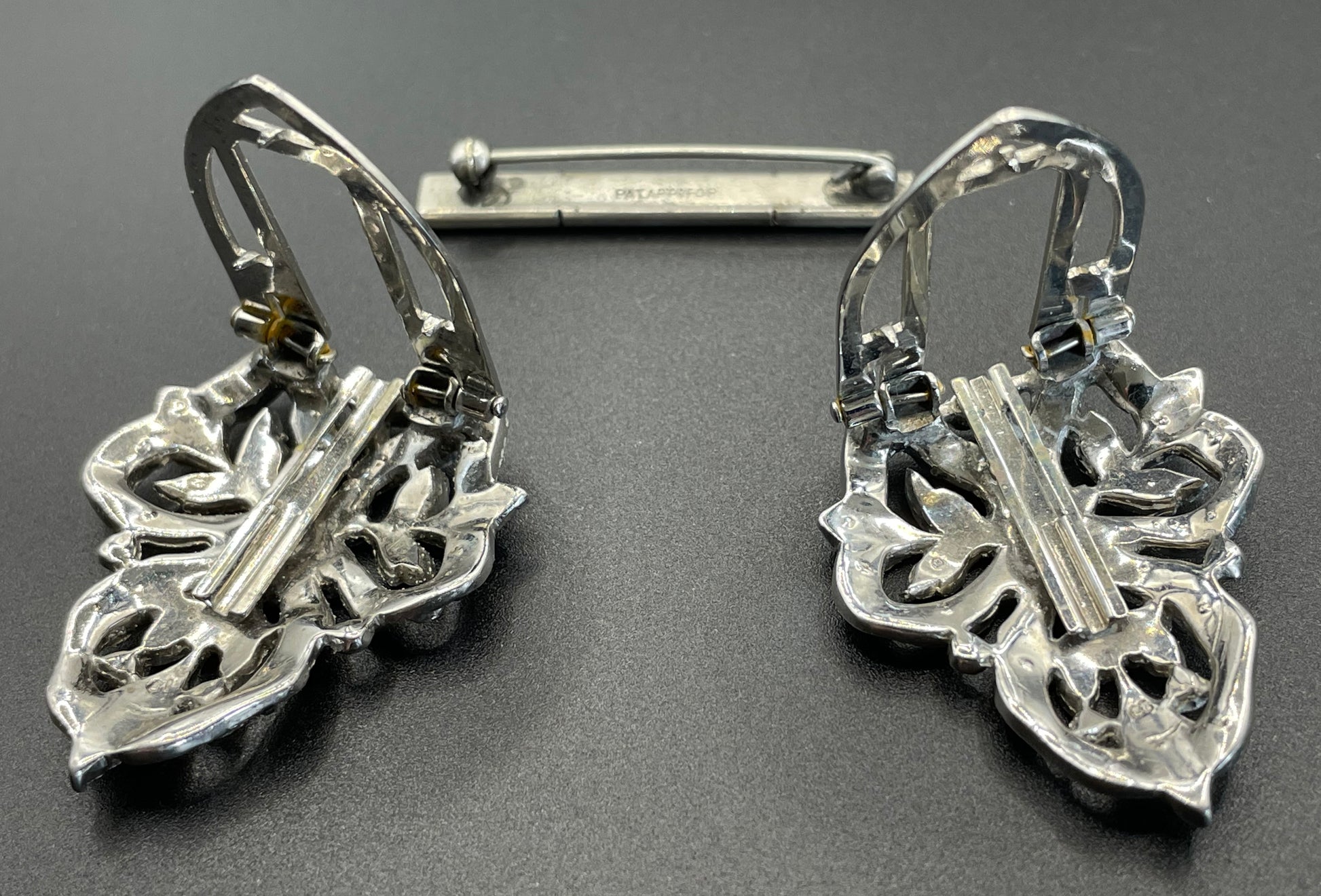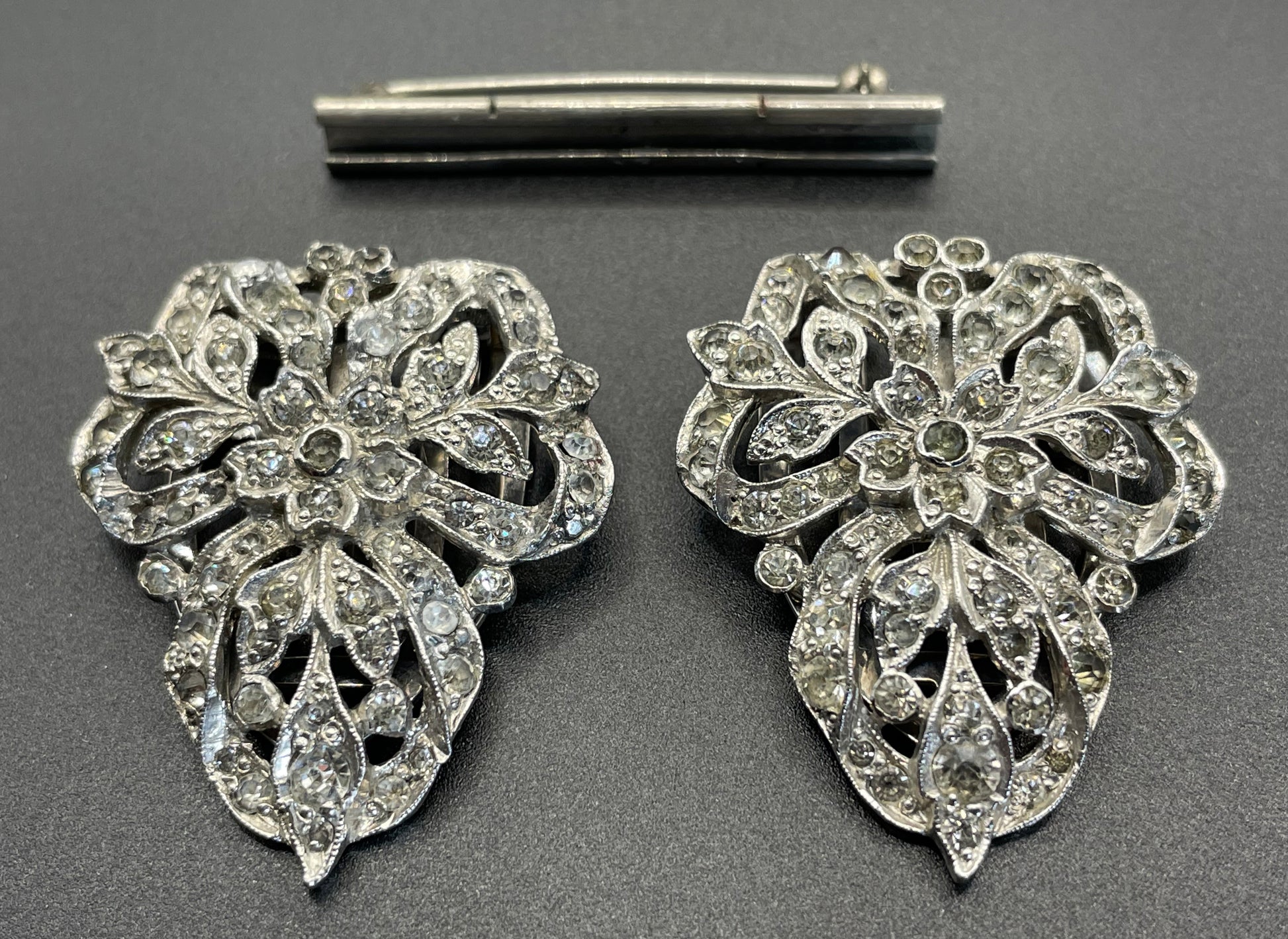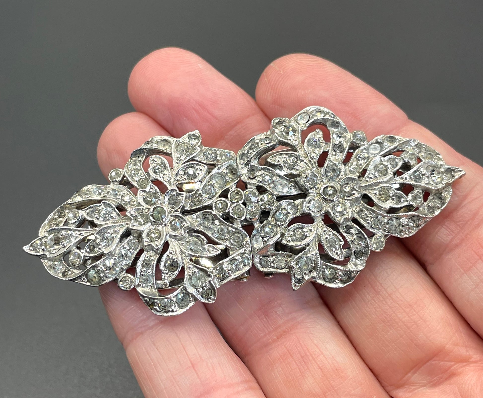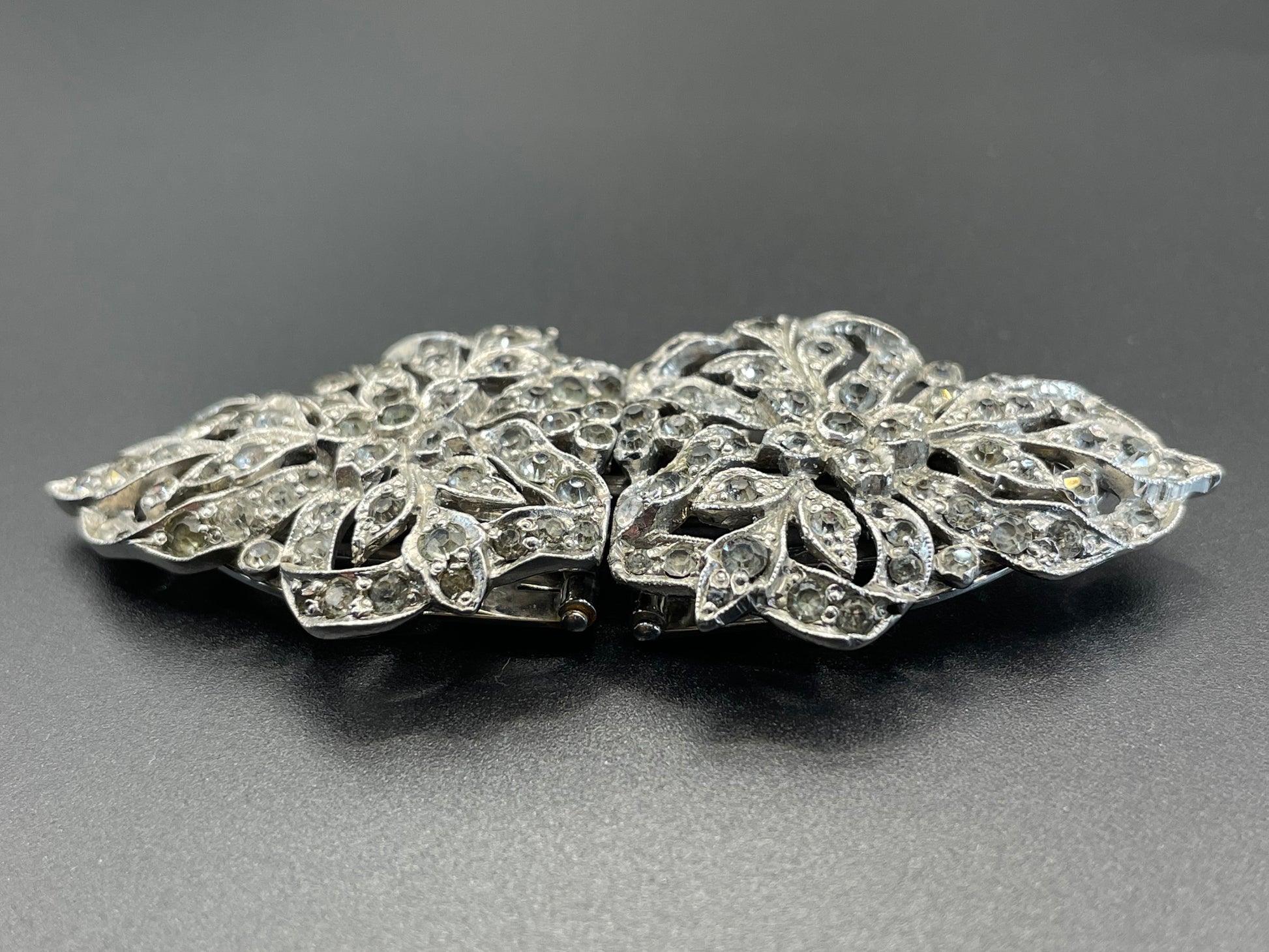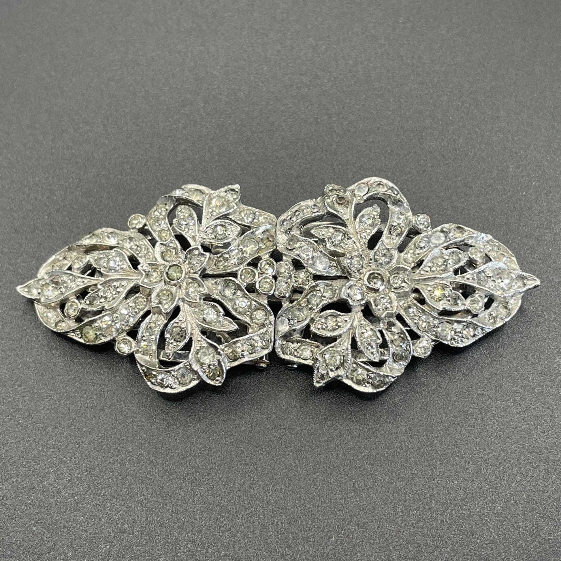 Beautiful vintage Art Deco paste duette in silver tone with lovely romantic floral design. This is a cleverly constructed piece in which two identical dress clips fit onto a brooch frame. It can be dismantled so that you have two dress pins that can be worn on clothing, shoes, bags etc.