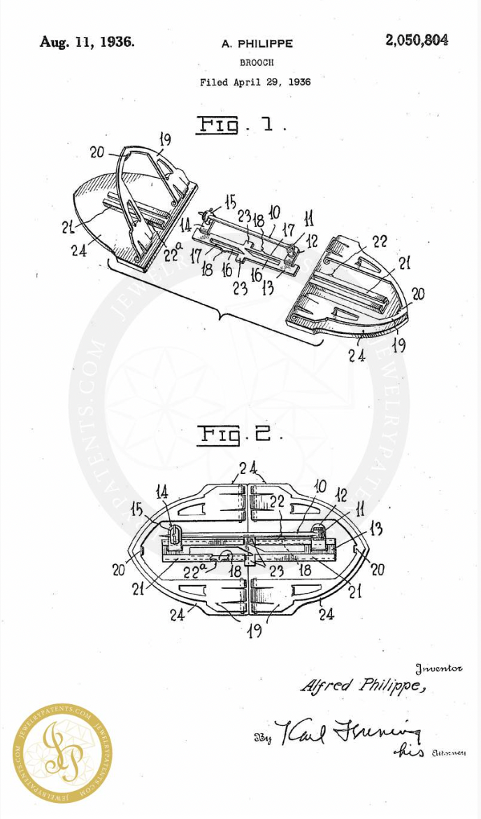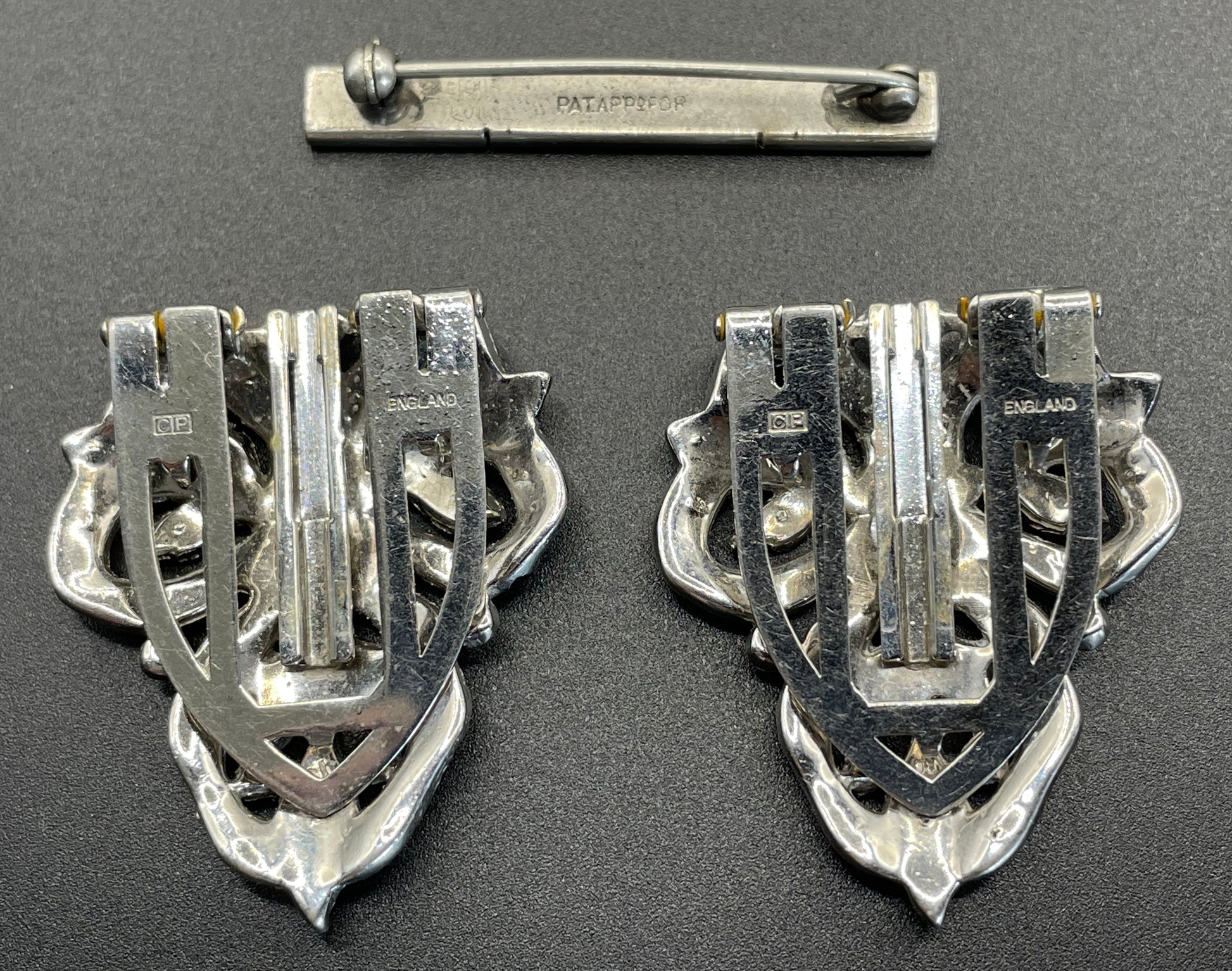 This is a particularly nice example - the two sides are identical. This piece is signed 'CP' for Ciro Pearls - a UK company that had pieces made for them by the Trifari company. So I can see this piece uses the patented Trifari 'Clipmate' mechanism where the clips slide onto a rectangular bar with smooth channels. The last picture shows the patent application from April 1936.