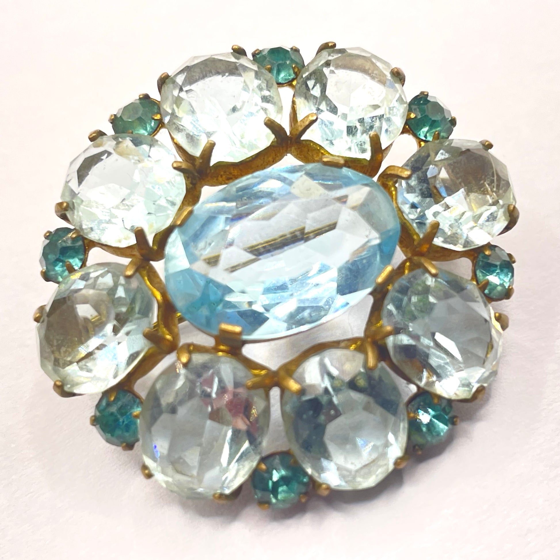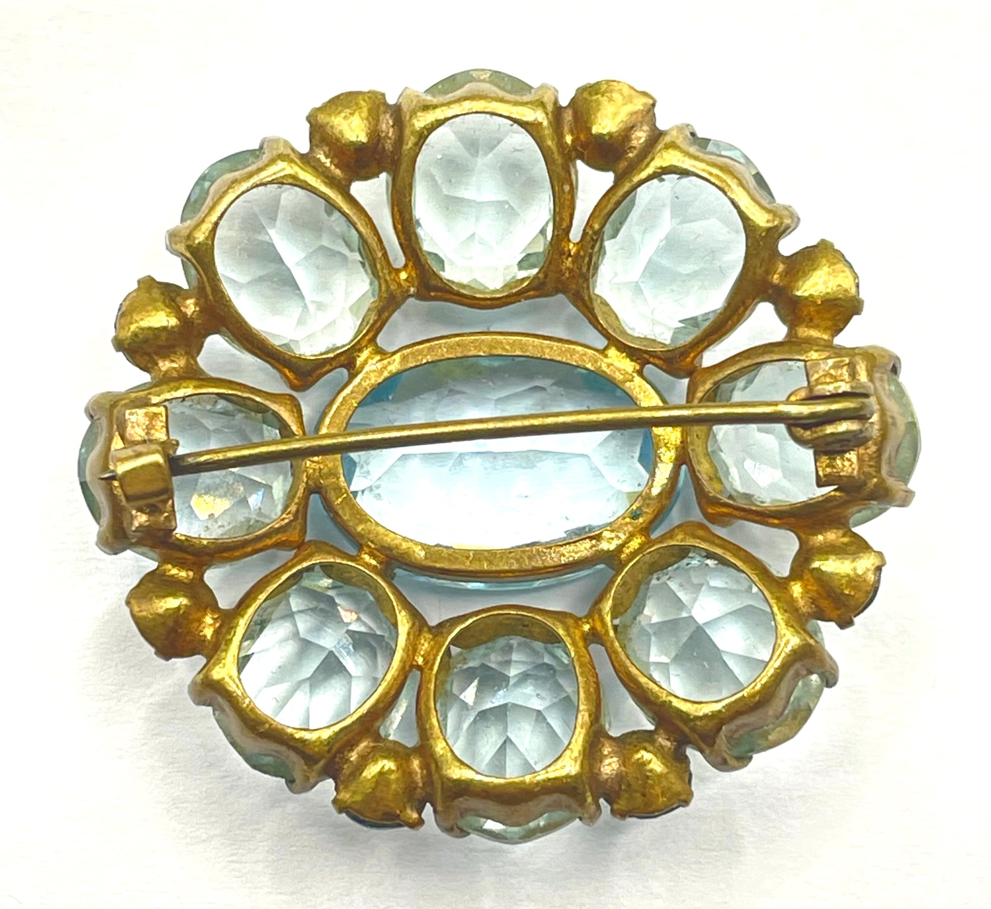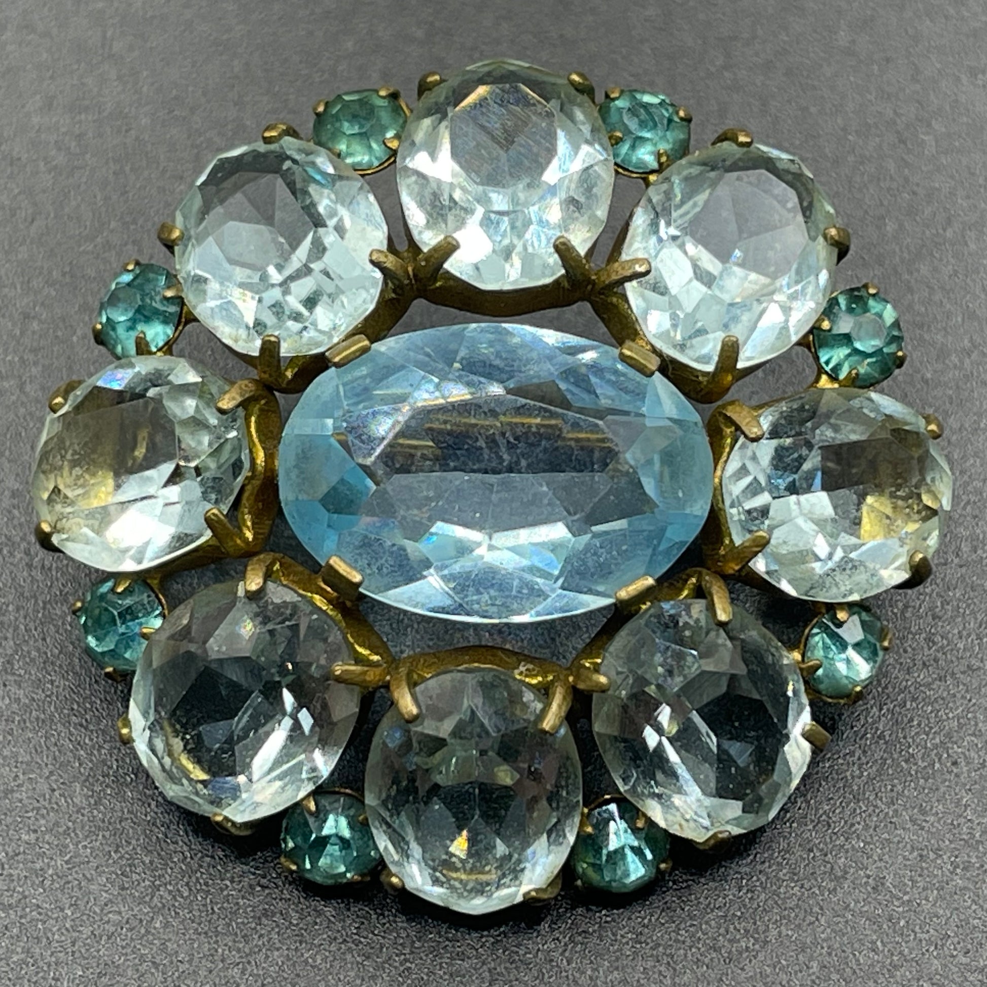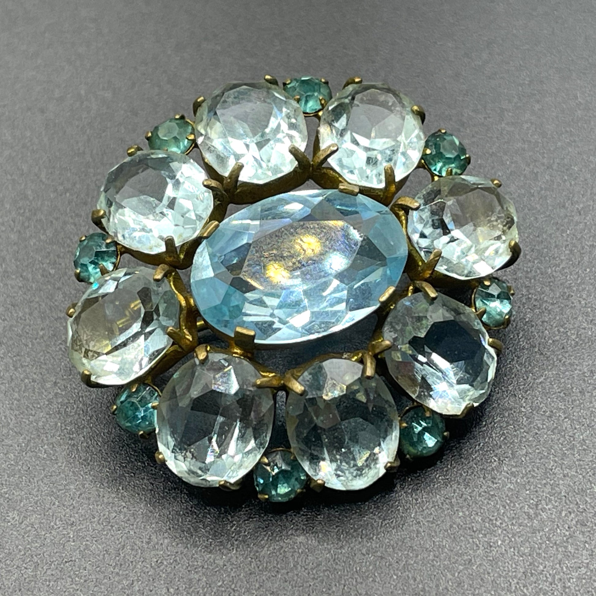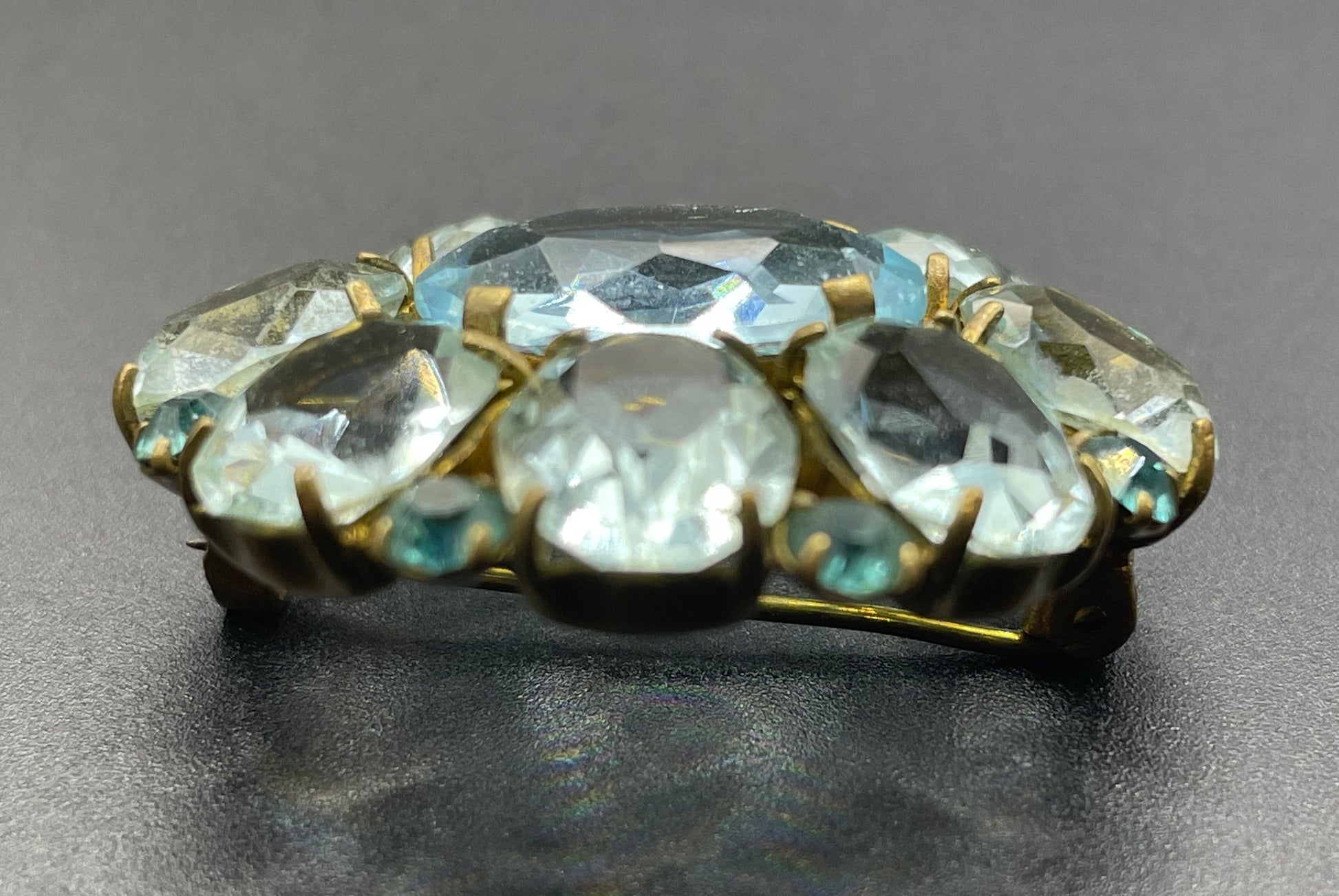 Vintage Art Deco two shades of very pale aqua blue glass rhinestone, open-backed, gold tone brooch pin, stunning colour