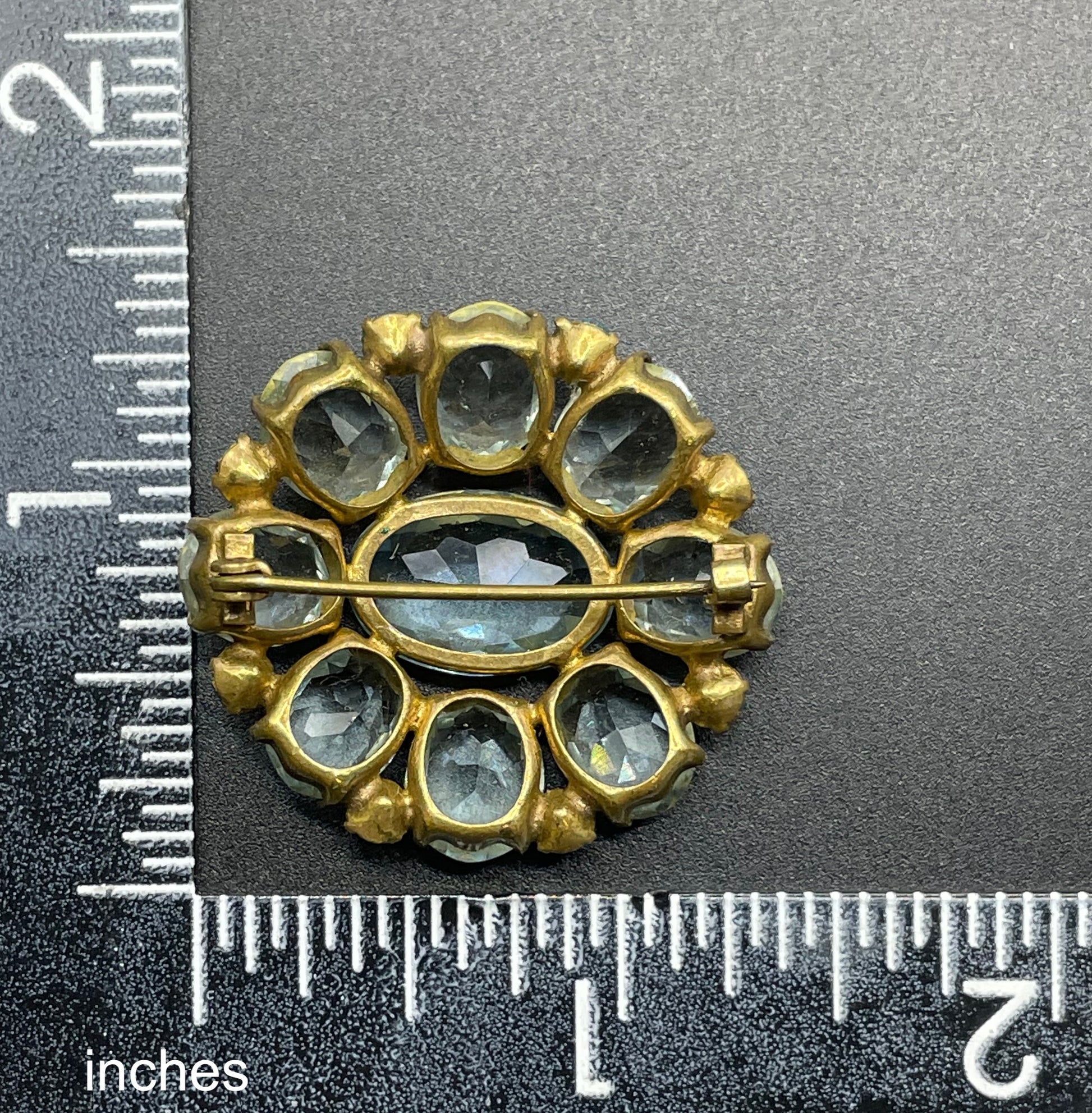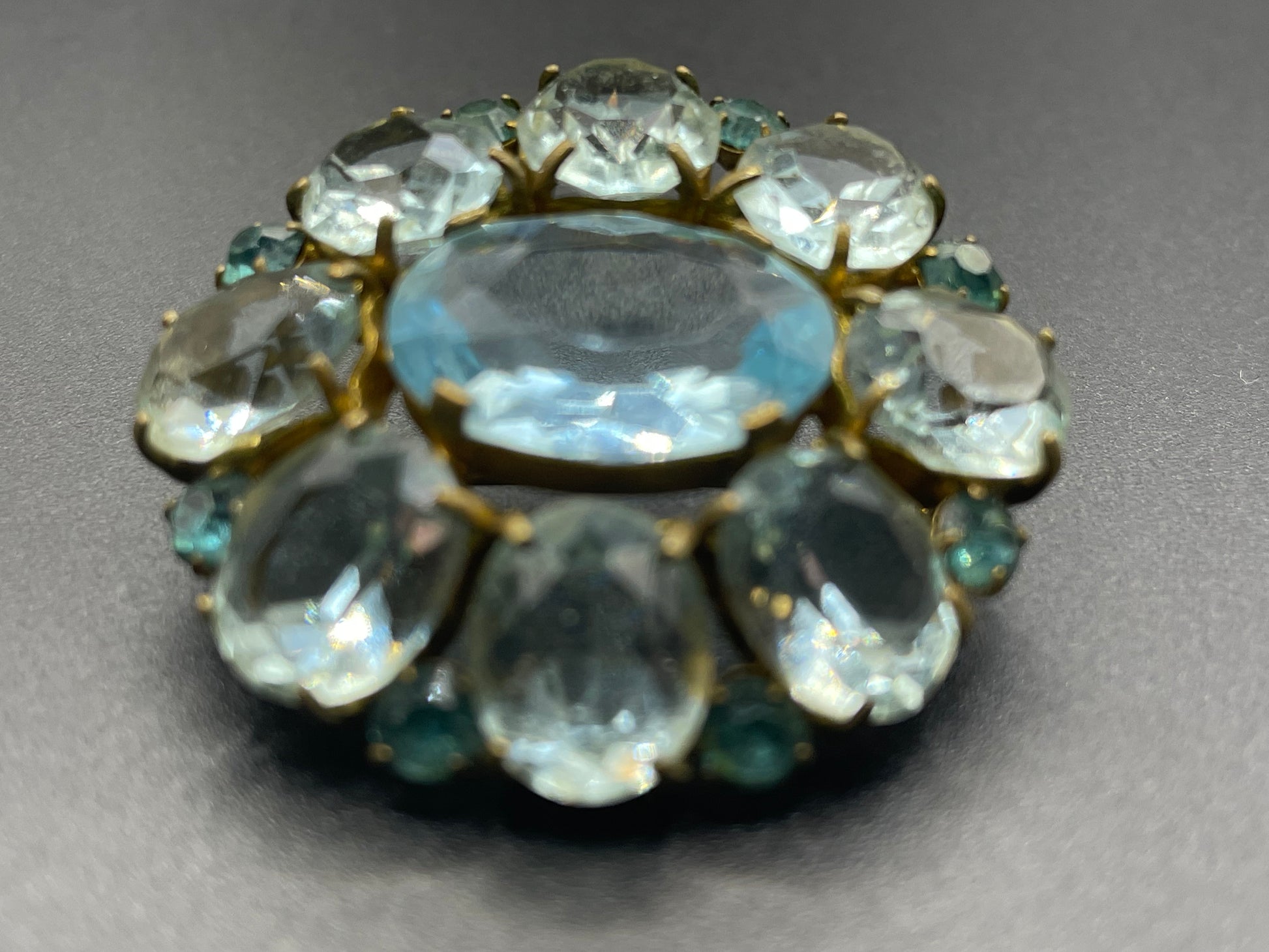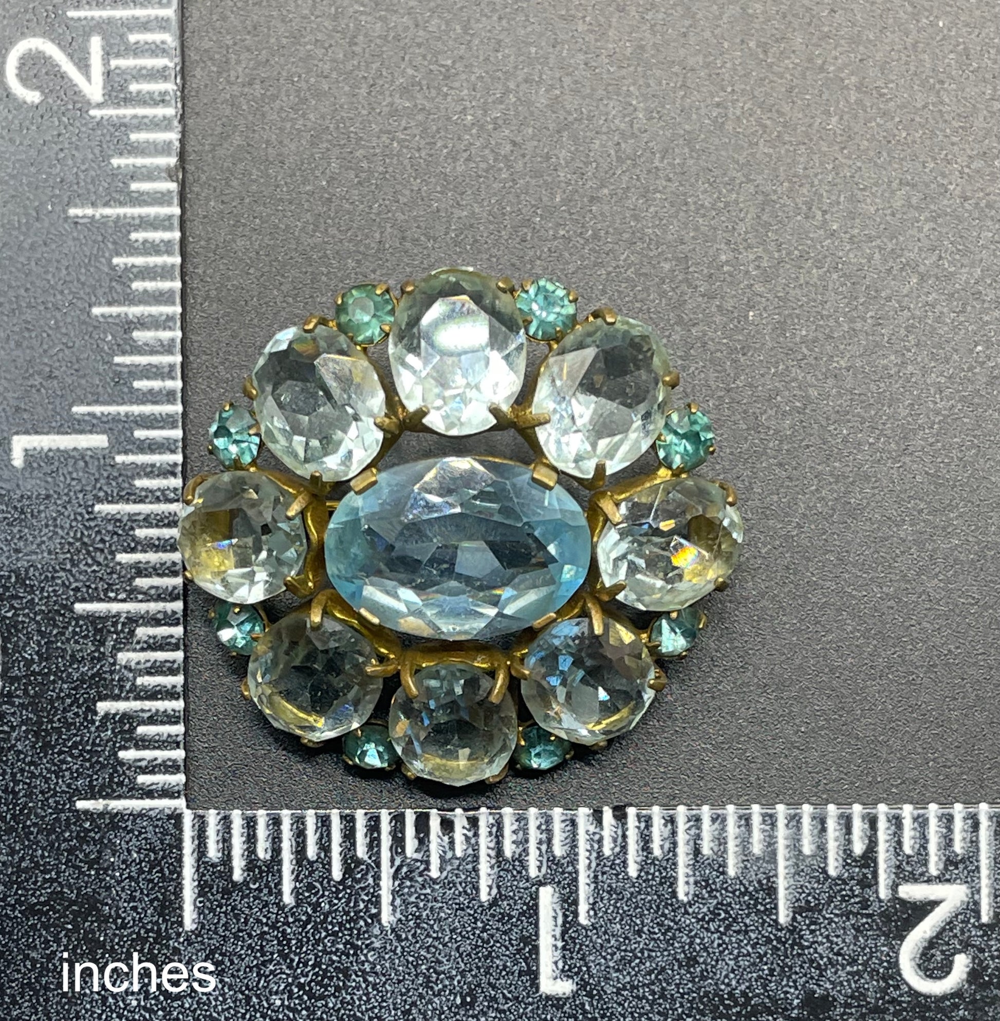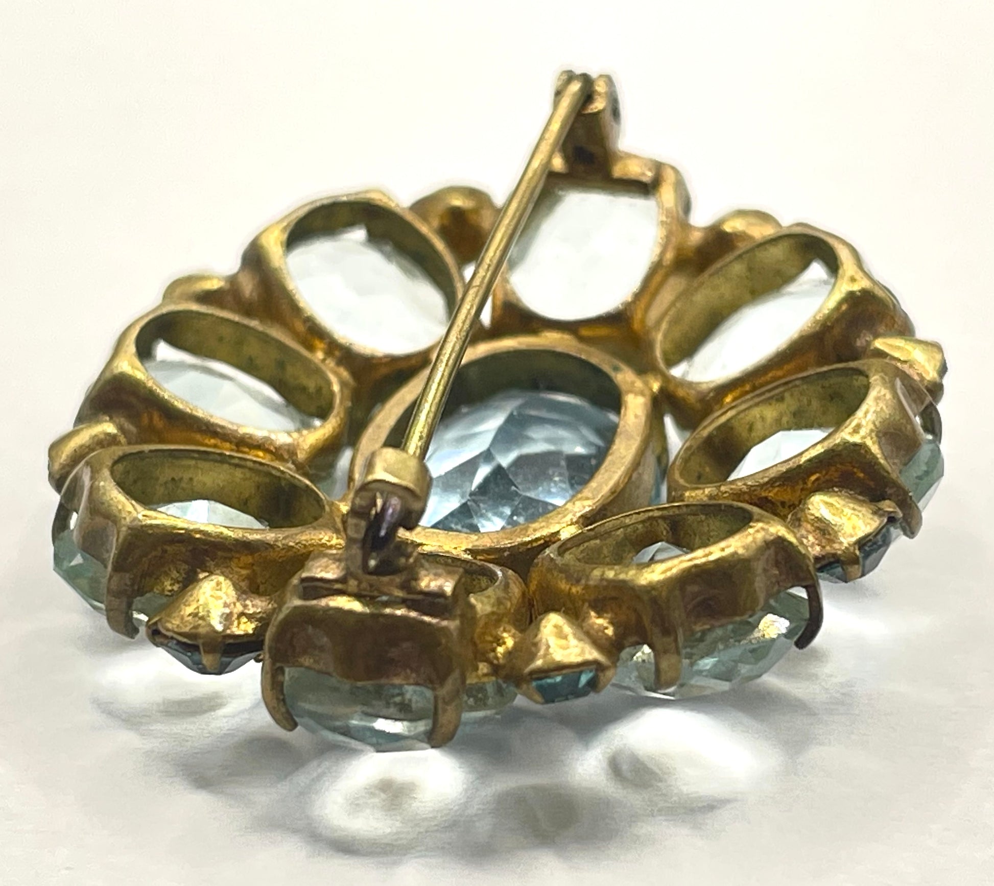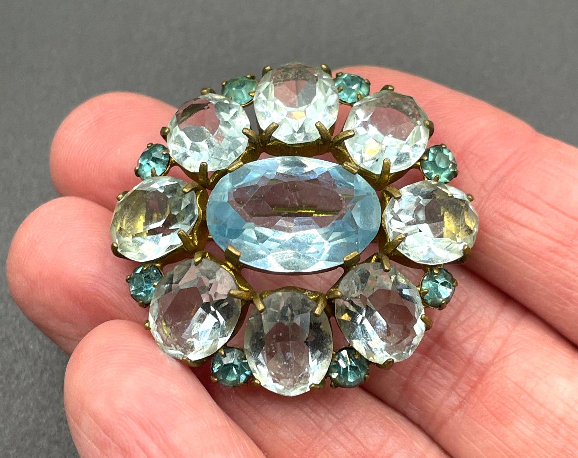 Vintage Art Deco two shades of very pale aqua blue glass rhinestone, open-backed, gold tone brooch pin, stunning colour