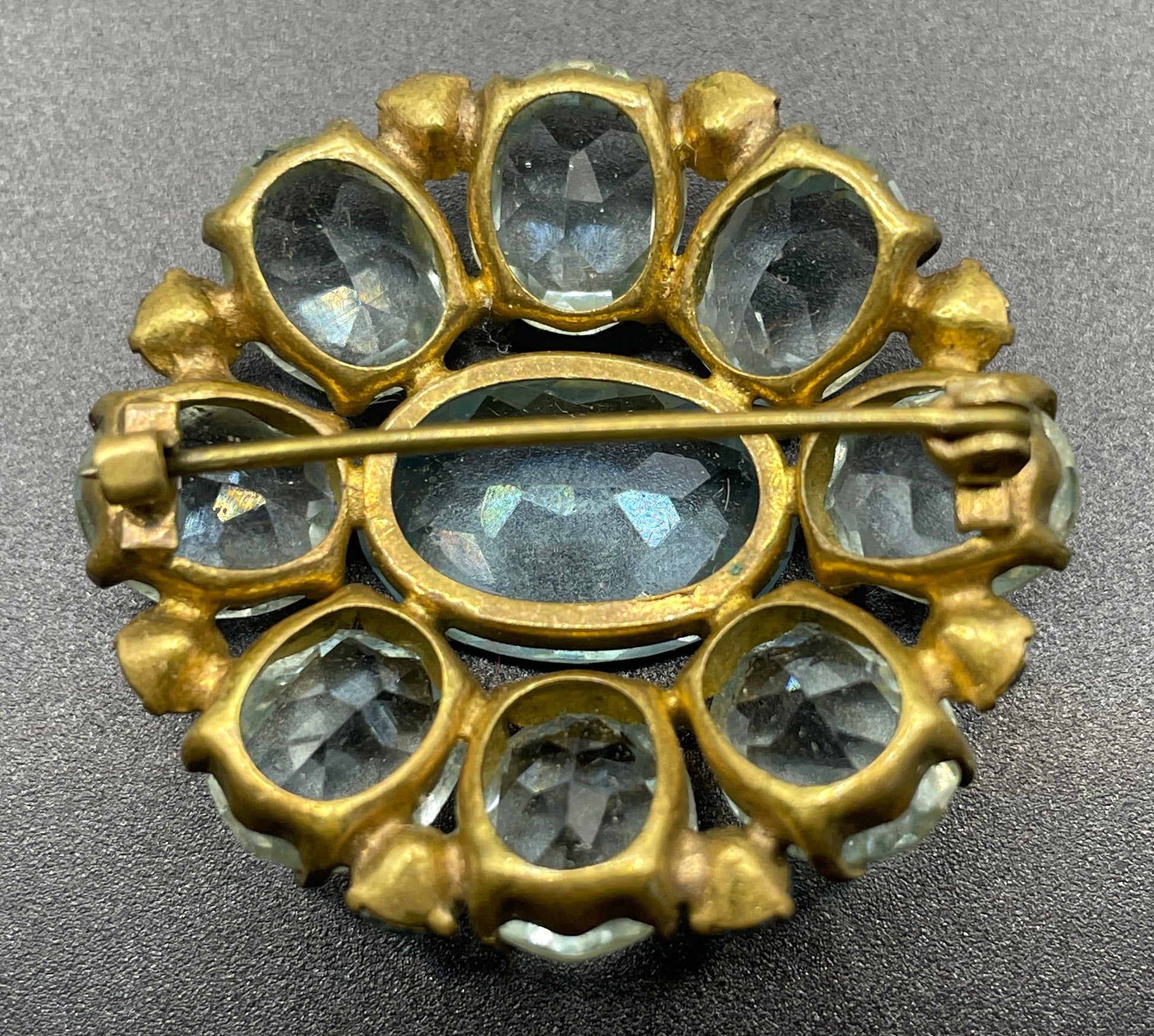 Stunning Czech rhinestone Art Deco brooch with remarkable pale blue large oval rhinestones and darker chaton set blue rhinestones claw / prong set in antique gold tone. Characteristic Czech construction and fixings for the period, fastening with a pin and old style C clasp.