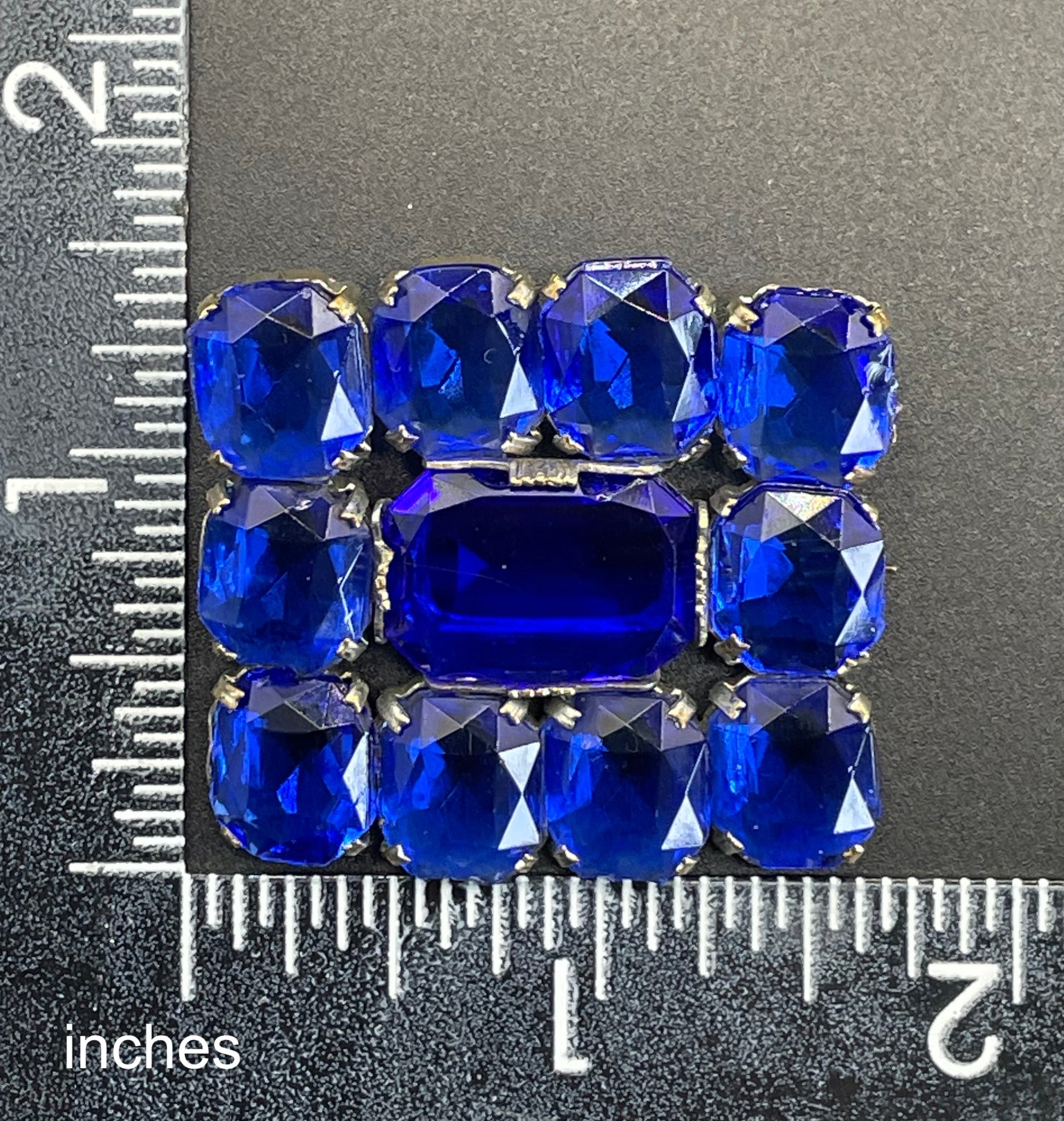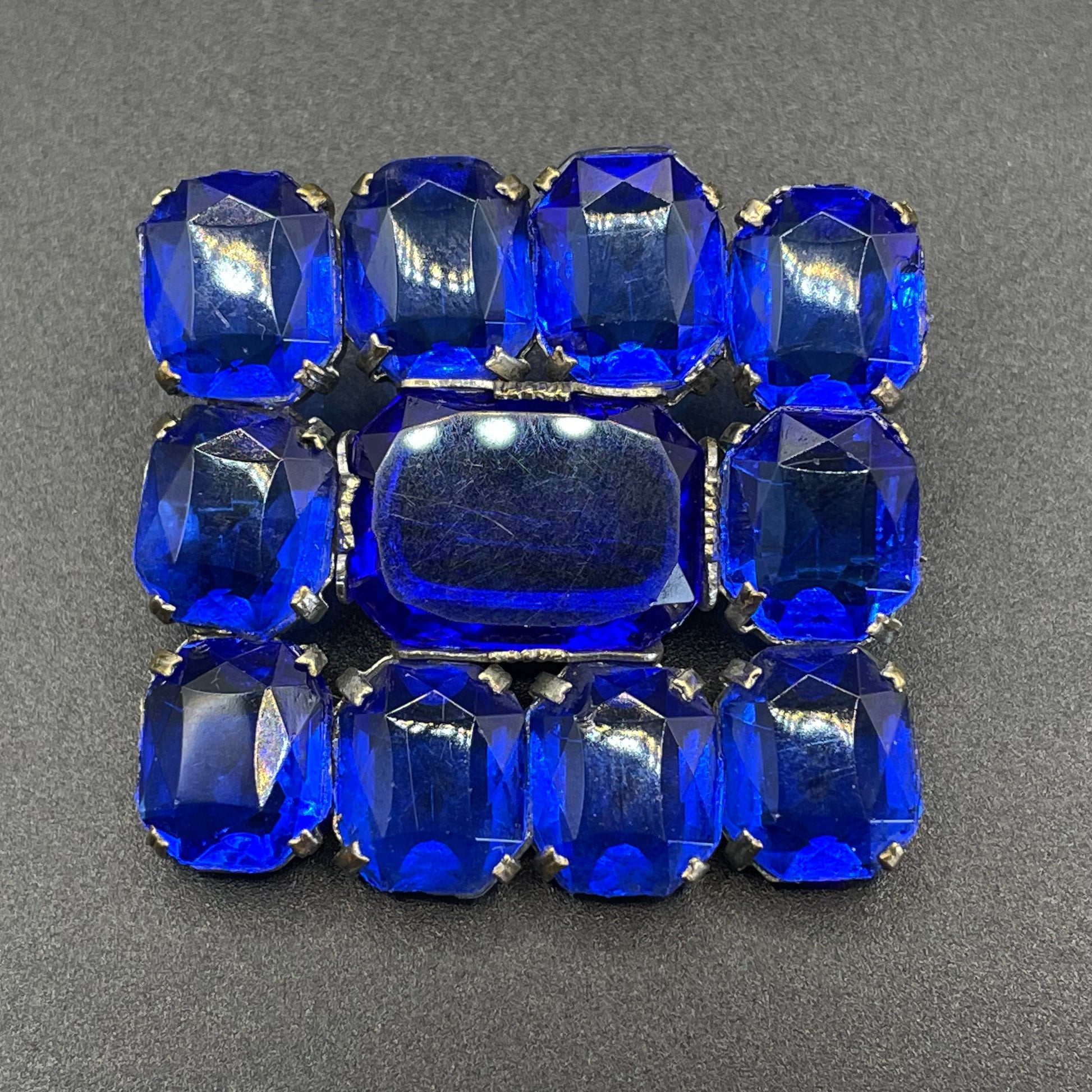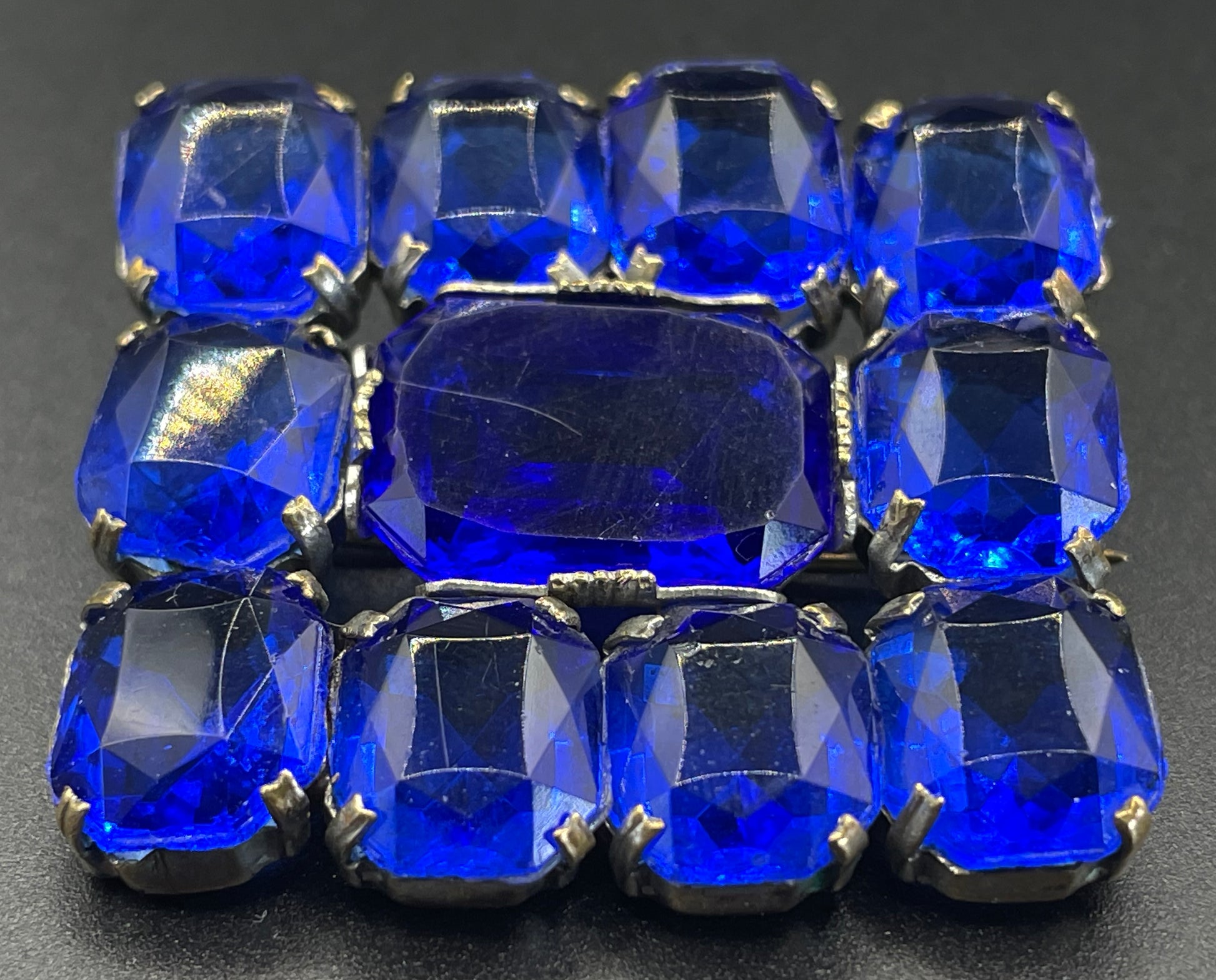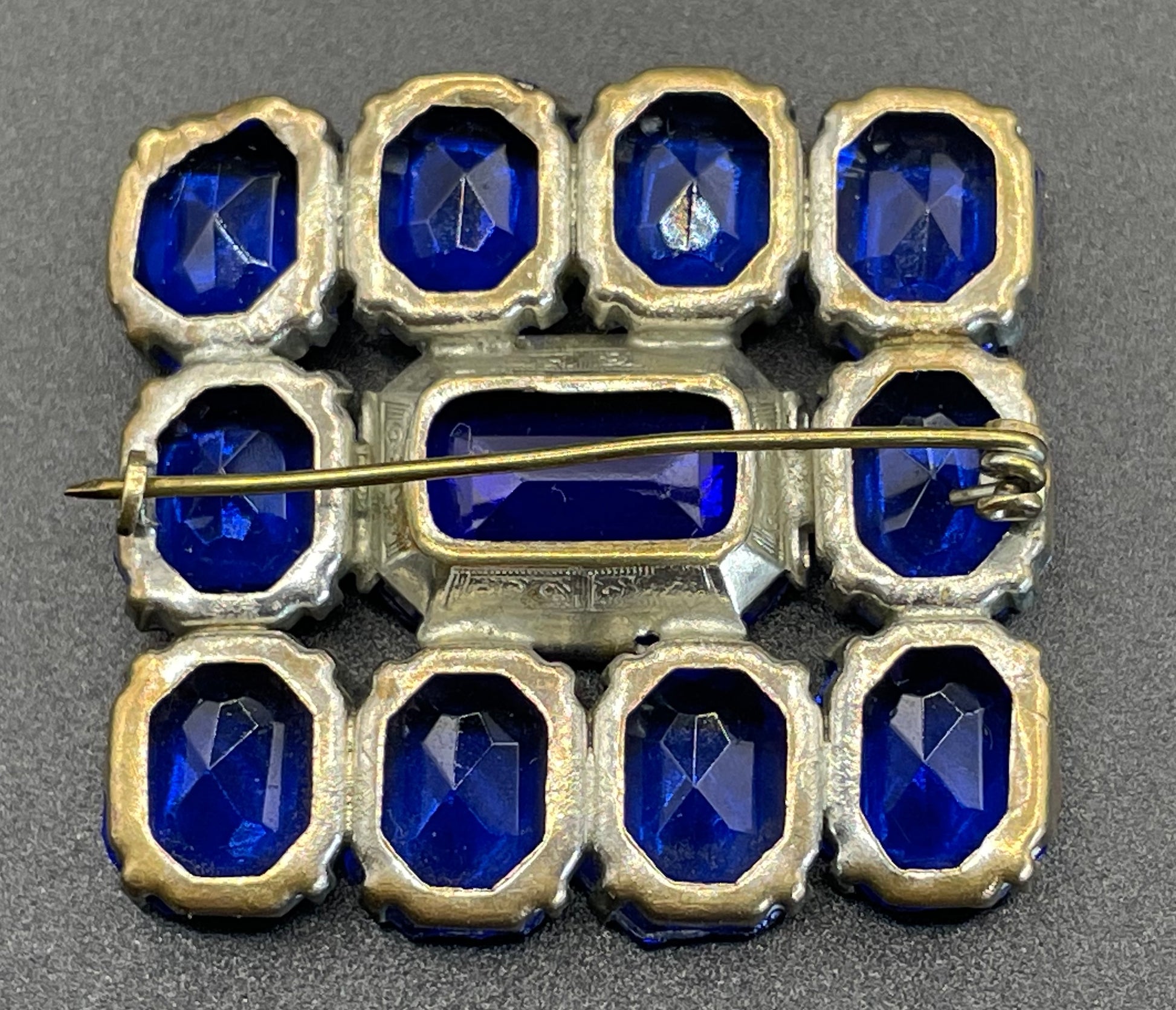 Vintage Art Deco vibrant sapphire blue crystal brooch, open-backed baguette cut rectangular glass rhinestones