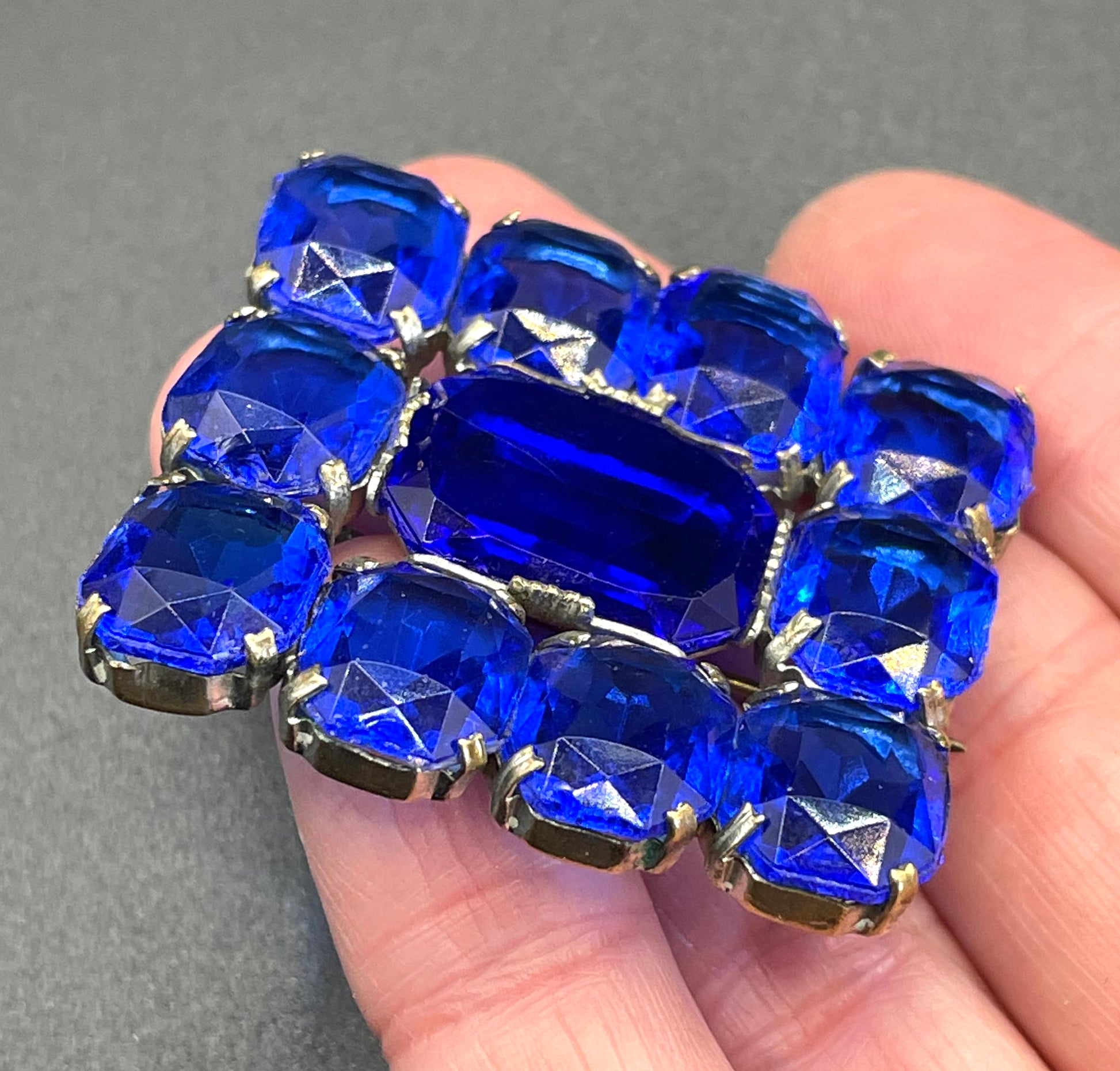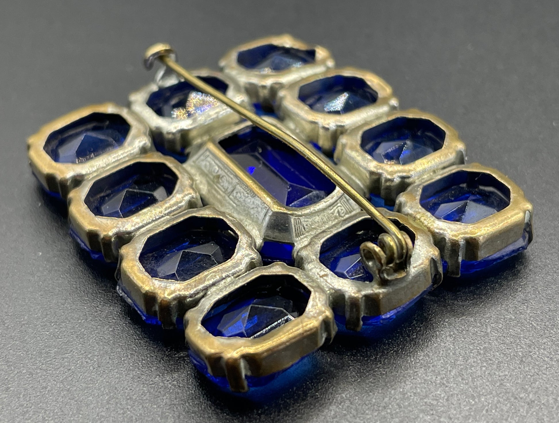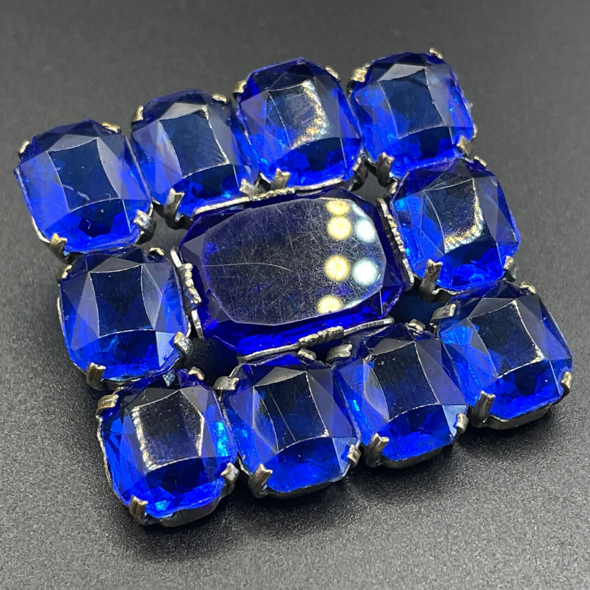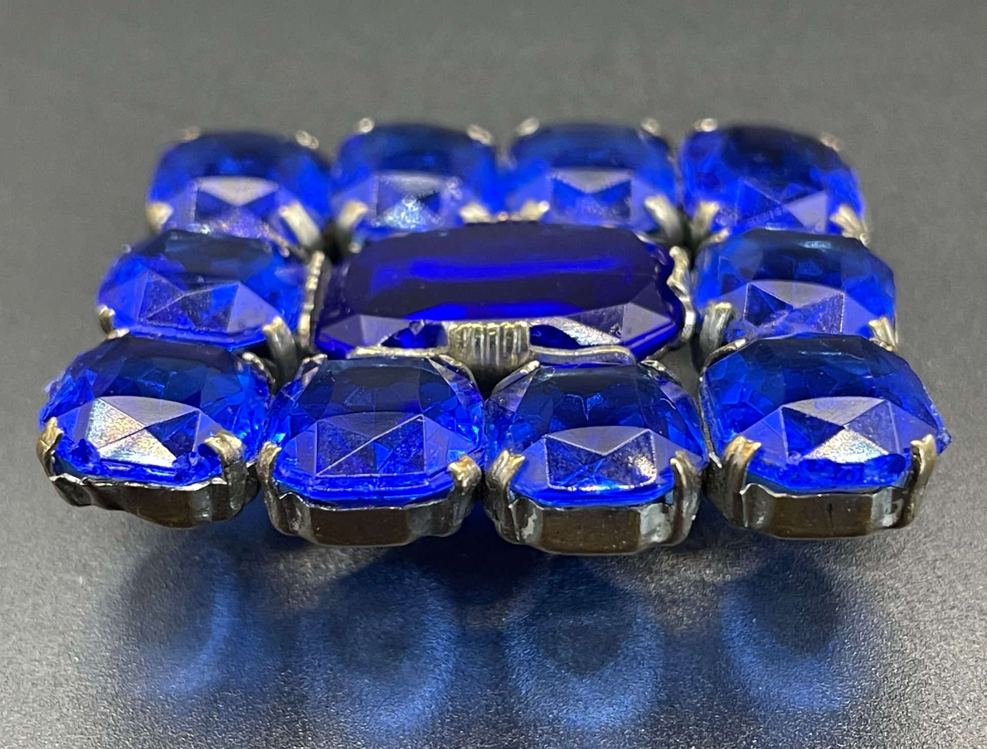 Vintage Art Deco vibrant sapphire blue crystal brooch, open-backed baguette cut rectangular glass rhinestones