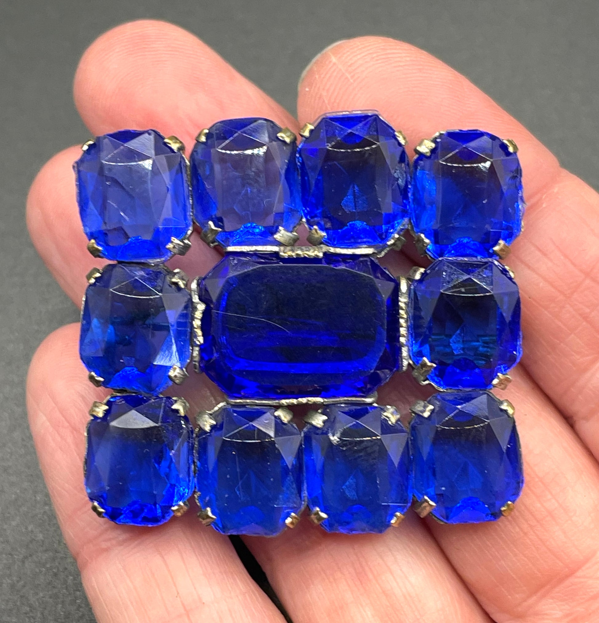 The brooch is about 1.75 inches long and 1.5 inches wide and has a pin and early, simple 'C' clasp. It is in good vintage condition - the crystals have some very minor scratches as shown and there is a little wear and a slight corner dent to the silver tone on the back, with it showing some hints of the brass underneath.