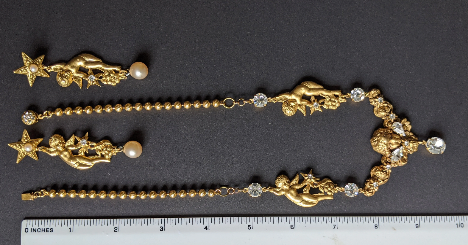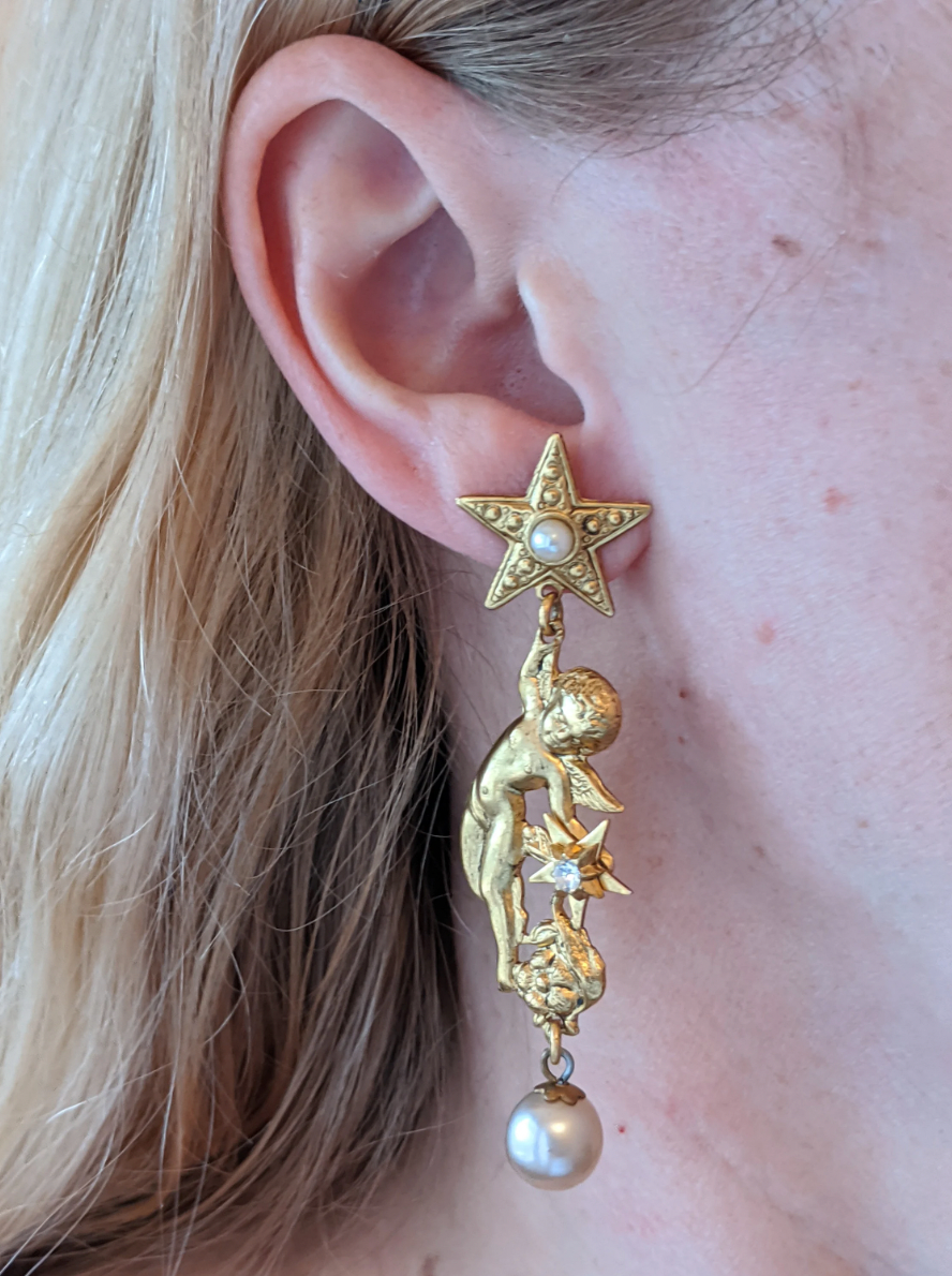 This set has a stunning statement necklace in gold plate, with cupid / cherub motifs, clear rhinestones, flowers and stars with glass pearl cabochons and drops.