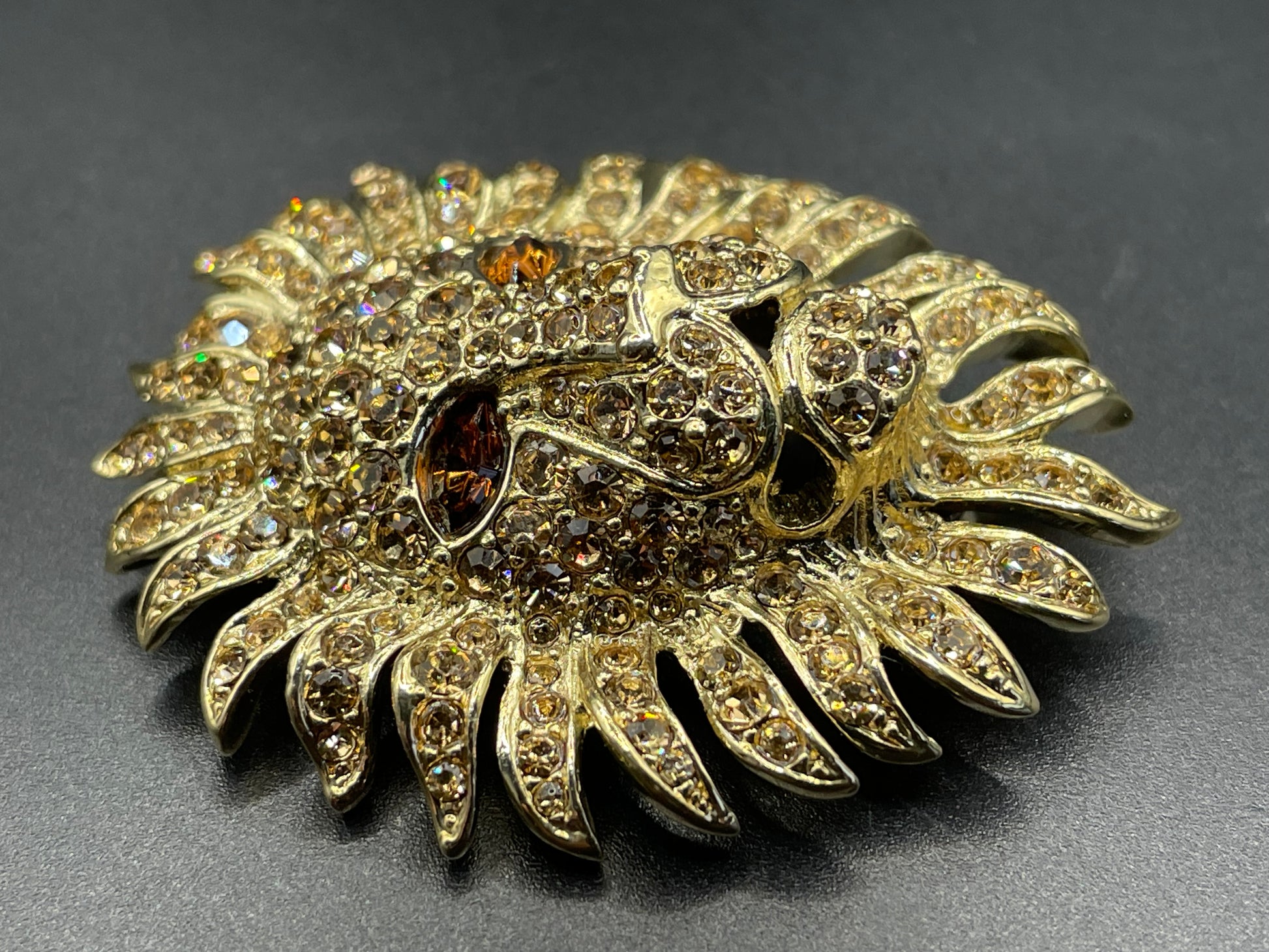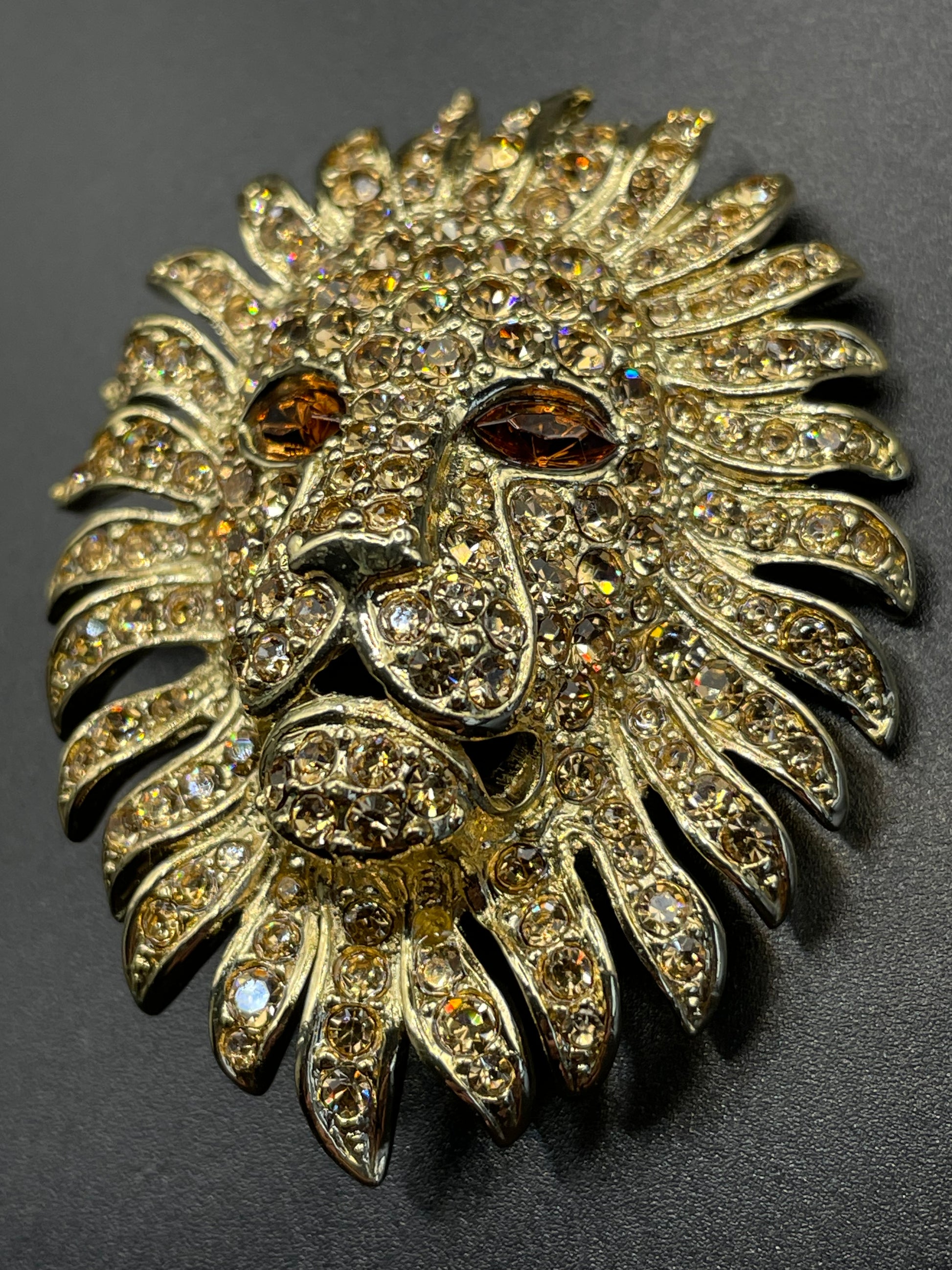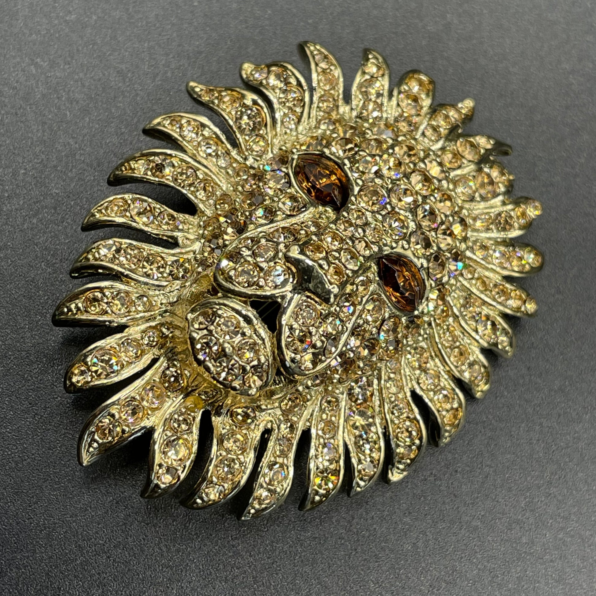 Vintage Attwood and Sawyer large rhinestone encrusted, 22 carat gold plated lion brooch with champagne coloured rhinestones across the face and large topaz orange/brown marquise cut rhinestones for eyes. It measures about 2 inches by 1.5 inches.