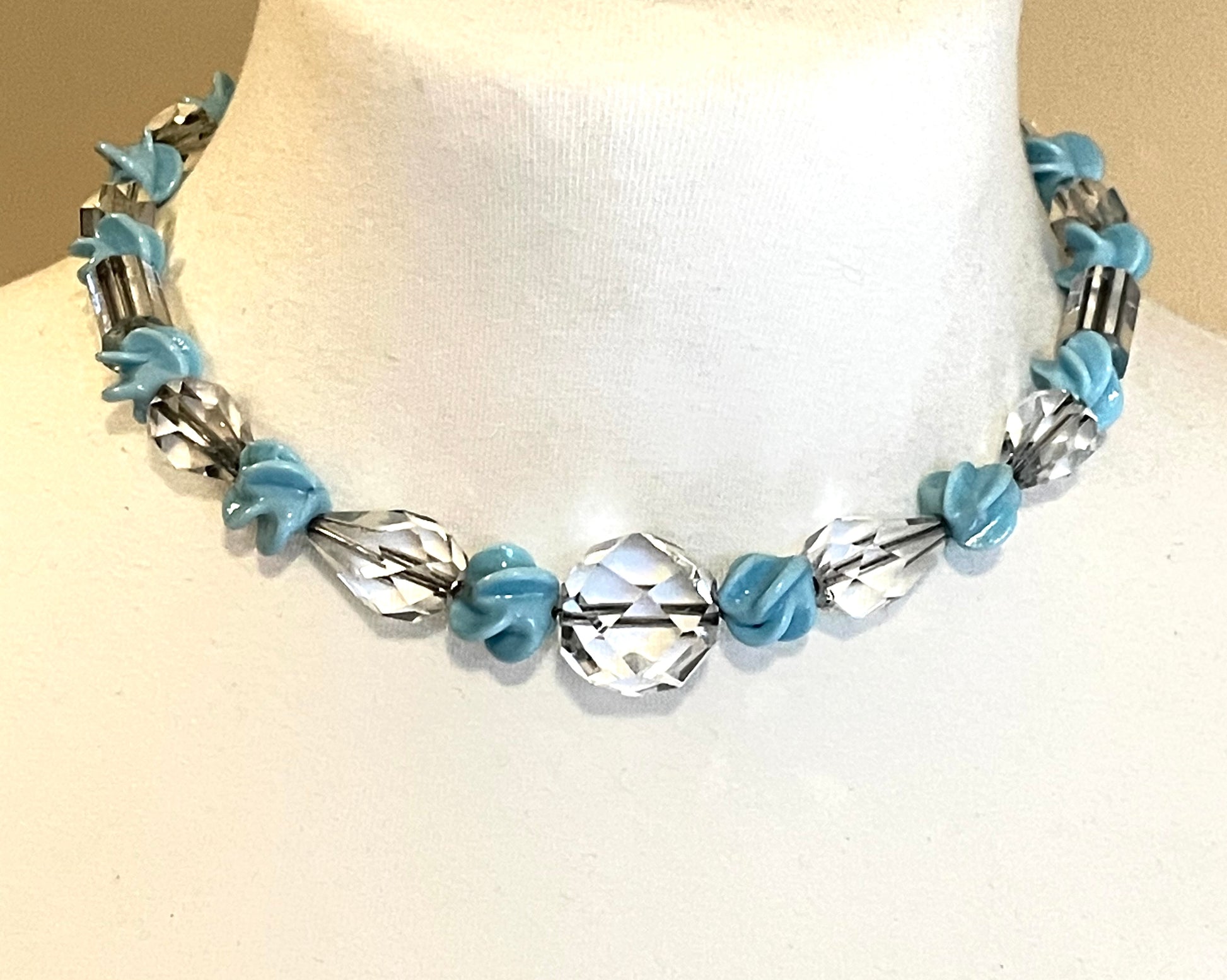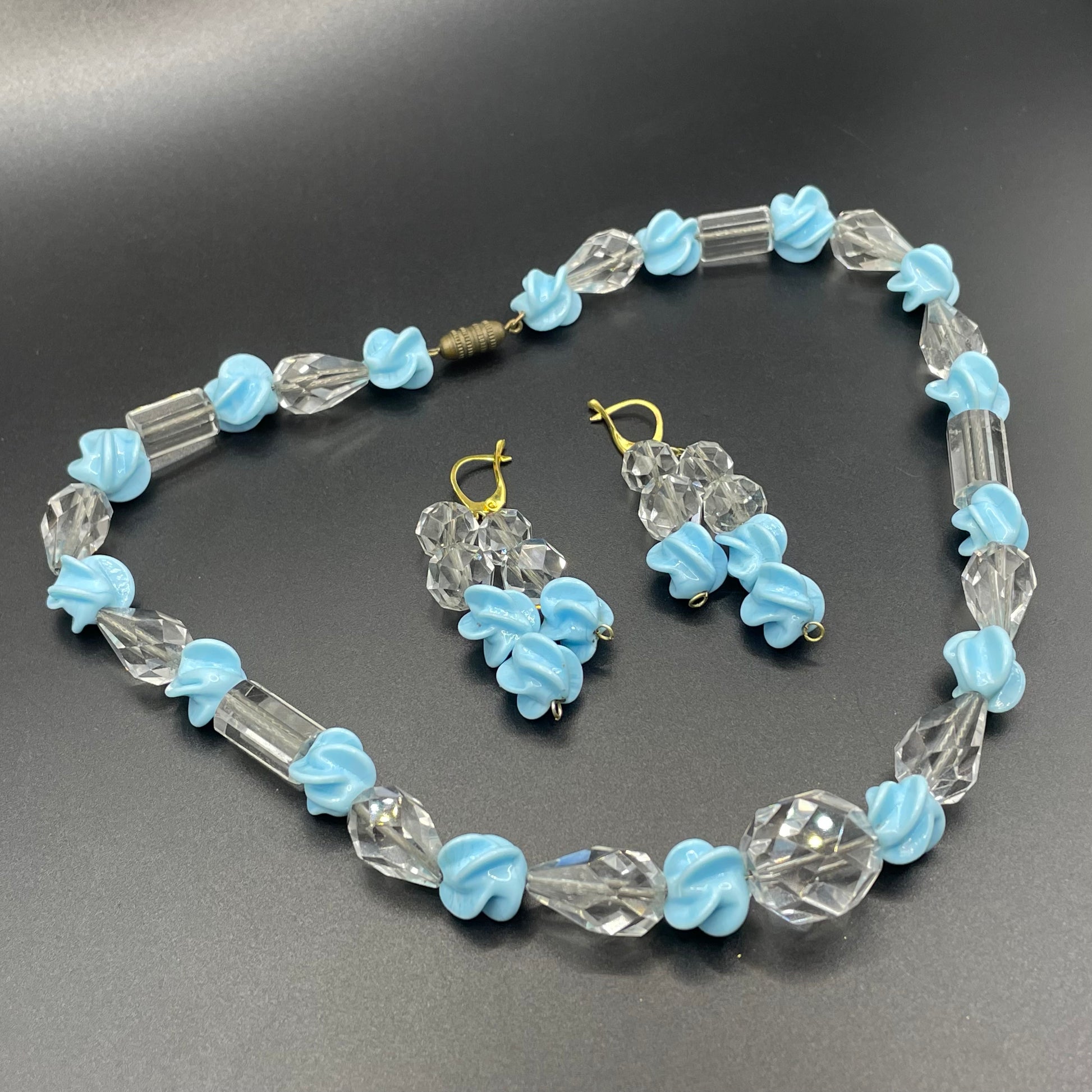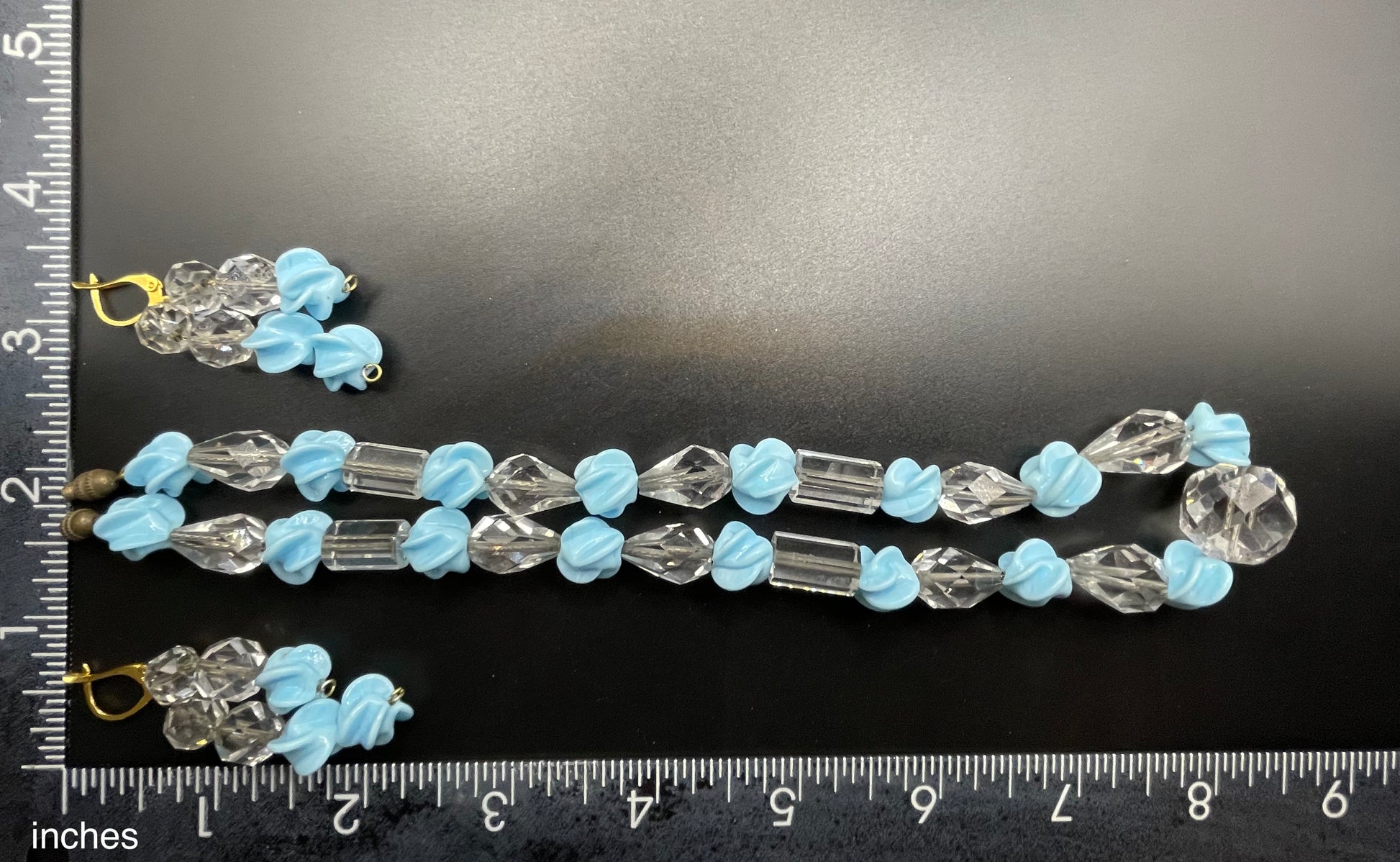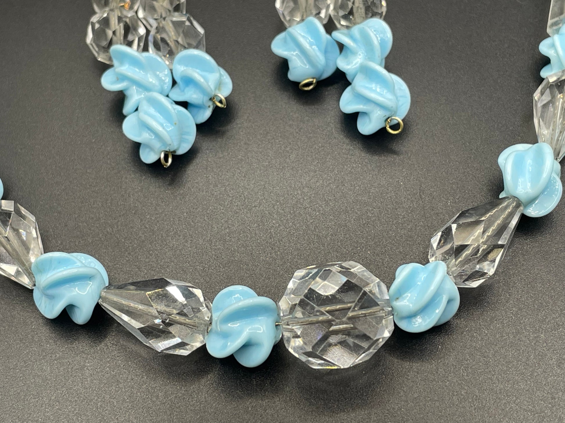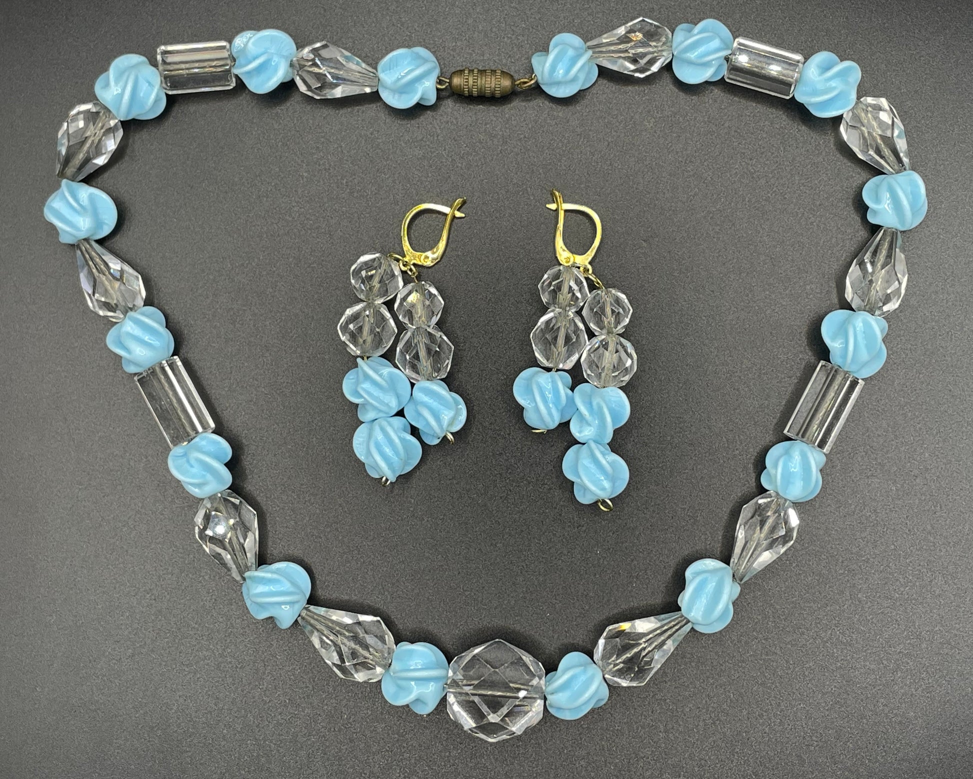 Gorgeous vintage baby blue milk poured glass and faceted clear cut crystal beaded necklace and drop earrings for pierced ears.