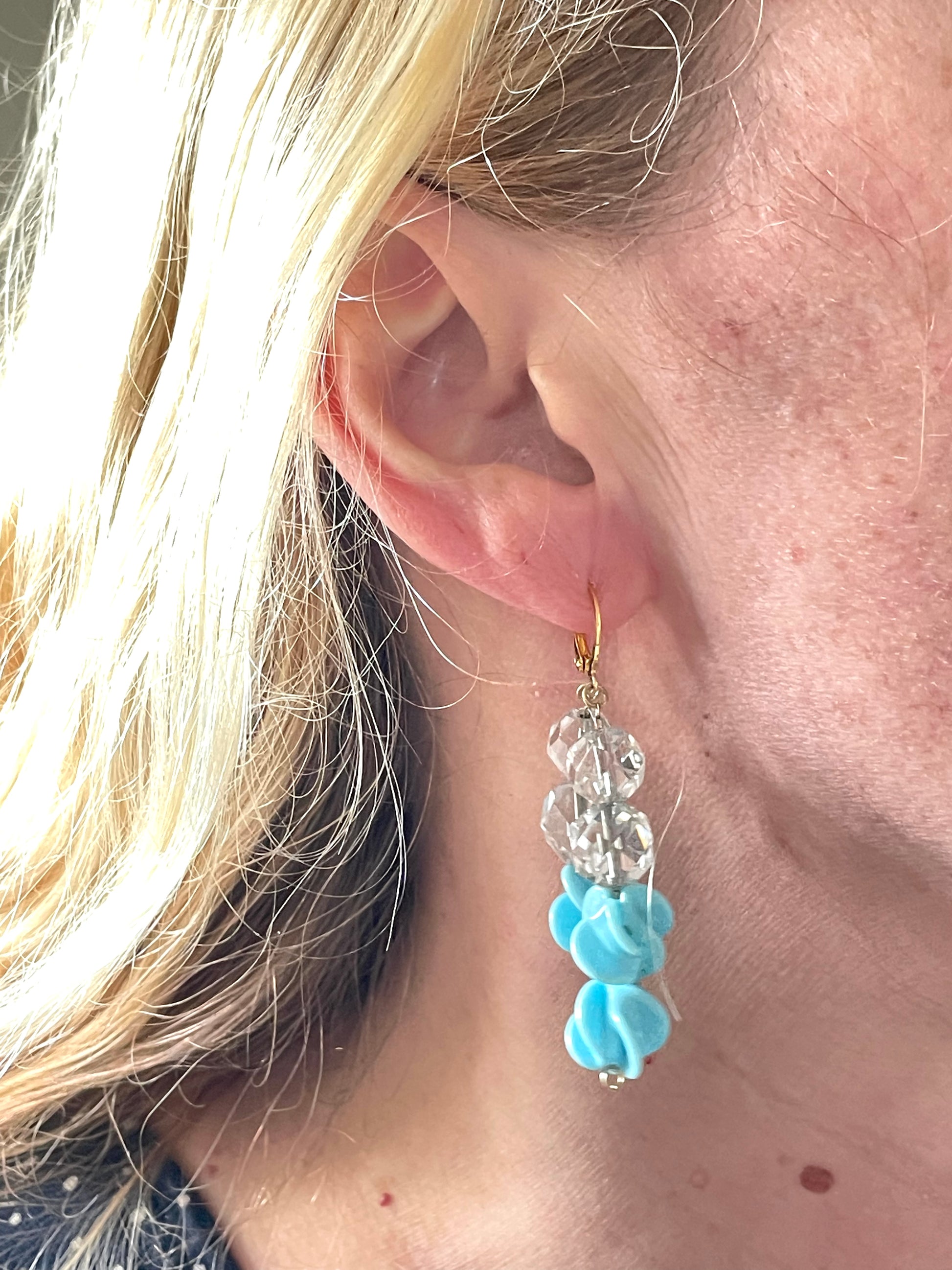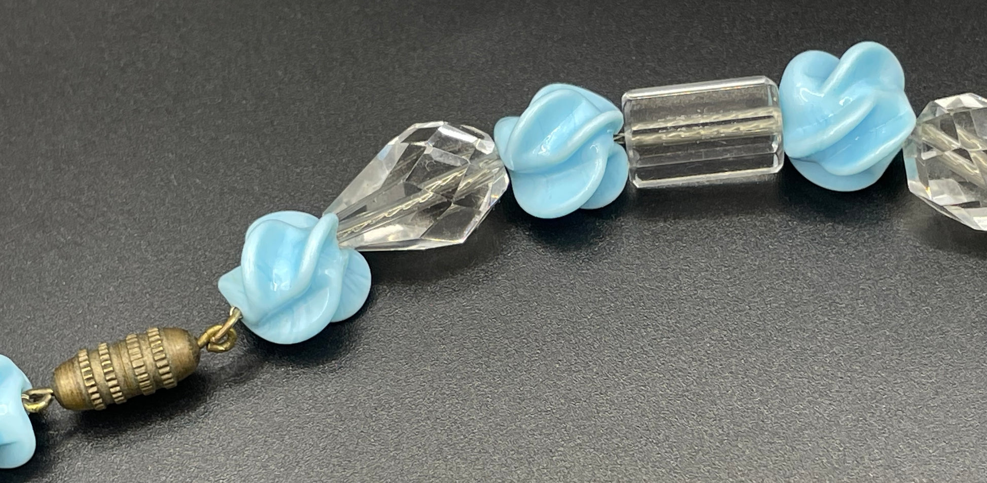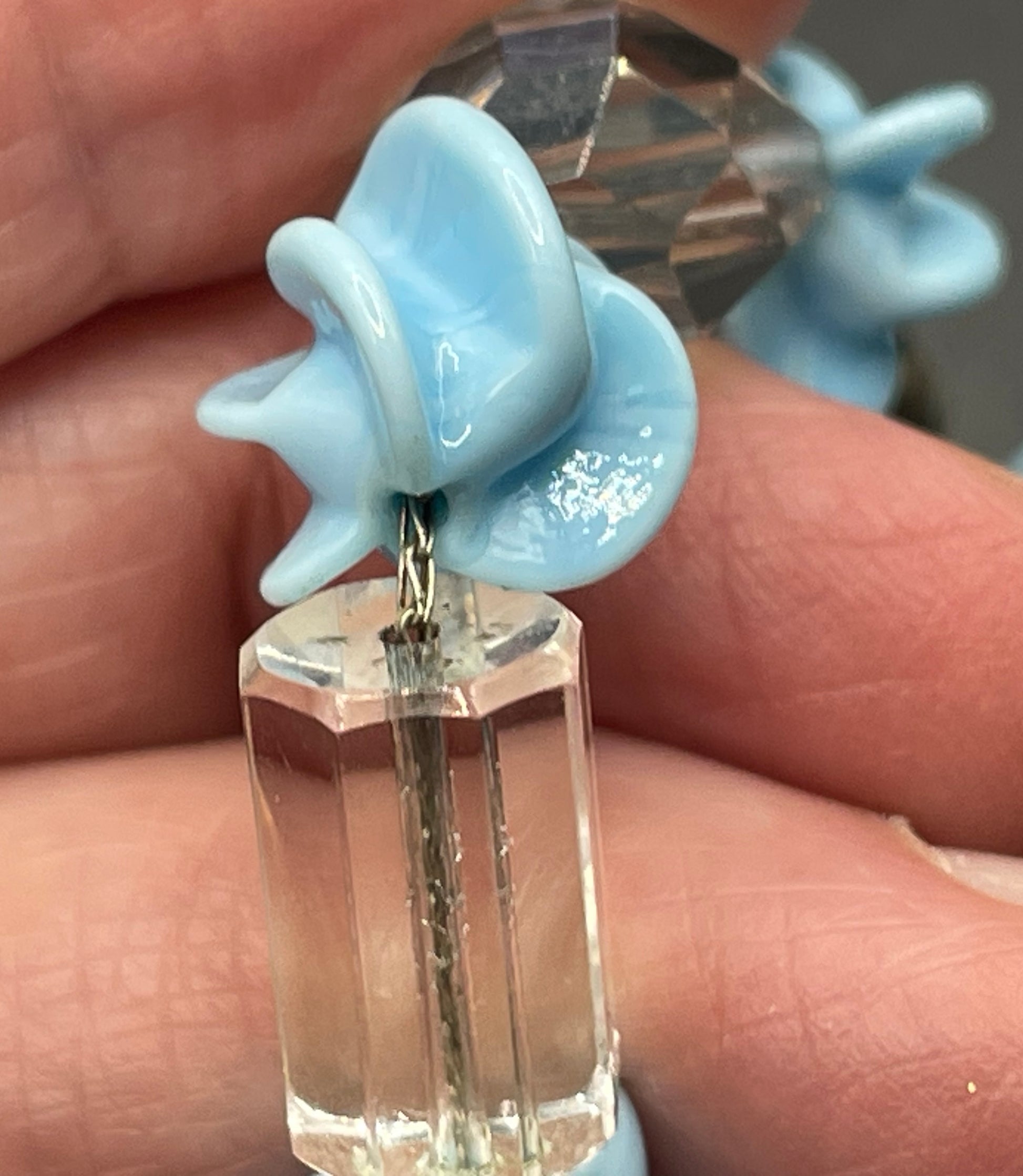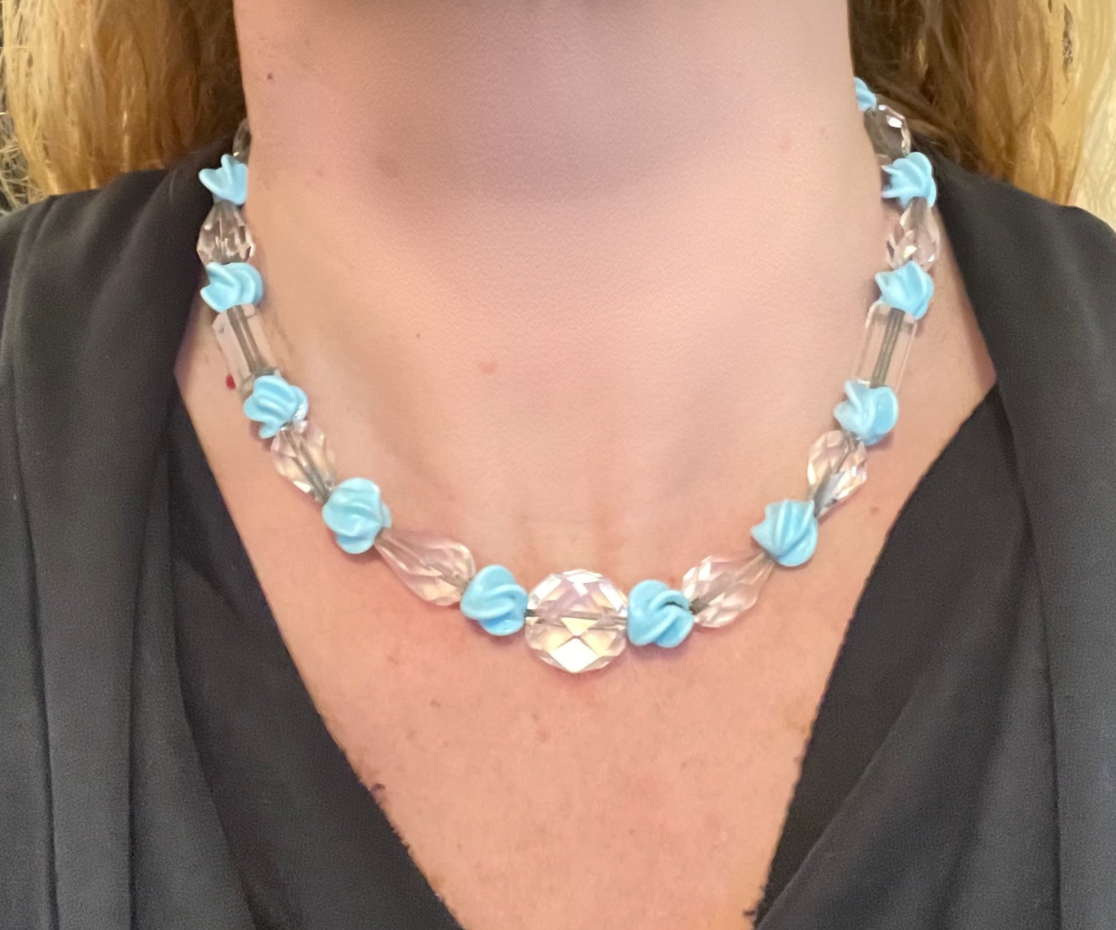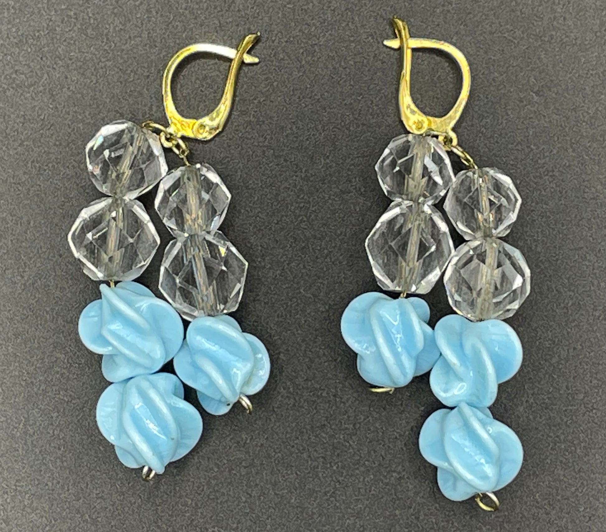 Gorgeous vintage baby blue milk poured glass and faceted clear cut crystal beaded necklace and drop earrings for pierced ears.
