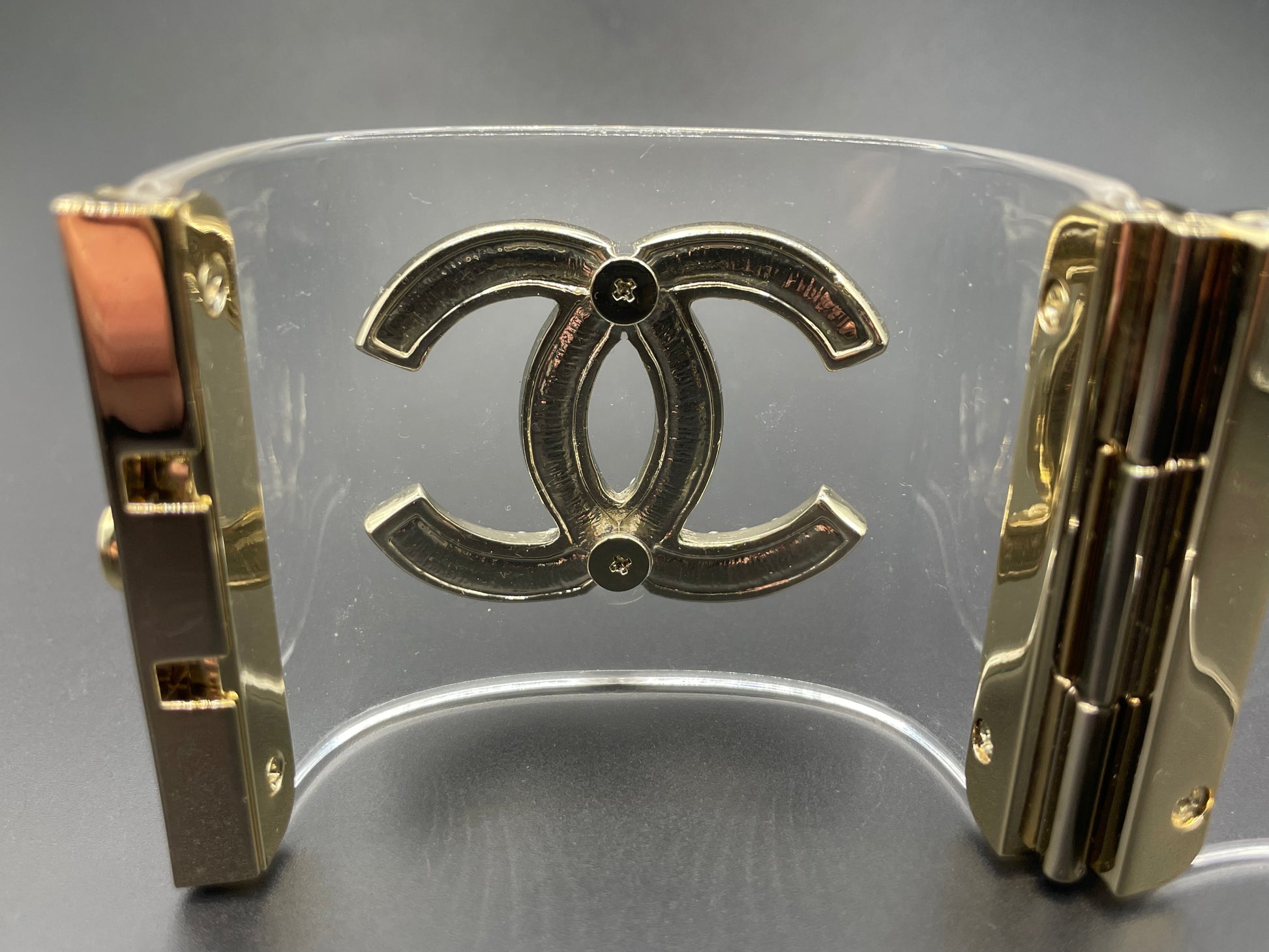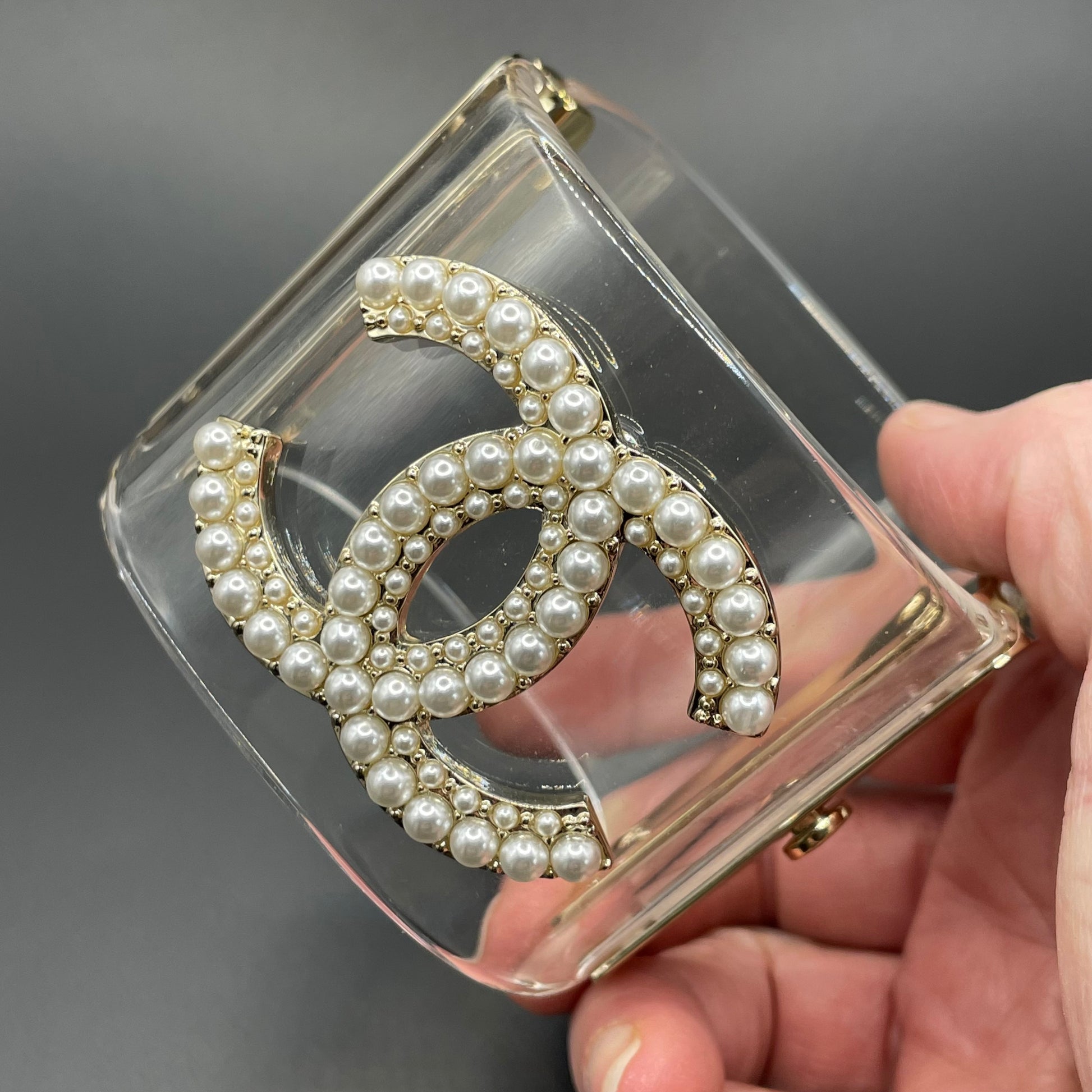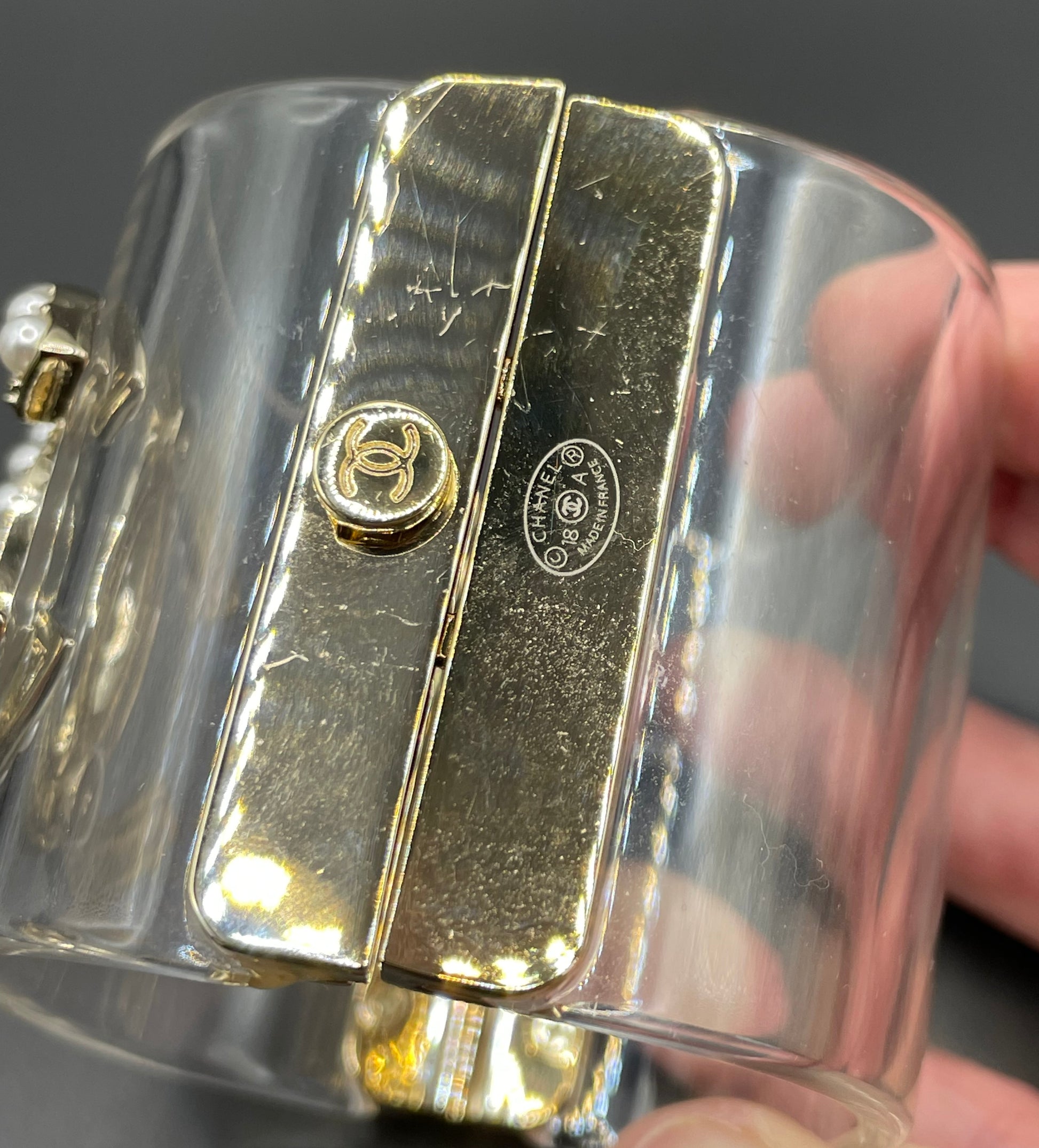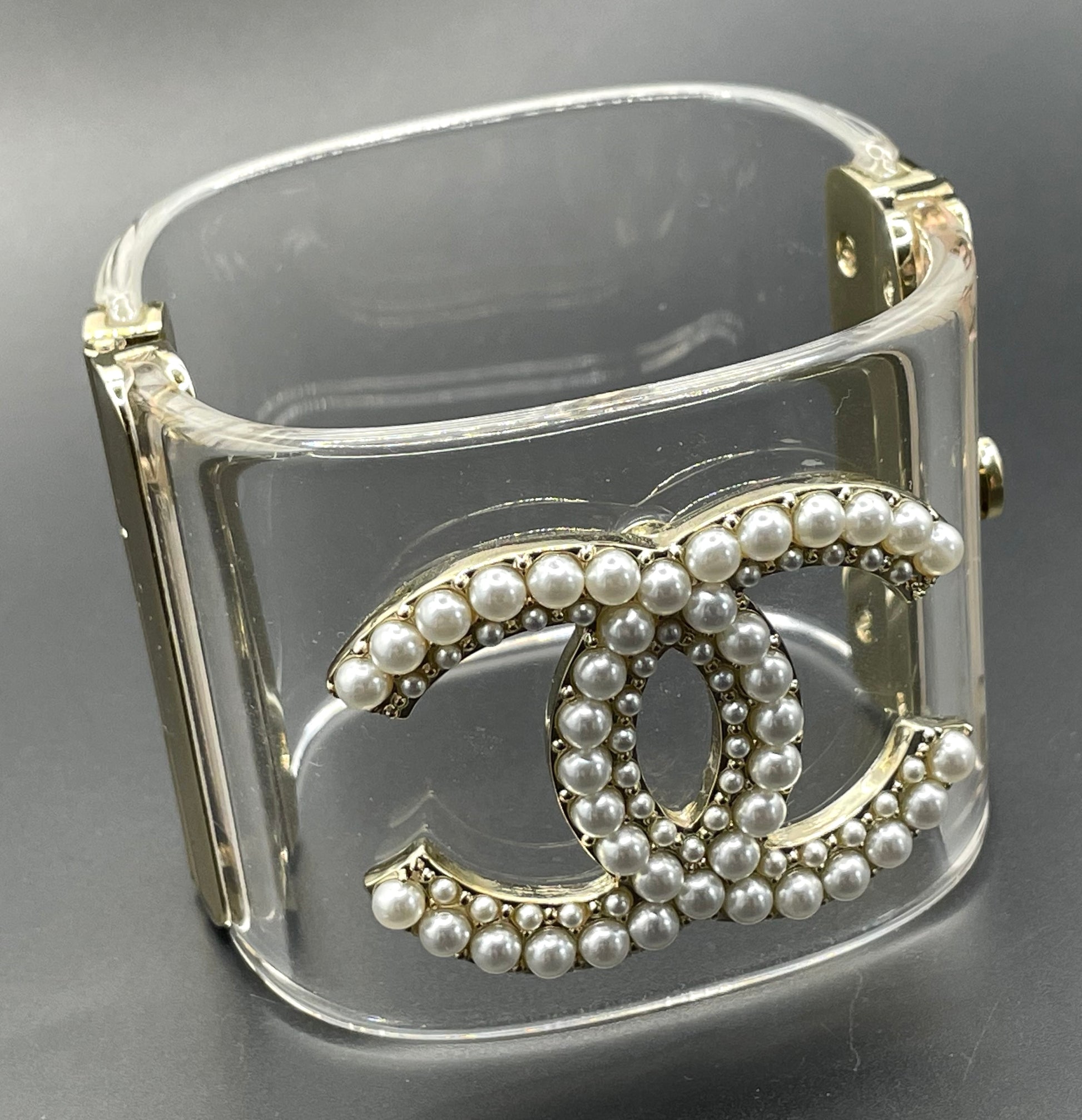 Vintage Chanel clear plastic, gold tone and faux pearl logo cuff bangle. The cuff has the Chanel lazer signature on the side near the opening catch. It is a 2018 piece, stamped 18A.