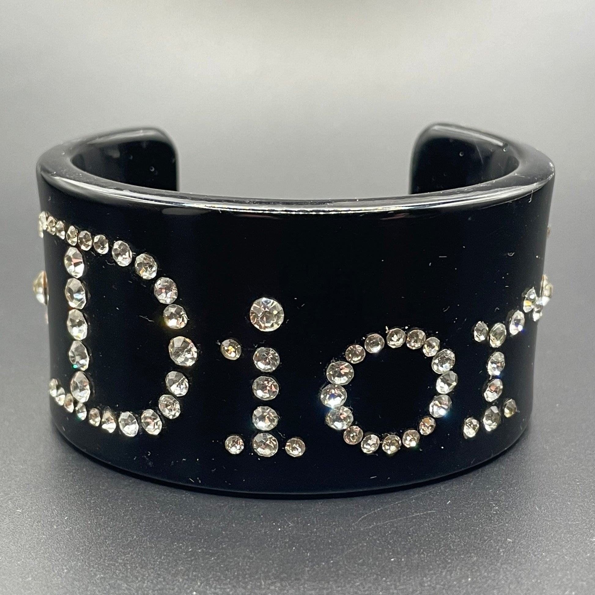 Vintage Christian Dior clear crystal rhinestone on black plastic cuff bangle. The design has "Dior" spelled out in sparkling rhinestones with scatterings of rhinestones on either side of the logo.