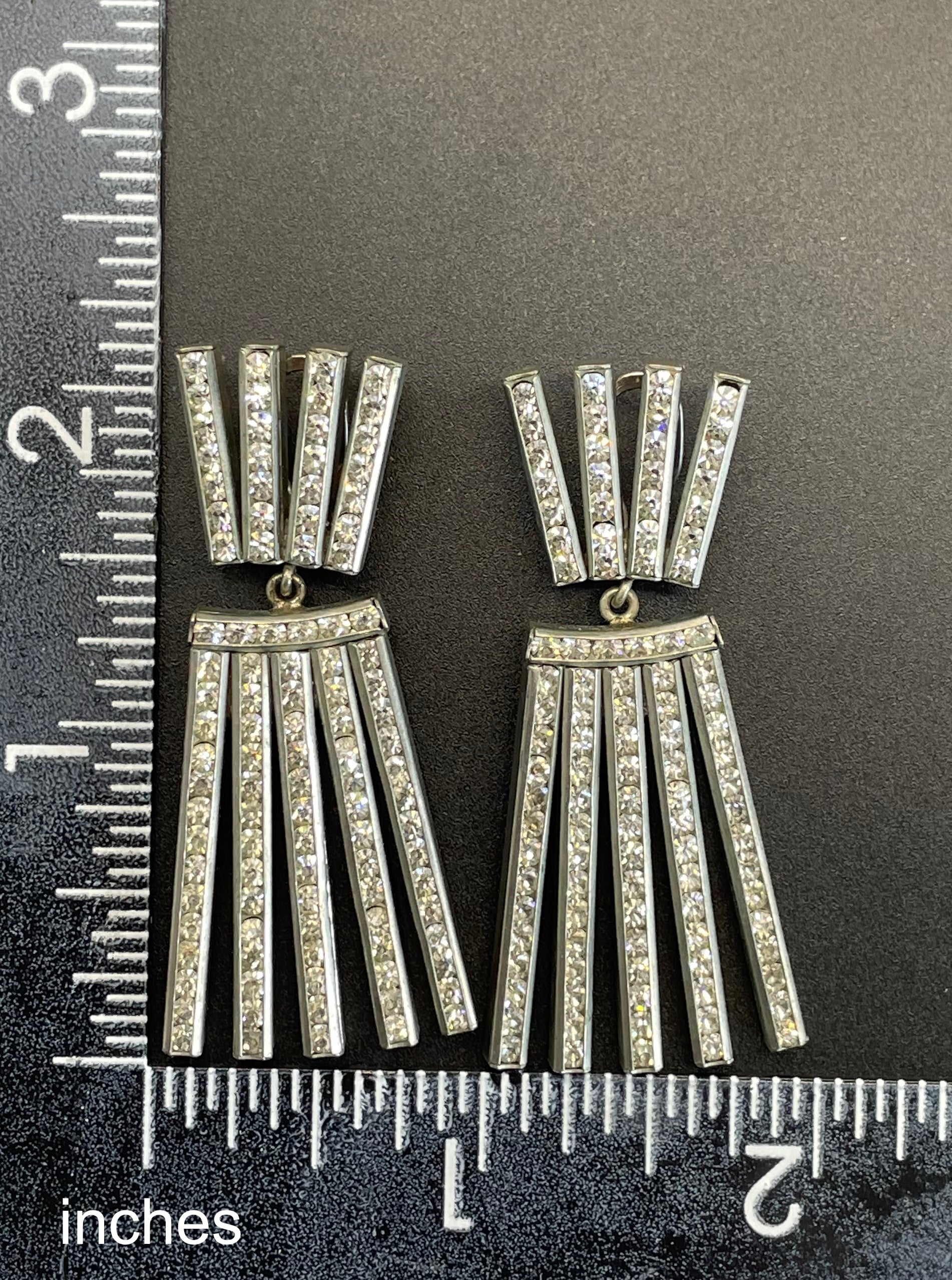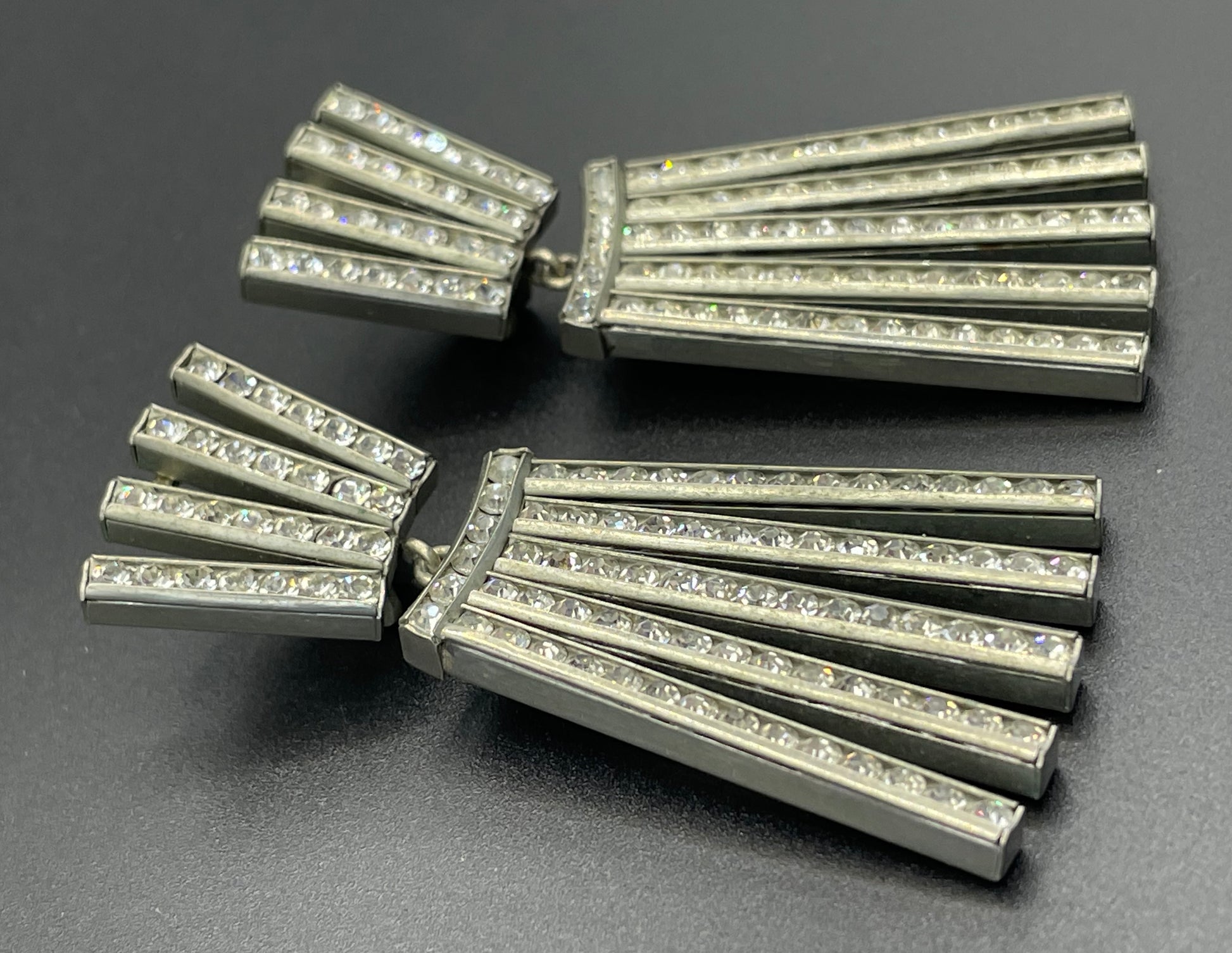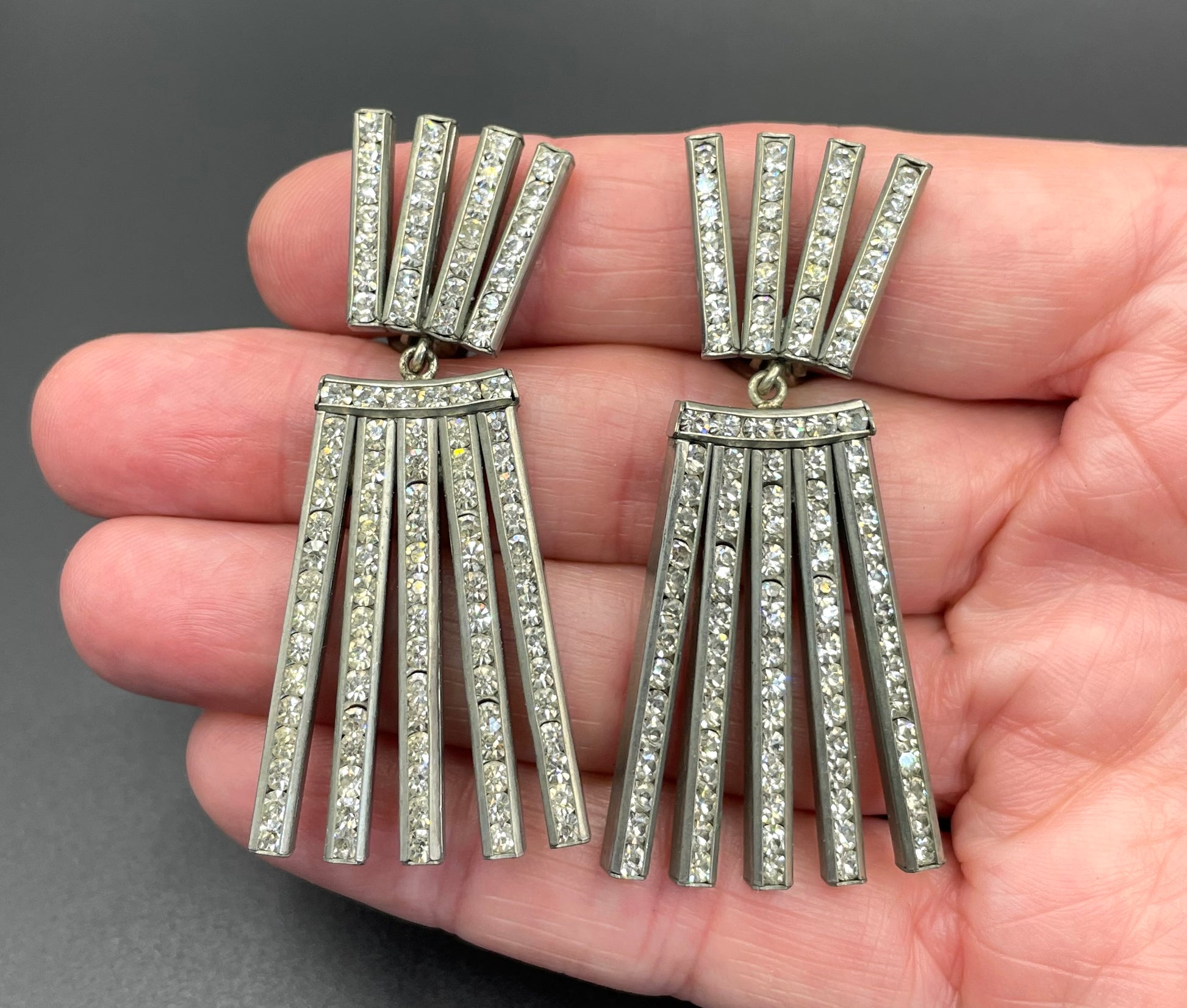 Wonderful, large vintage Art Deco 'DRGM' clip on earrings in silver tone with clear channel set rhinestones using the Schreiber and Hiller company's patented construction. I haven't seen this design before and very rarely find earrings - they are stunning. Each consists of one small and one larger, inverted, fan of long, rectangular clear rhinestones, channel set in silver tone.