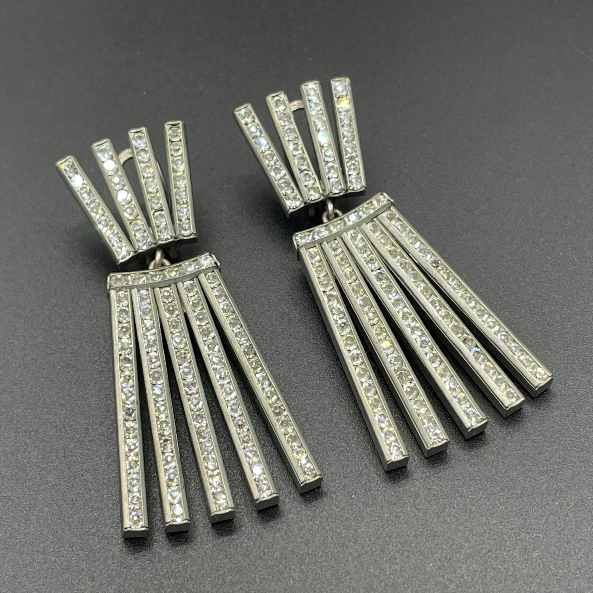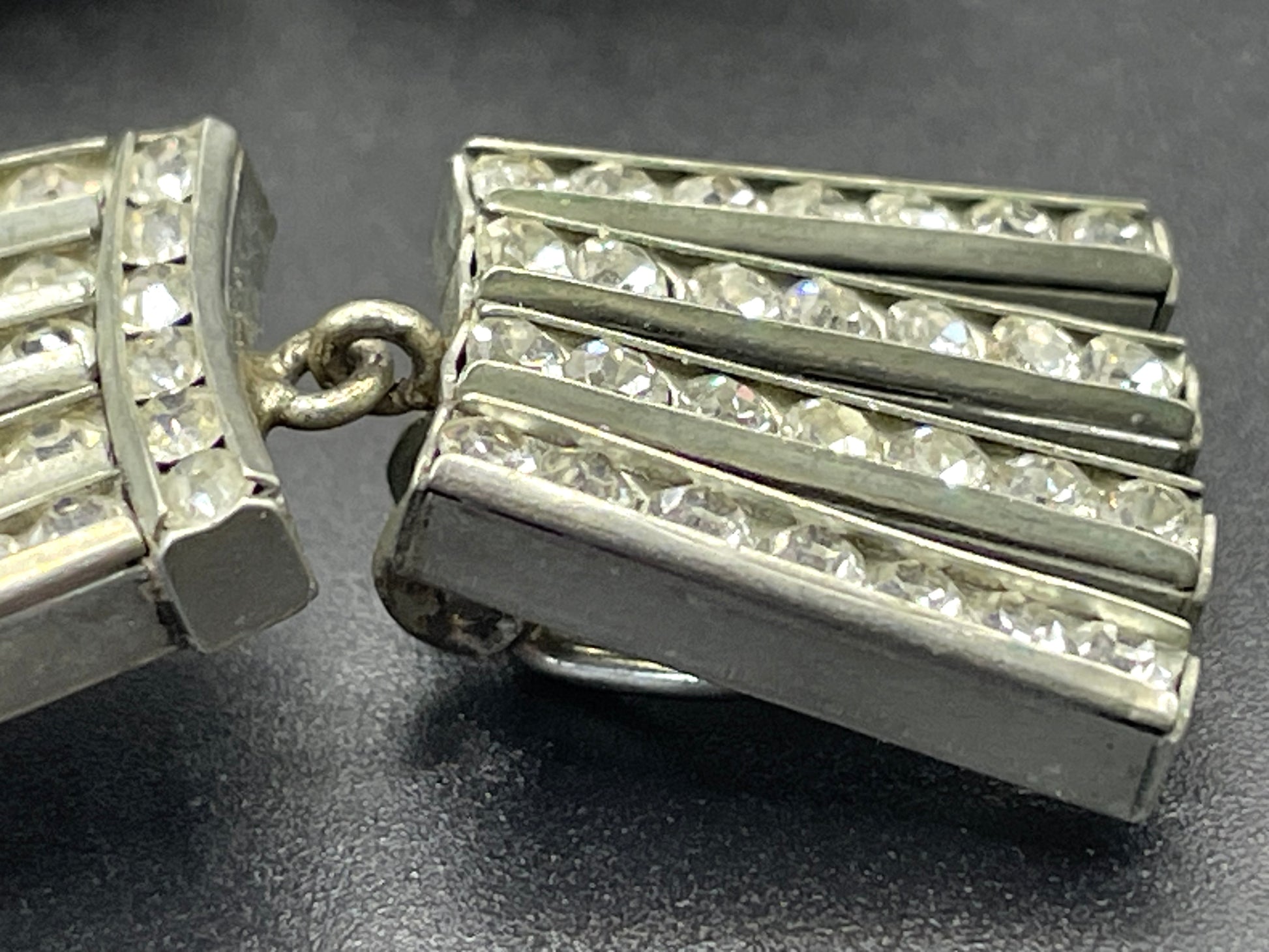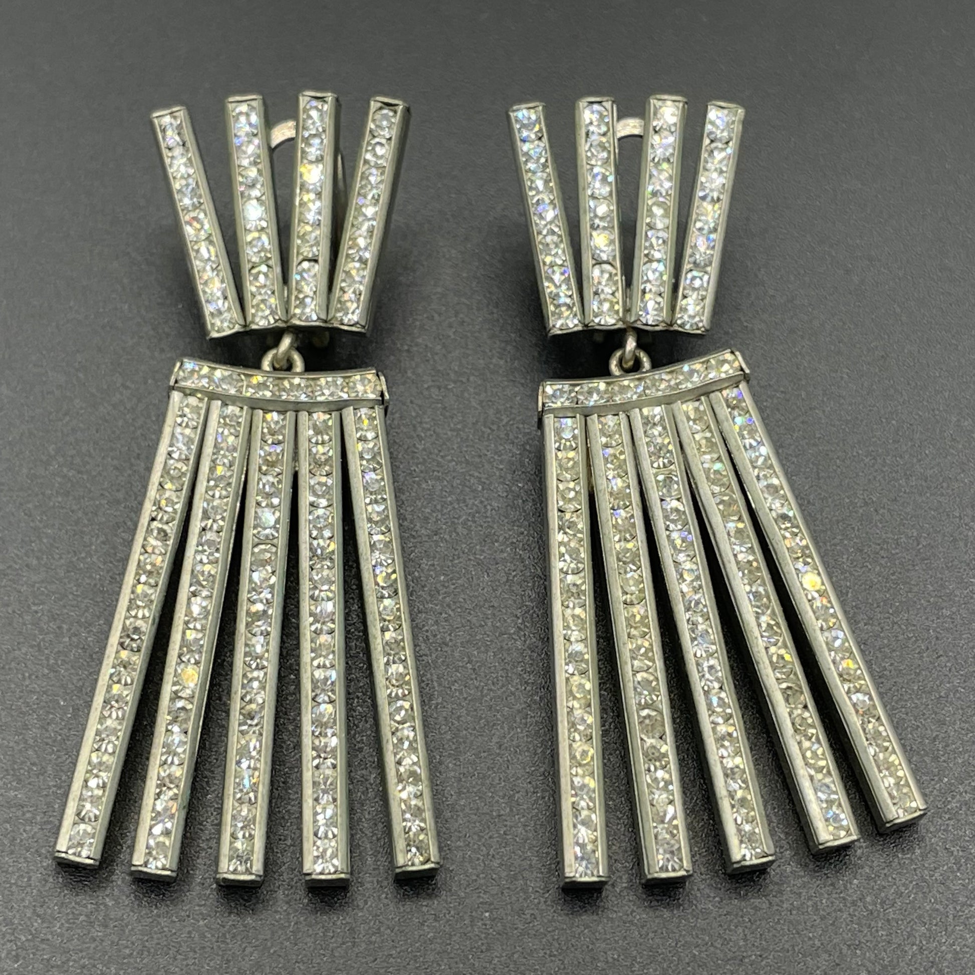 Wonderful, large vintage Art Deco 'DRGM' clip on earrings in silver tone with clear channel set rhinestones using the Schreiber and Hiller company's patented construction. I haven't seen this design before and very rarely find earrings - they are stunning. Each consists of one small and one larger, inverted, fan of long, rectangular clear rhinestones, channel set in silver tone.