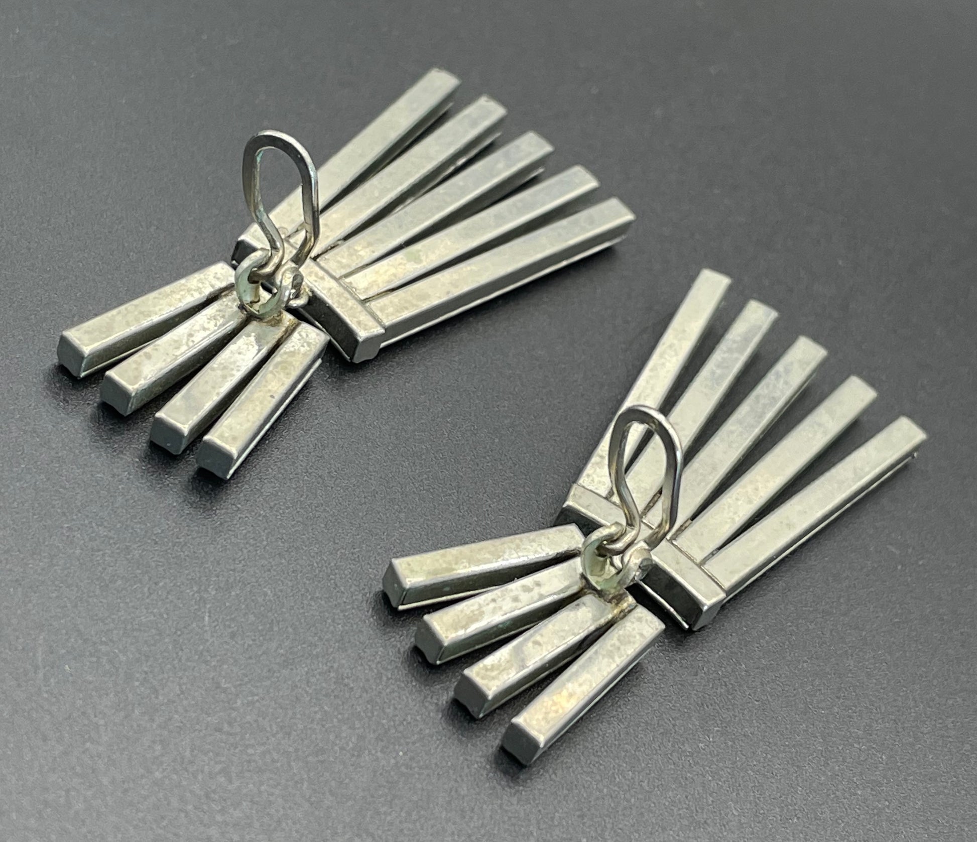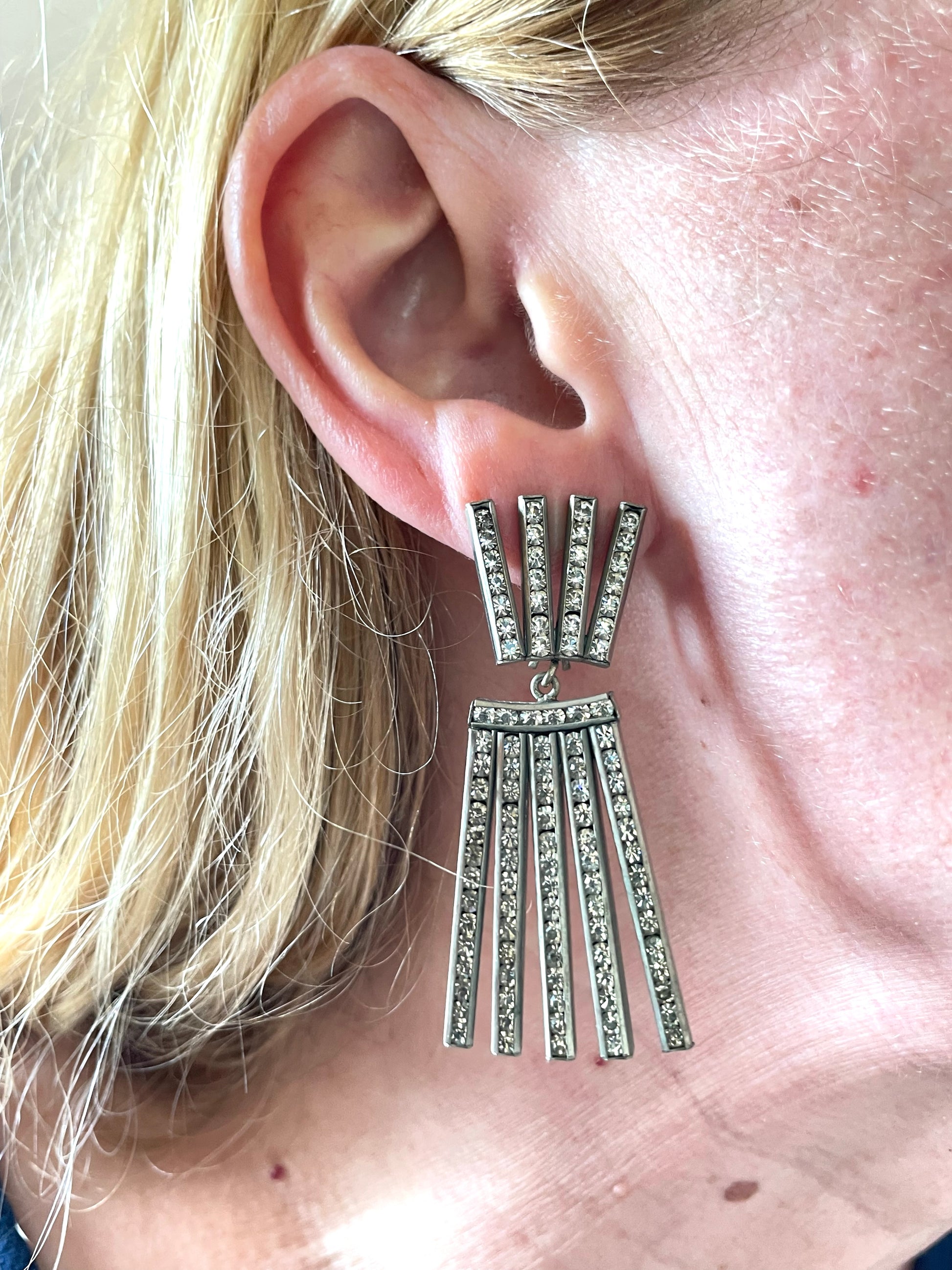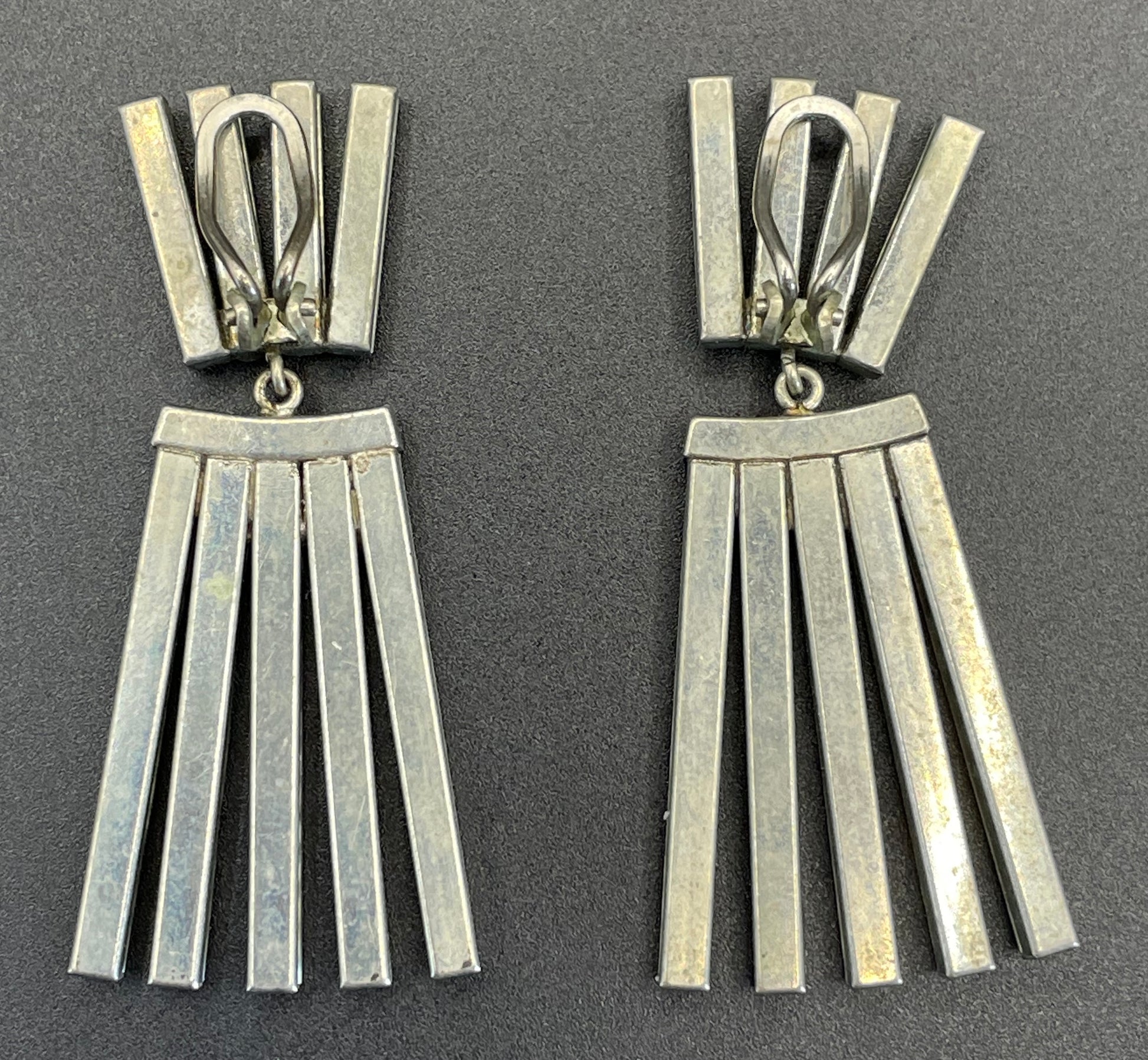 Made by Schreiber and Hiller in Germany as we now know, these pieces are beautifully and intricately engineered. The earrings are just over 2 inches long and 1 inch wide. They are unsigned with no stamps or signatures, but clearly use the Schreiber and Hiller patented channel setting technique.