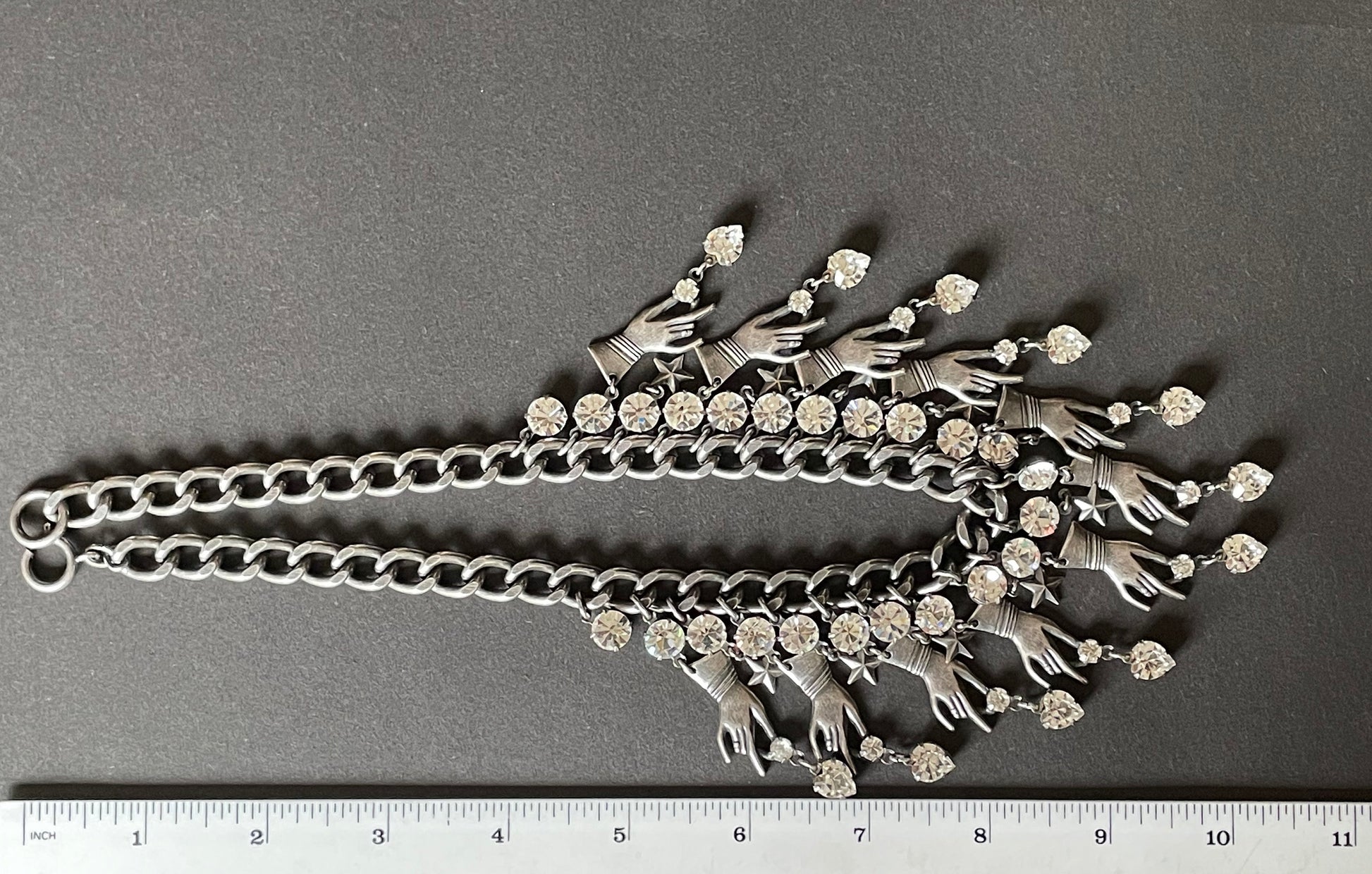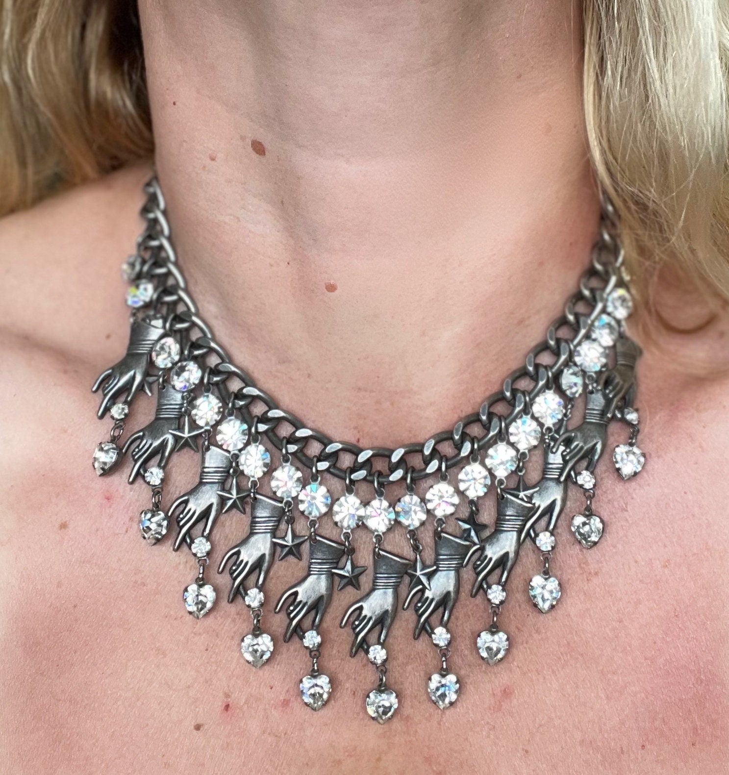 Vintage early Askew London hand, heart and star heavy fringe necklace, statement piece in chic dark silver tone & clear rhinestone, unique