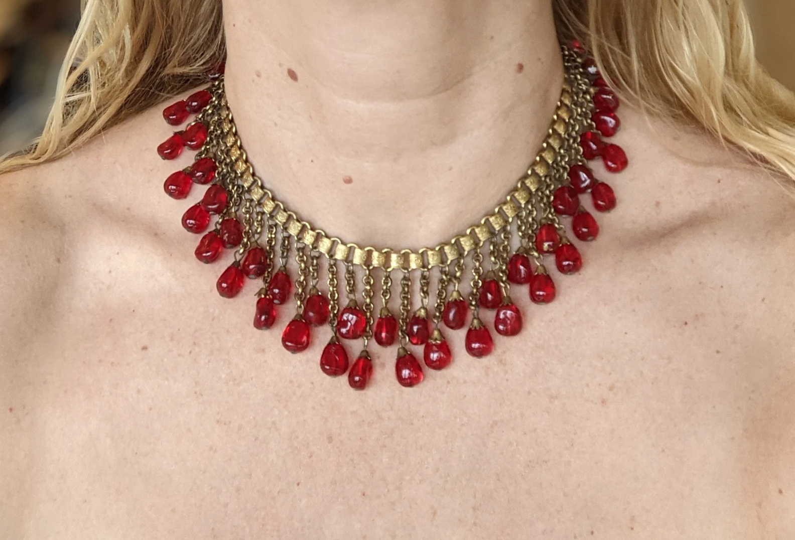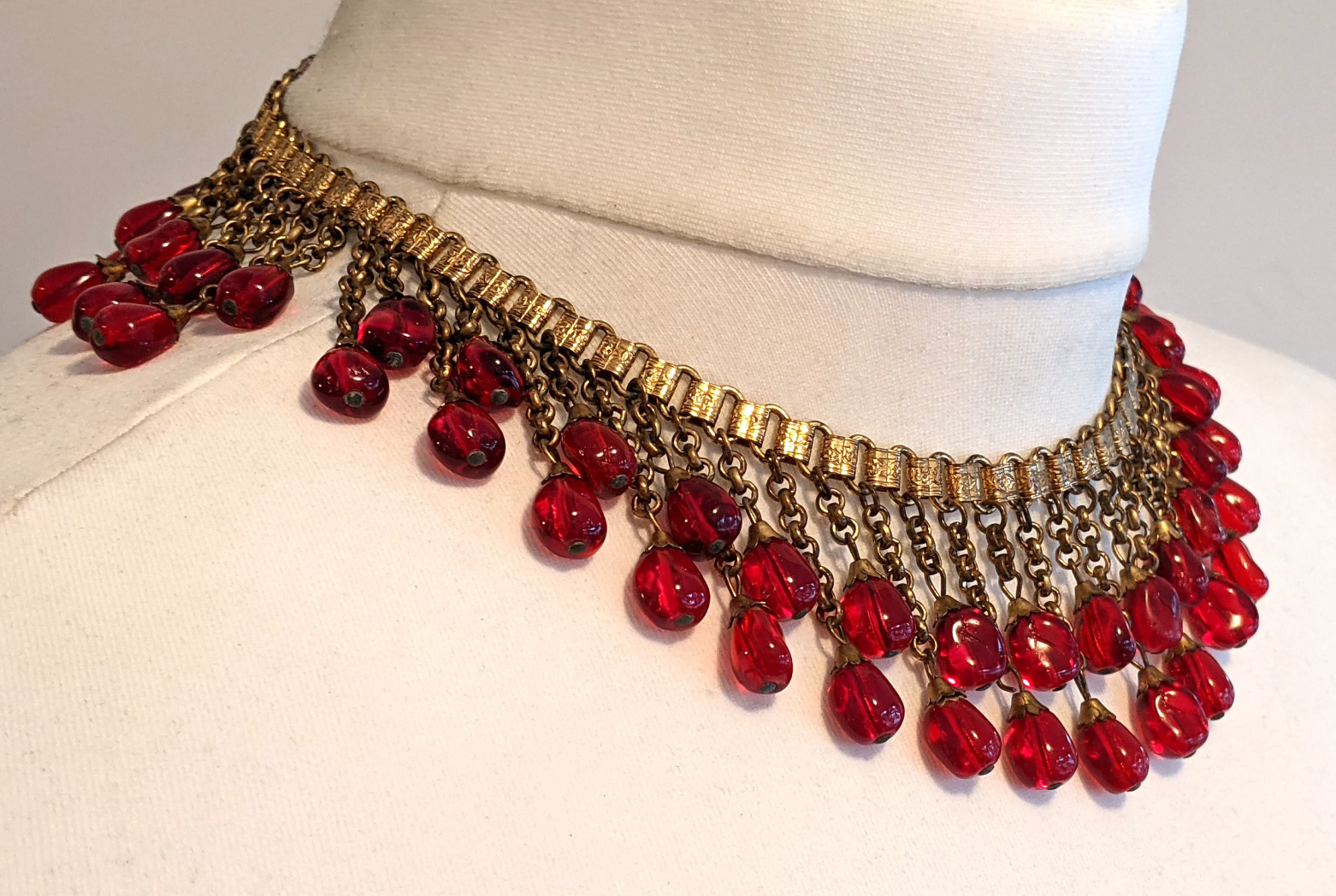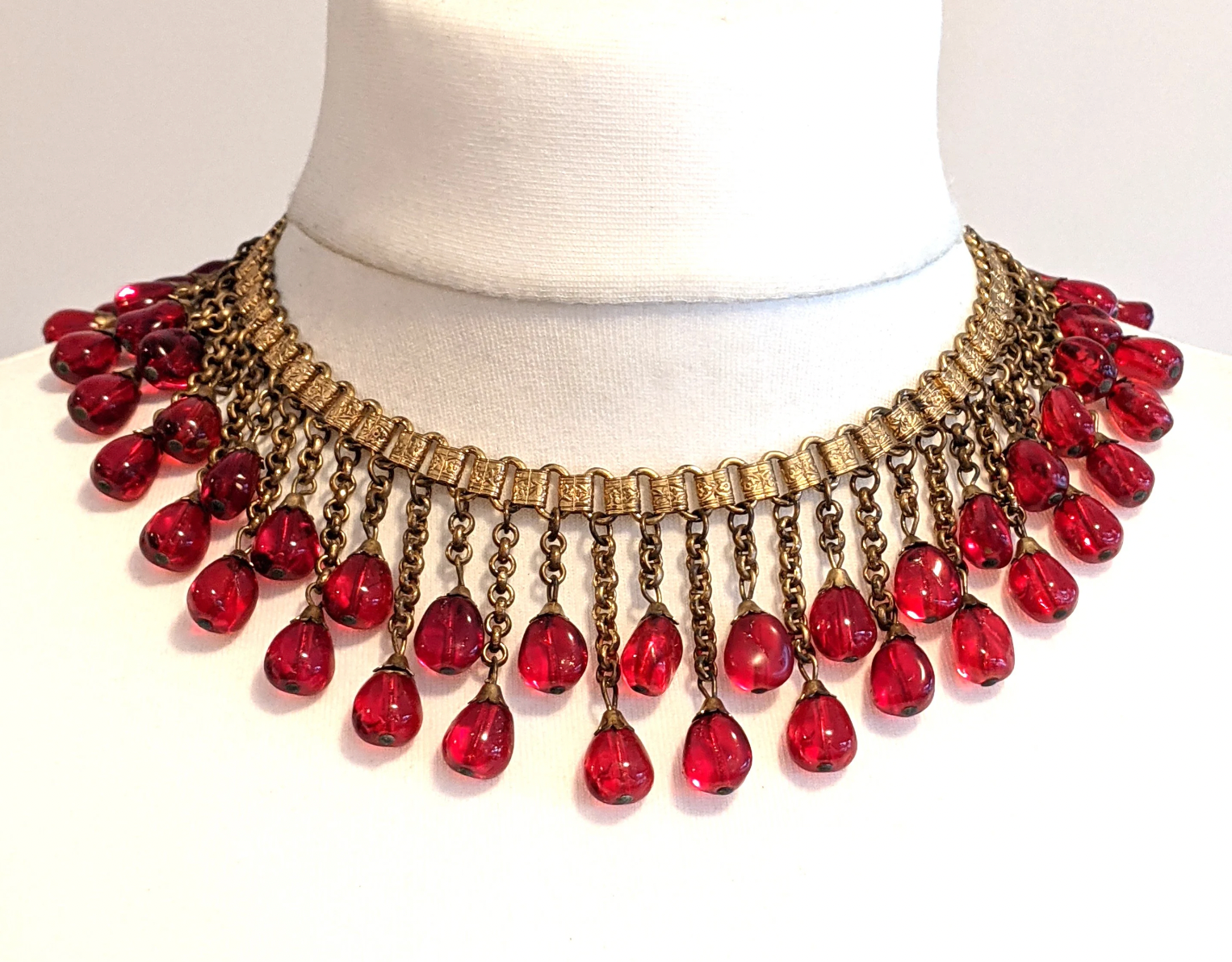 The detail of the intricate workmanship, particularly the fringe design with a book chain collar and French poured glass beads are typical of Miriam Haskell pieces while designers such as Frank Hess were working for her. She liked to used these colours - bright red and gold - in her early pieces and this is a quality piece with beautiful beads that are in very good condition.