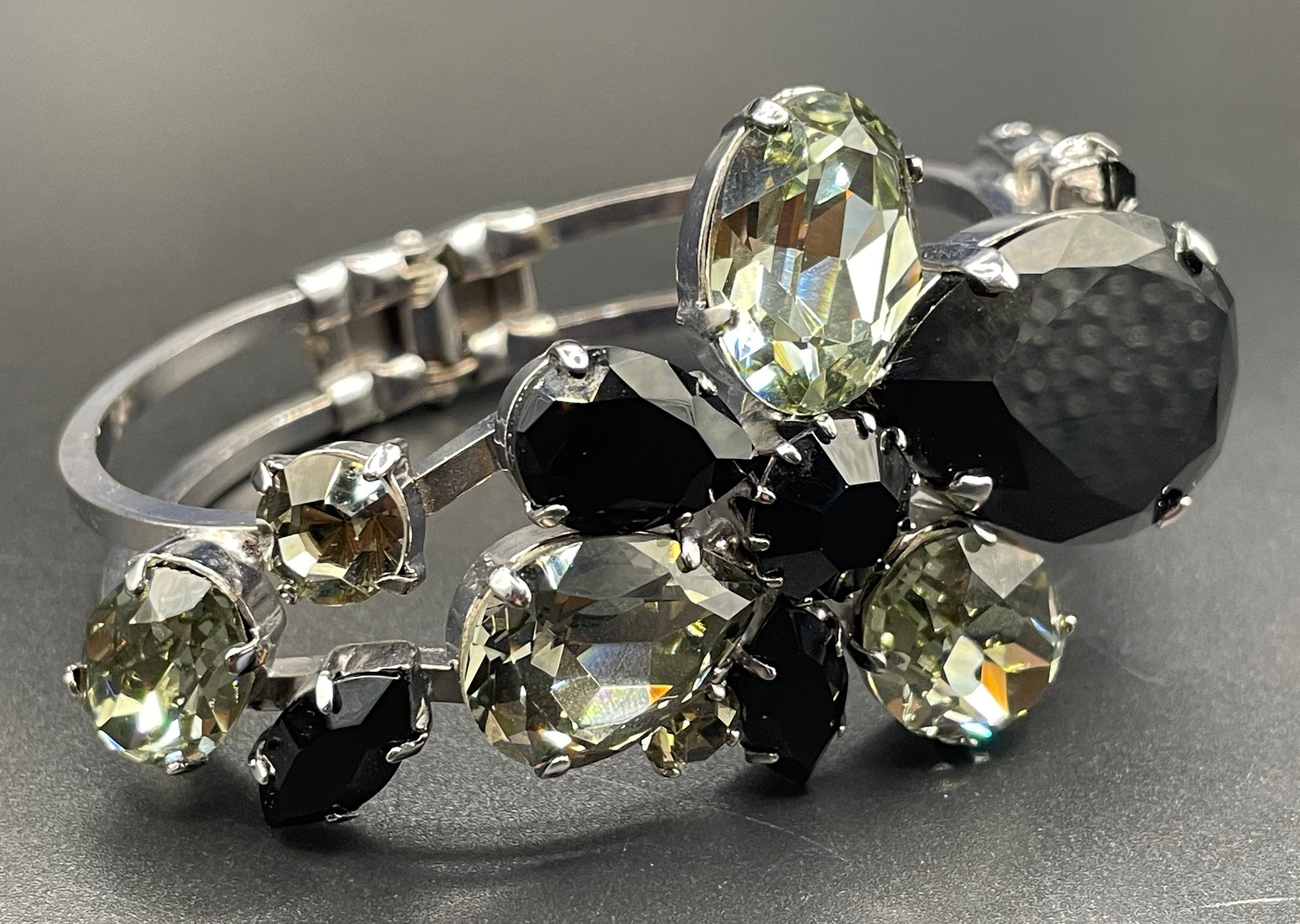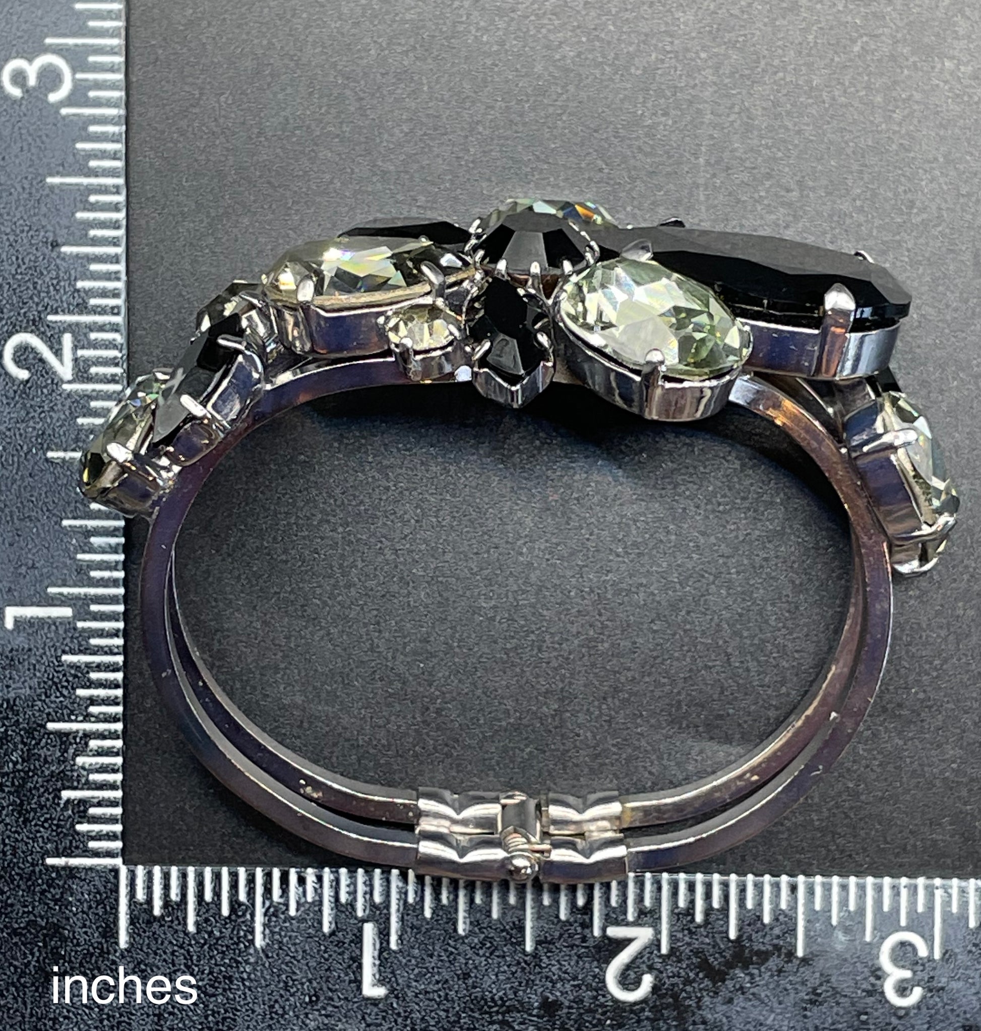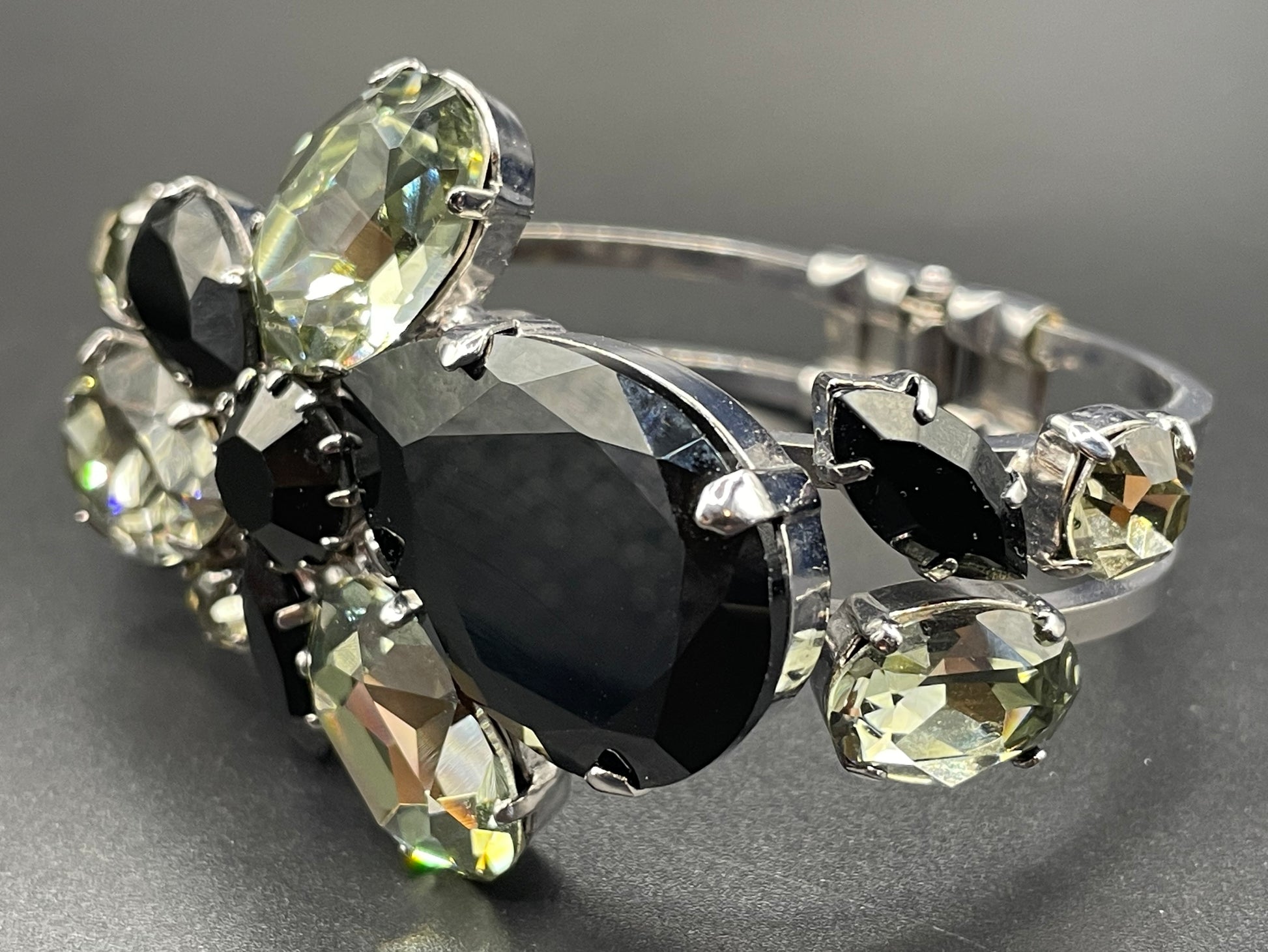 Vintage Juliana Delizza and Elster (D&E) black and grey green glass rhinestone and silver tone clamper bangle