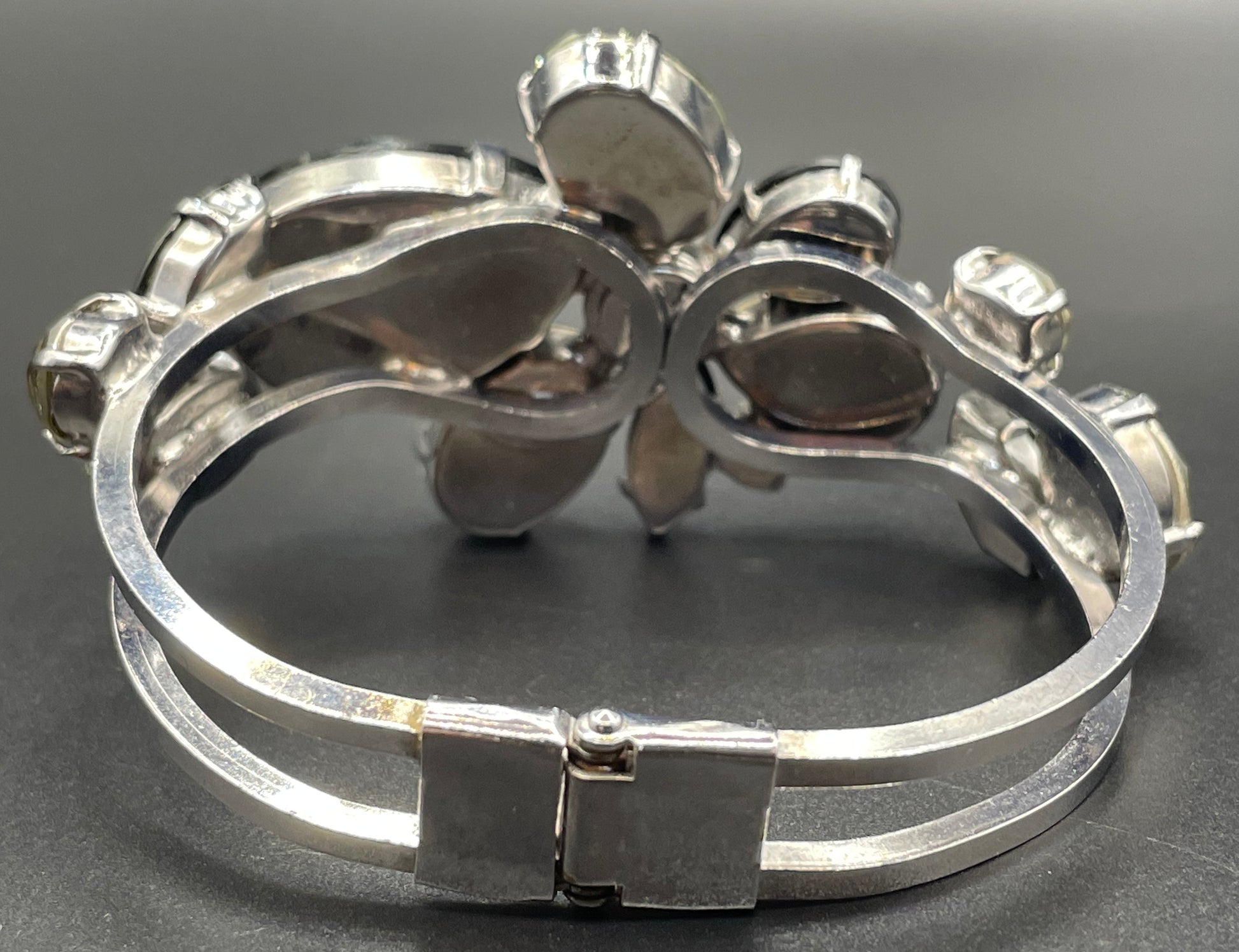 Stunning glass rhinestone encrusted clamper bangle from the Juliana range by Delizza and Elster (D&E) produced in the 1960s and 70s. These pieces have become highly collectable, and rightly so given their quality and imaginative designs. Juliana jewellery was signed with a paper tag, so very few of these tags survived and they are not stamped in any other way.