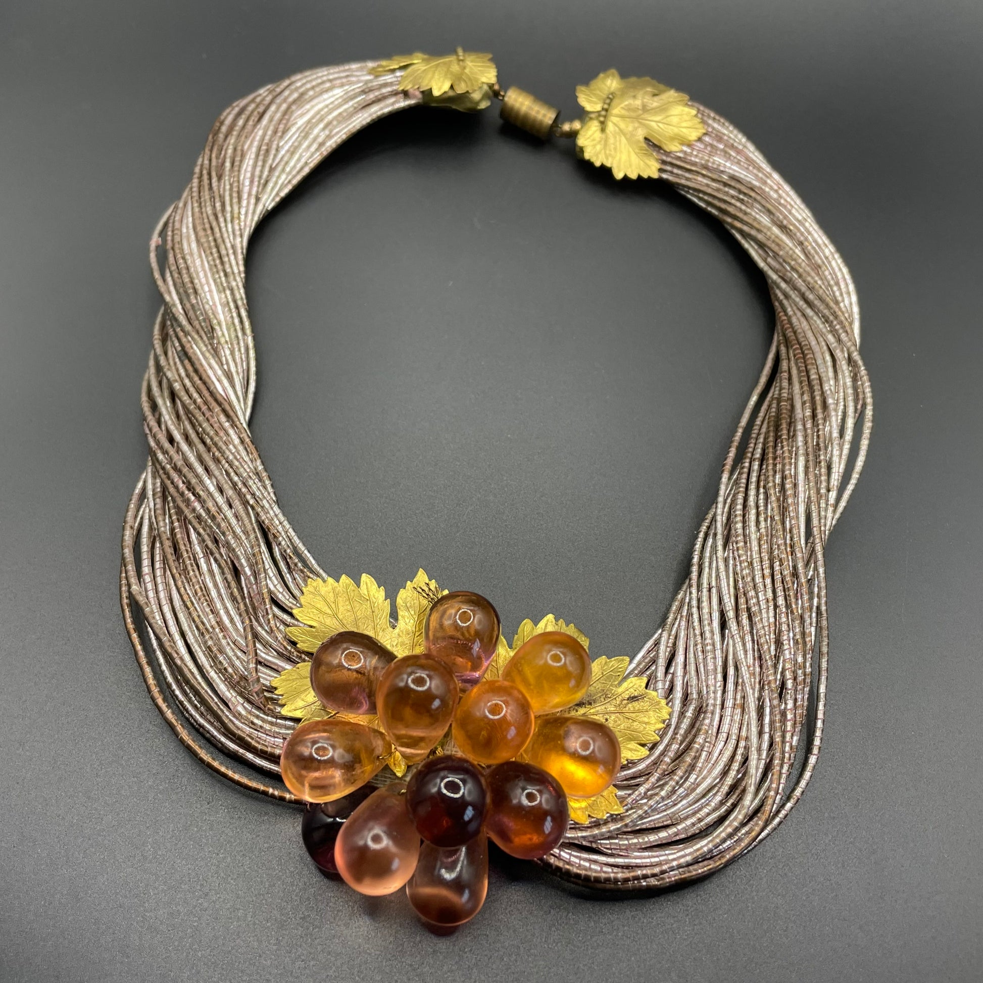 Fantastic Art Deco poured glass beads, gold tone and foil wrapped thread chunky necklace. The poured glass beads forming the central berry decoration and the chunky screw clasp suggest that this piece was probably made in France and was perhaps by Louis Rousselet.