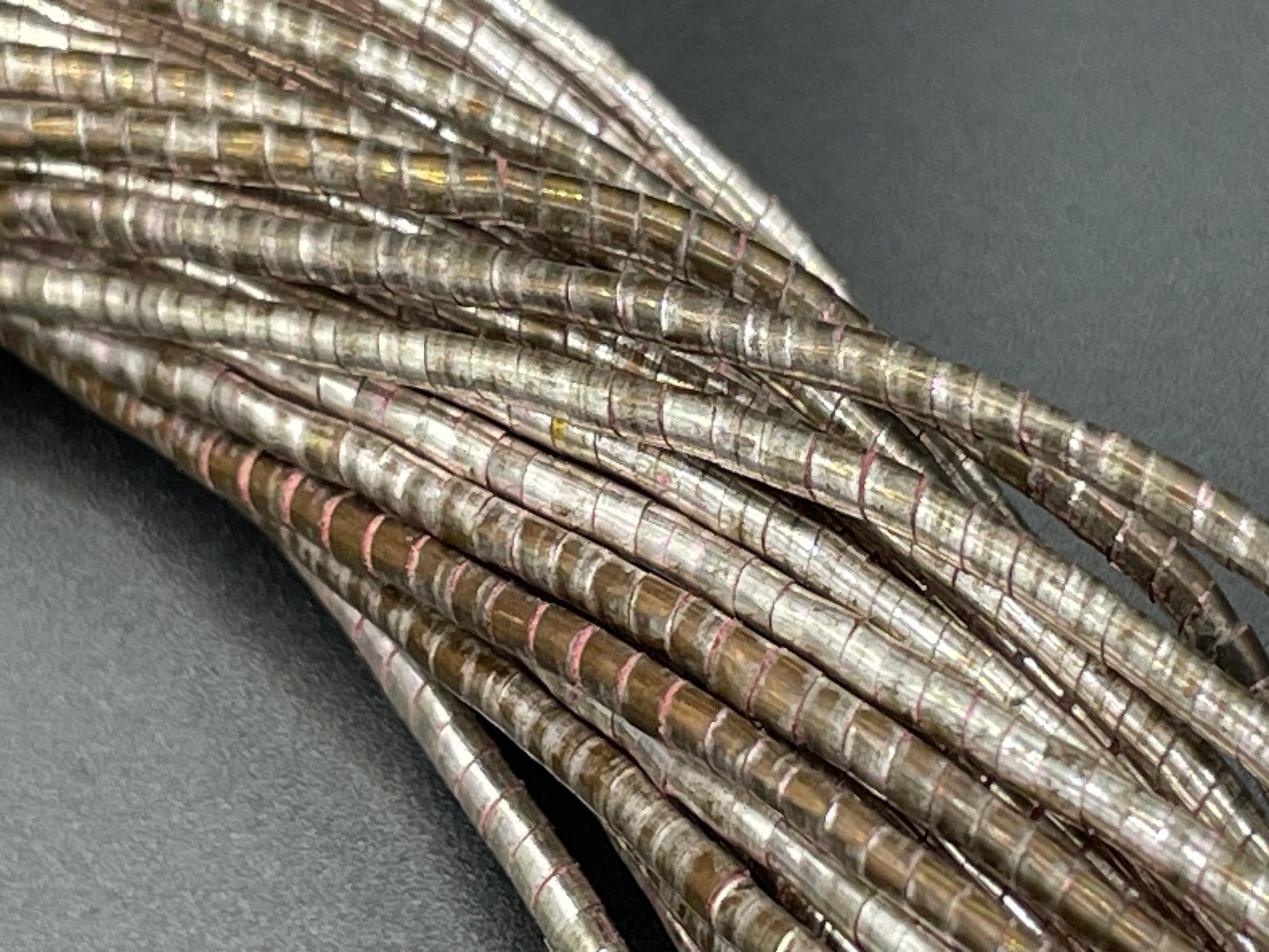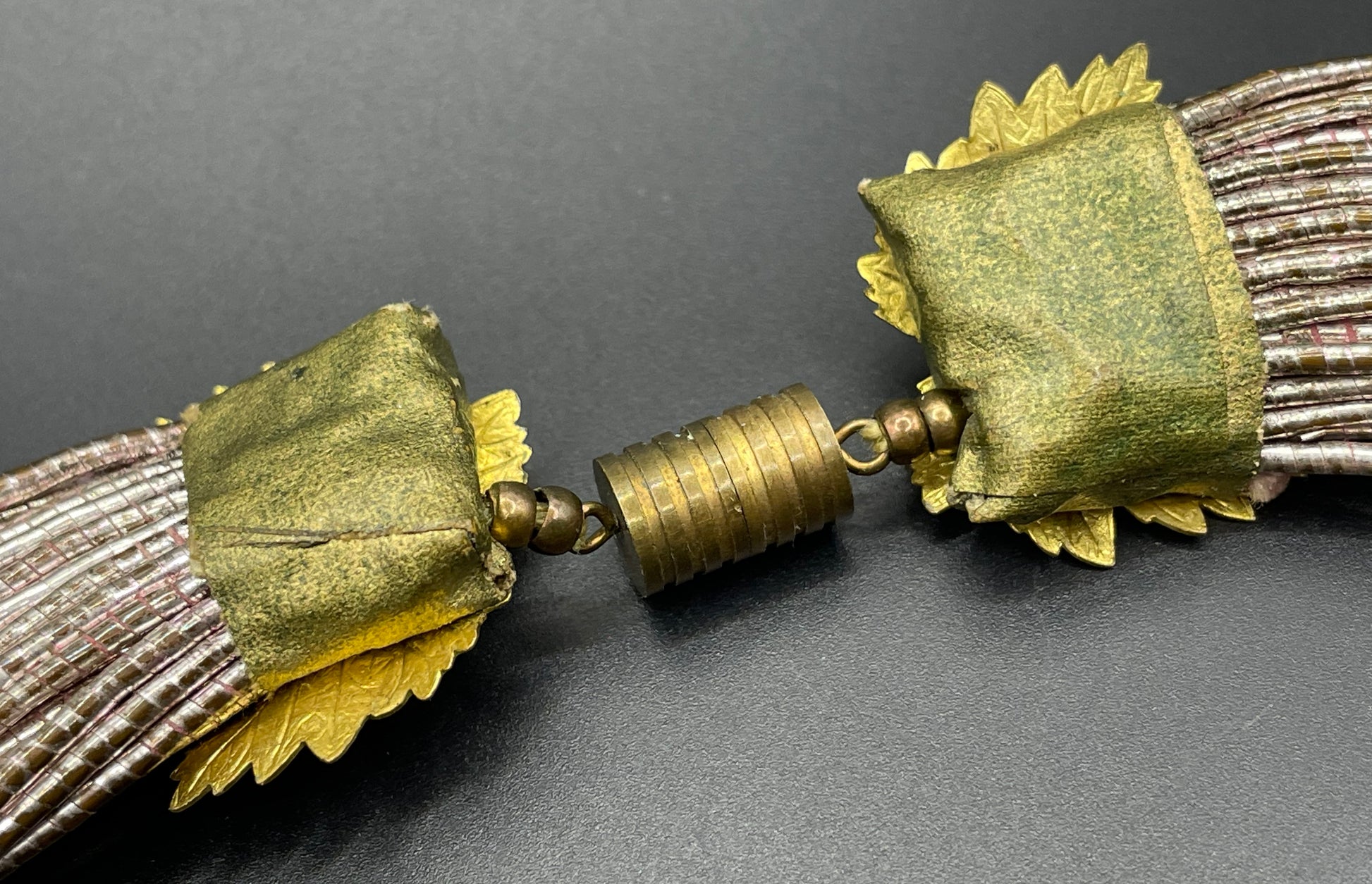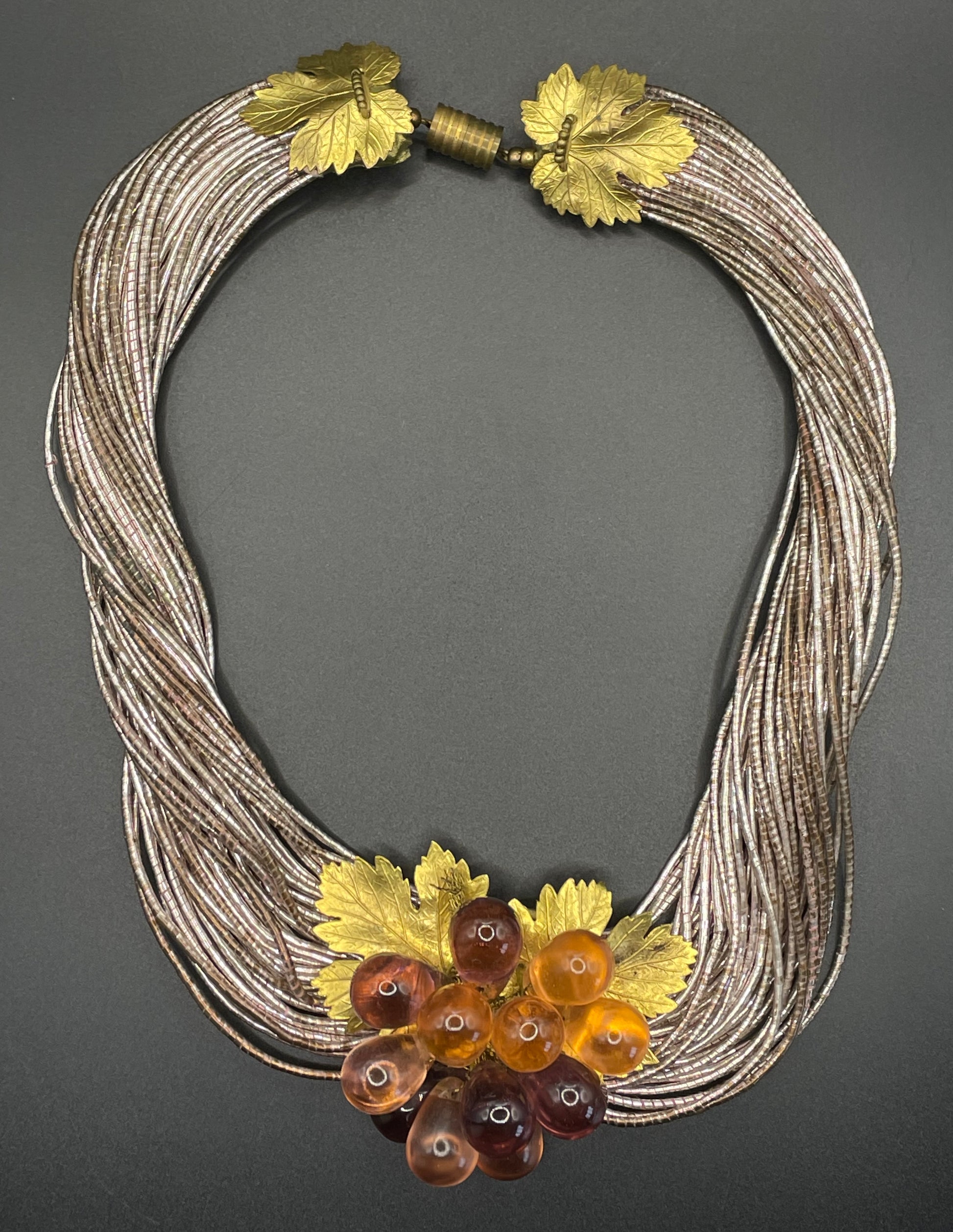 The multi-stranded sections around the neck are very interesting. They are threads or wires each wrapped in a silvery metallic foil. The wrapping material is quite thick, so the threads are cold to the touch and the whole piece is weighty and lovely to wear.