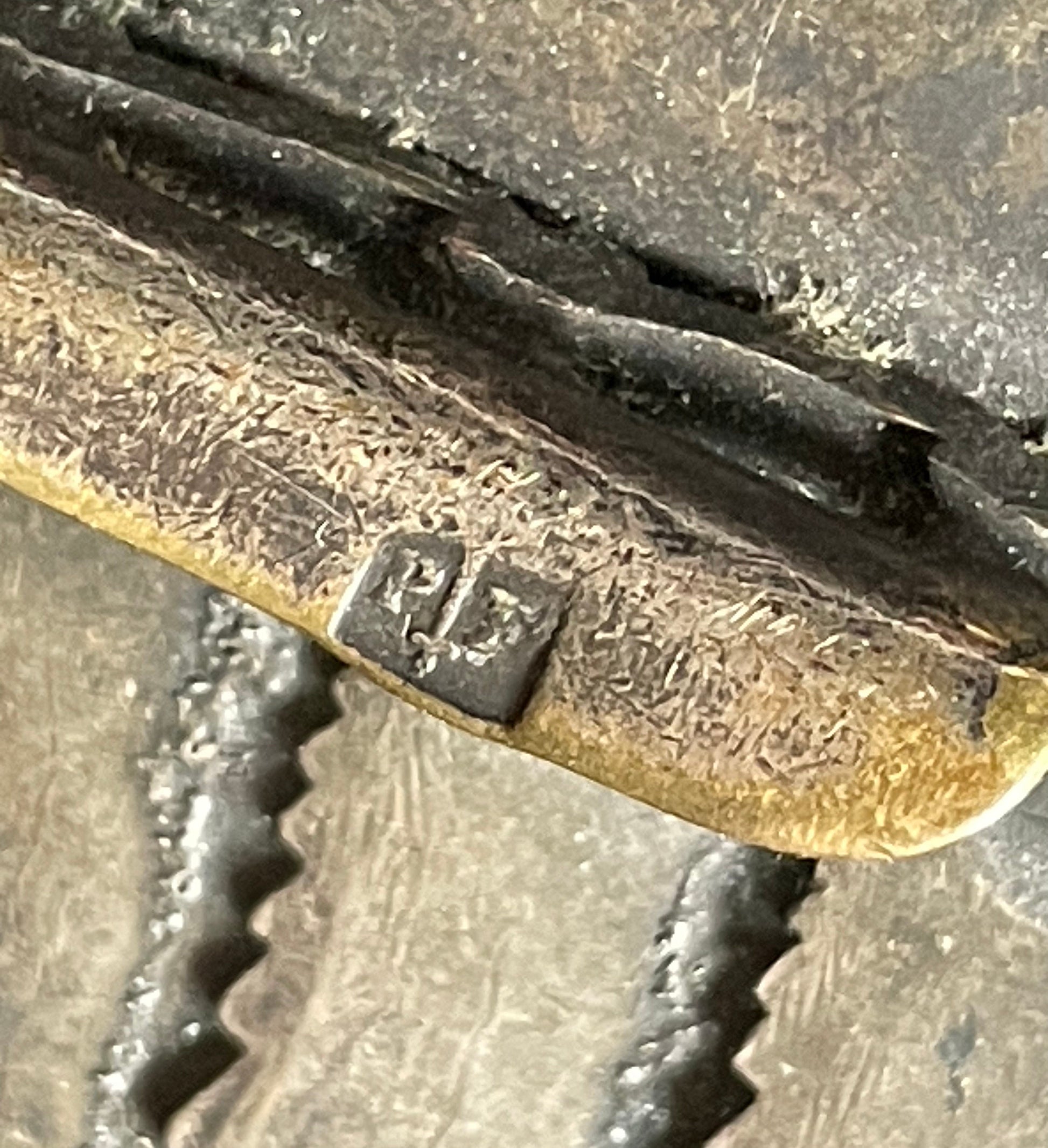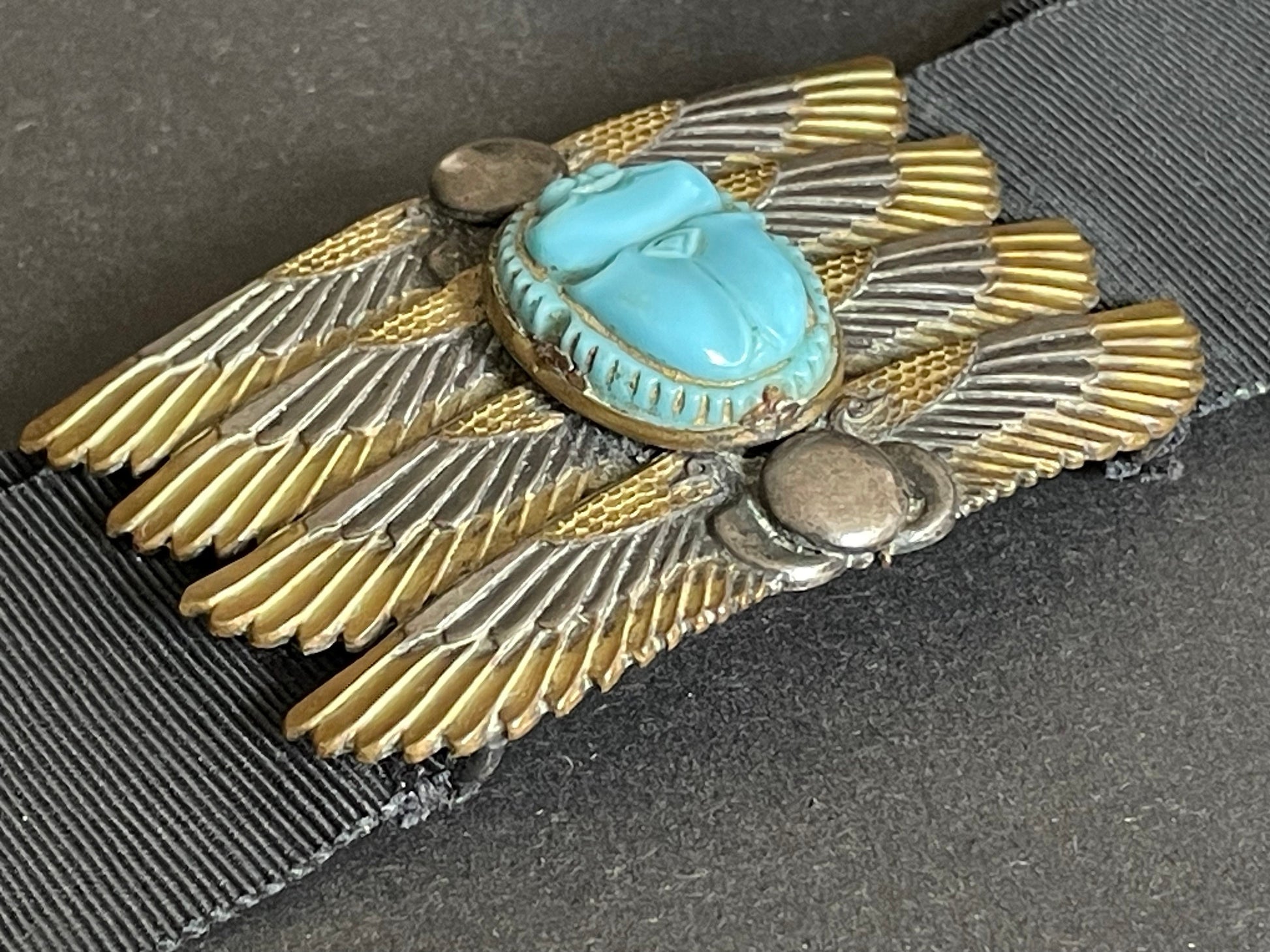The gilt and white metal belt buckle is formed of bi-colour gold and silver tone spread wings and features a central blue glass scarab. Freres is an artist much admired for his brilliant belt buckles, and in fact, a similar buckle features in the Virginia Museum of Fine Arts in the United States. Pieces like this are tributes to ancient Egyptian jewellery found in tombs from the early 20th century onwards. An example of this is the Winged Scarab Pectoral from Tutankhamun's tomb kept in the Egypt museum (https://egypt-museum.com/winged-scarab-pectoral-with-the-throne-name-of-tutankhamun/).