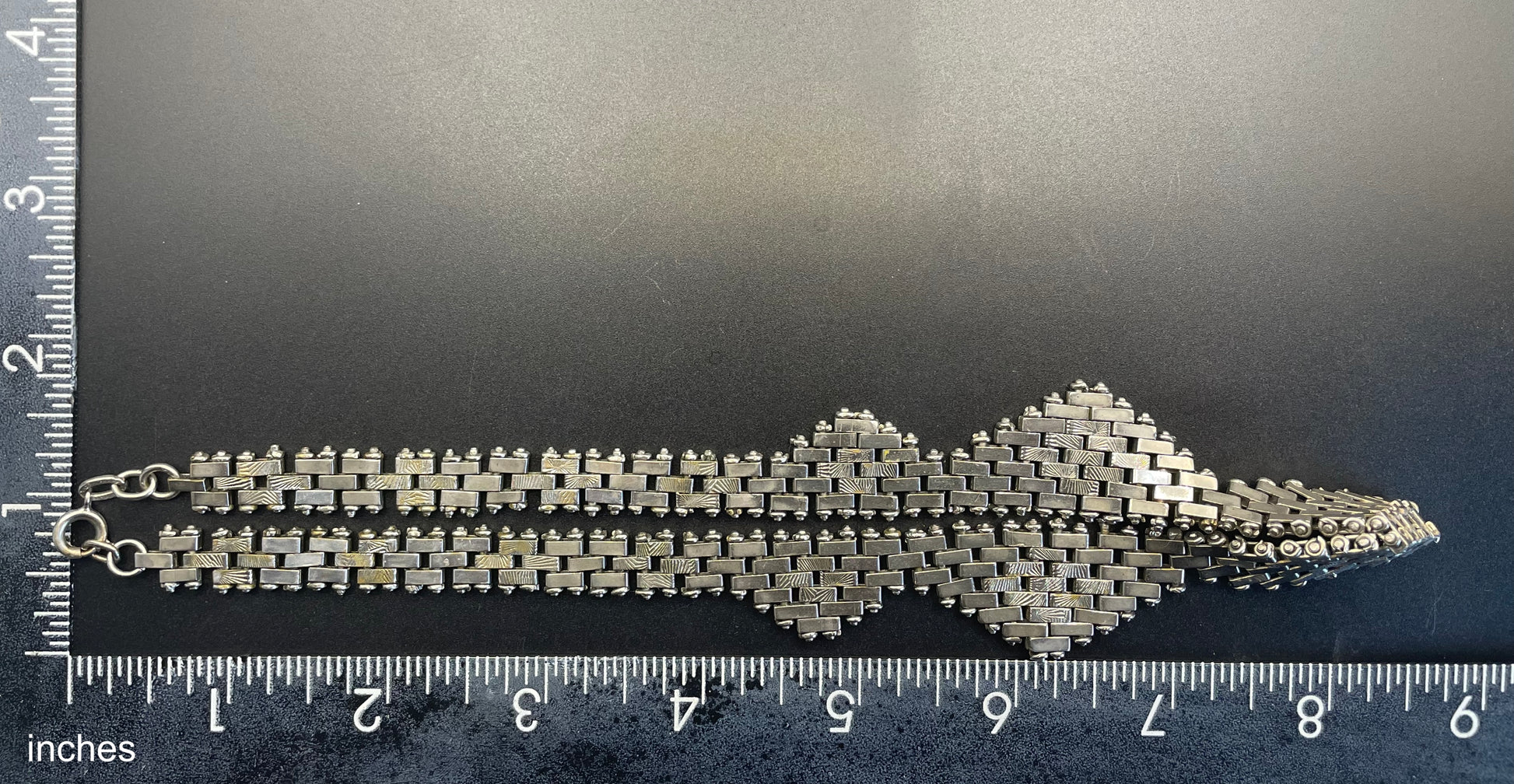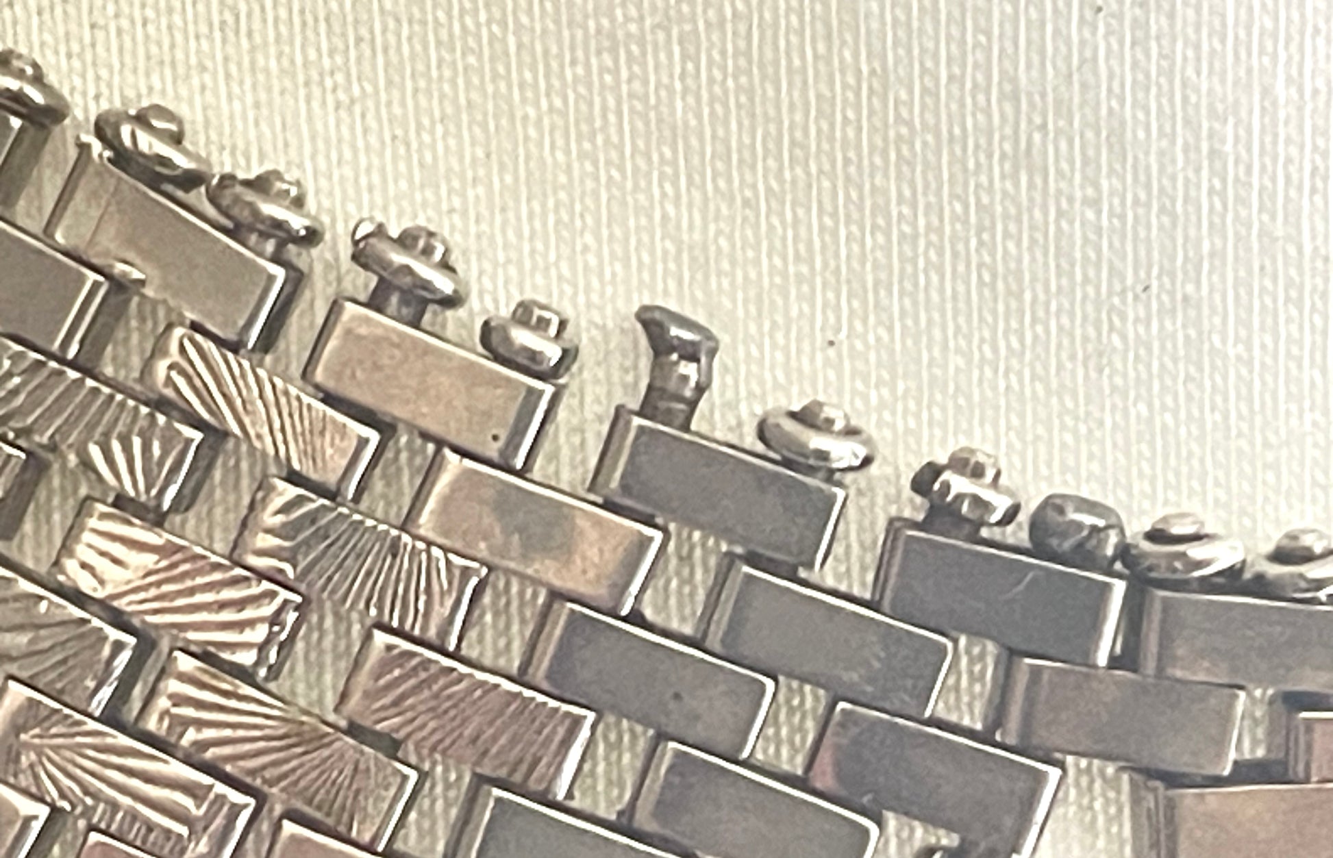 It is a fabulous quality necklace and it is in good vintage condition. The final photo shows a small repair where the end of one of the rods has had a little solder attached to the end to replace one of the tiny rings that must have been lost. The silver coloured chrome plating is pretty good - there may once have been coloured enamel hand-painted on some of the panels, but sometimes this wears off over the years. The lighting in some of the photos gives a golden glow or sheen in places, but the actual appearance of the surfaces is all shiny silver coloured.