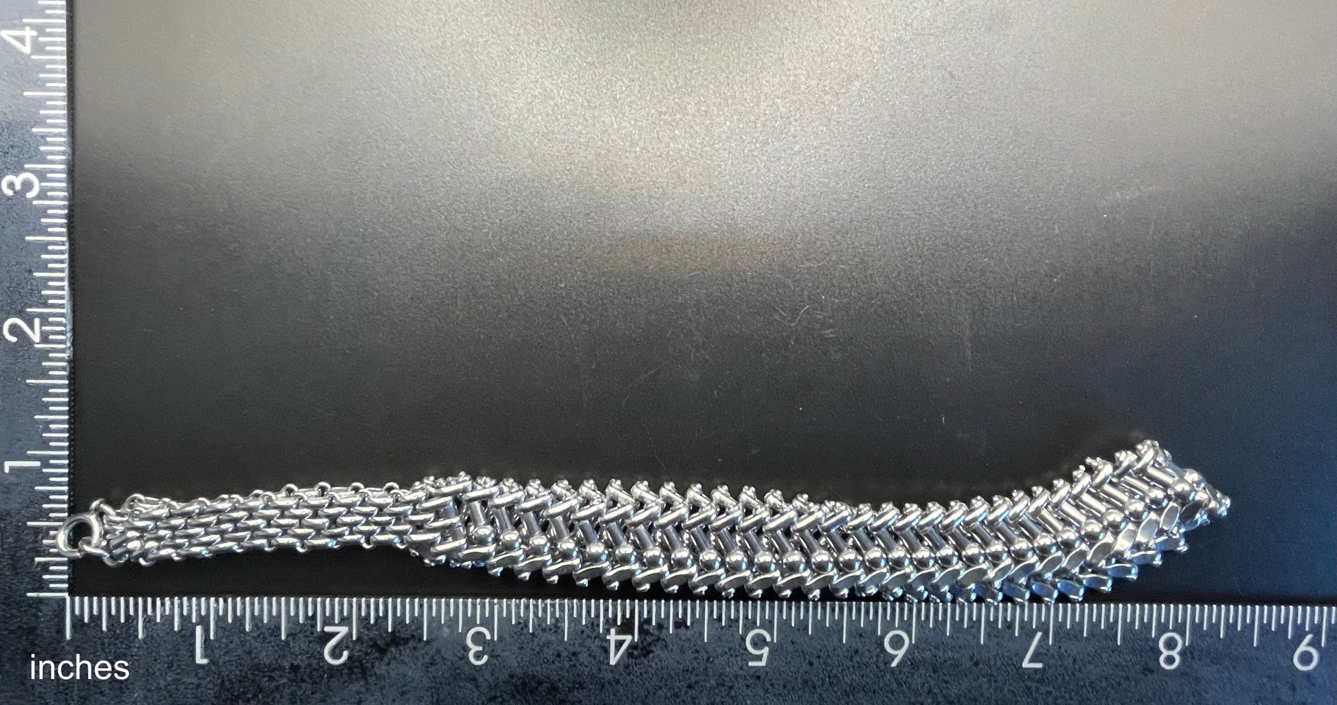 In this example, there is a central long section where the brickwork contains cylindrical pinks and ball bearing rows within the design. Two short sections around the back of the neck on either side of the clasp are simple smooth brickwork links I have more often seen in Bengel bracelets. It is a classic Art Deco geometric design in the machine age style - to me it is simple and chic.