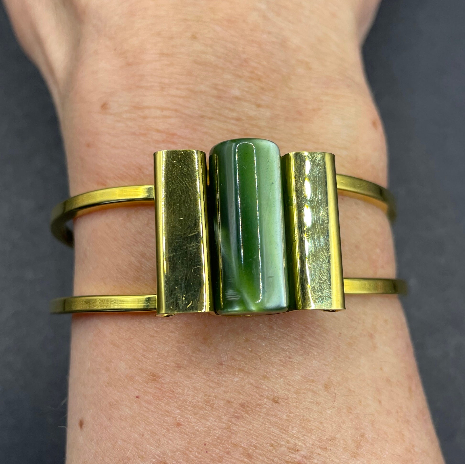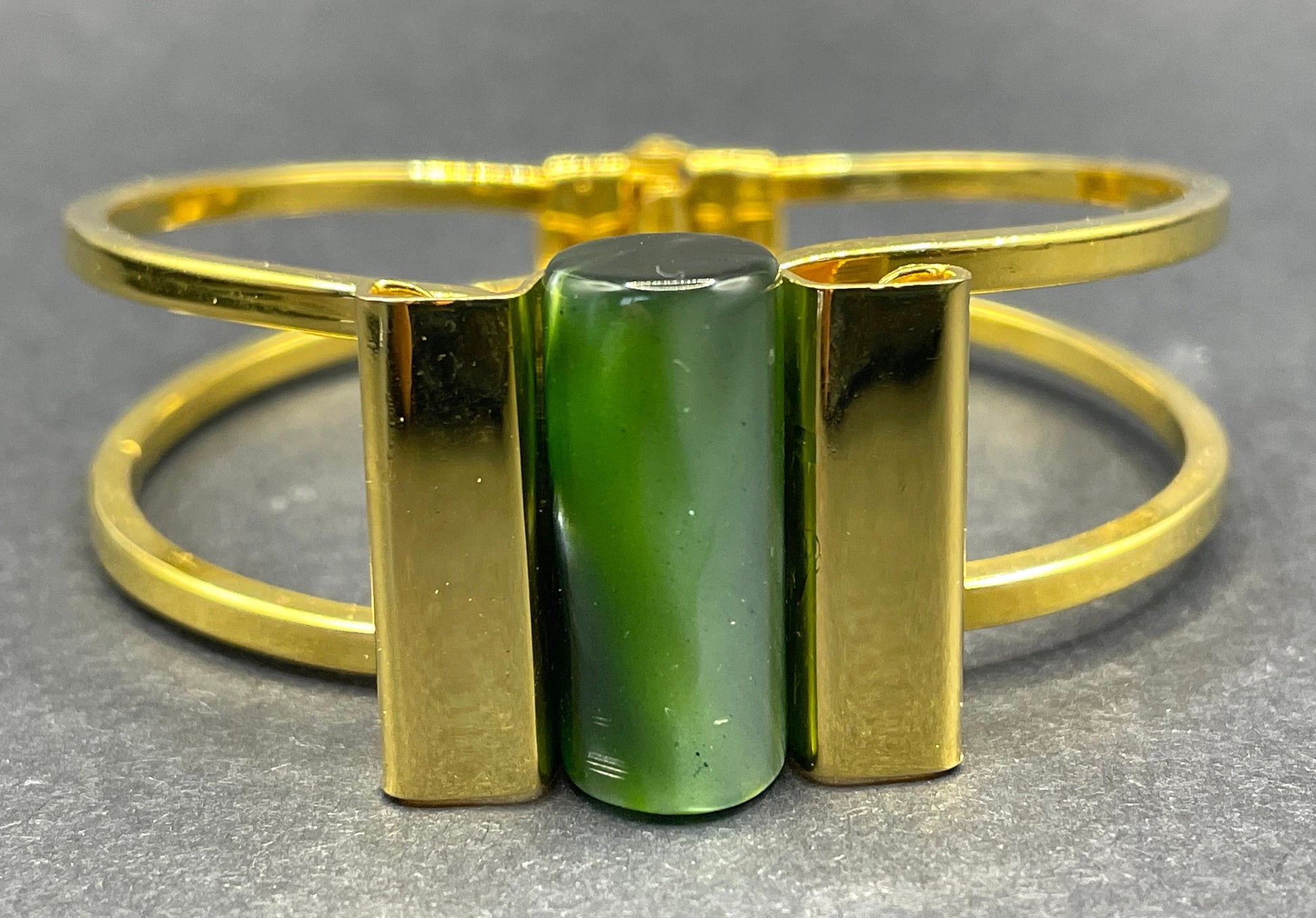 Vintage Jakob Bengel Art Deco machine age clamper bangle in shiny gold tone with a rich green galalith cylinder