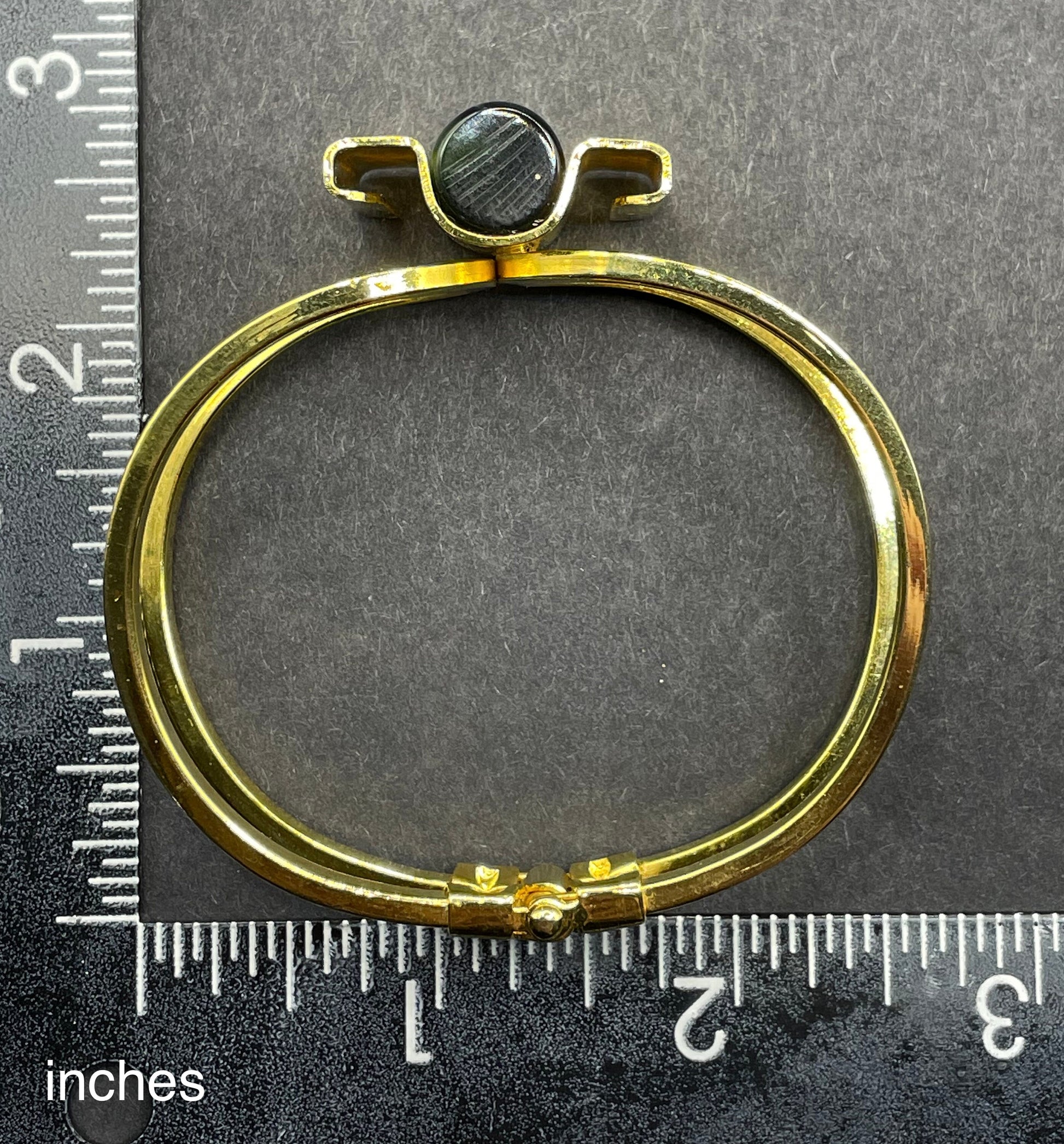 The bracelet is significant as both a jewellery adornment and collectable piece. Available here is one bracelet in gold tone with a beautiful rich, marbled green cylinder of galalith. It is in very good vintage condition with a tiny dent in the galalith (bottom left on the last picture that shows it on a wrist). I have one purple version still in stock and have also sold an orange version (pictured in last two photos).
