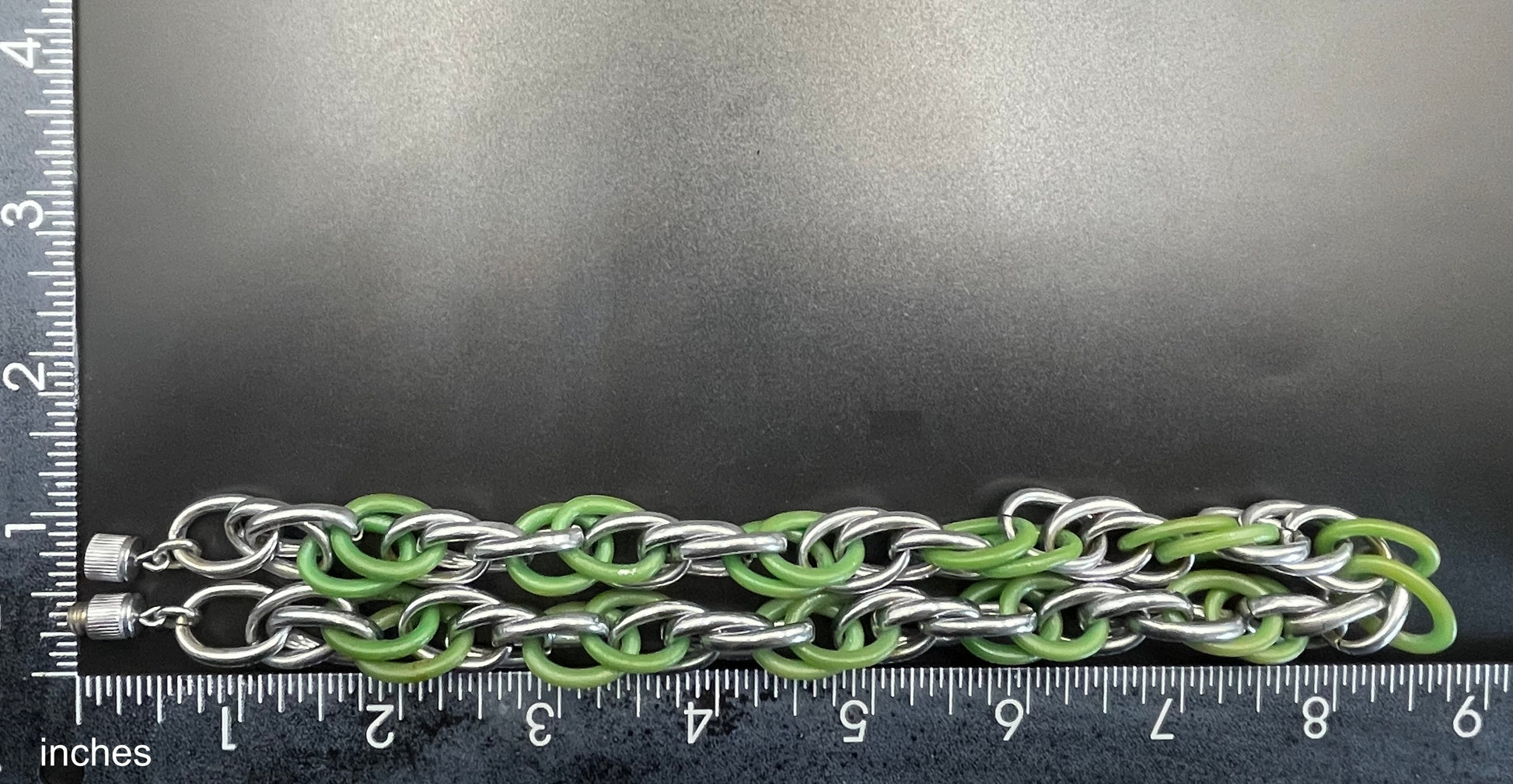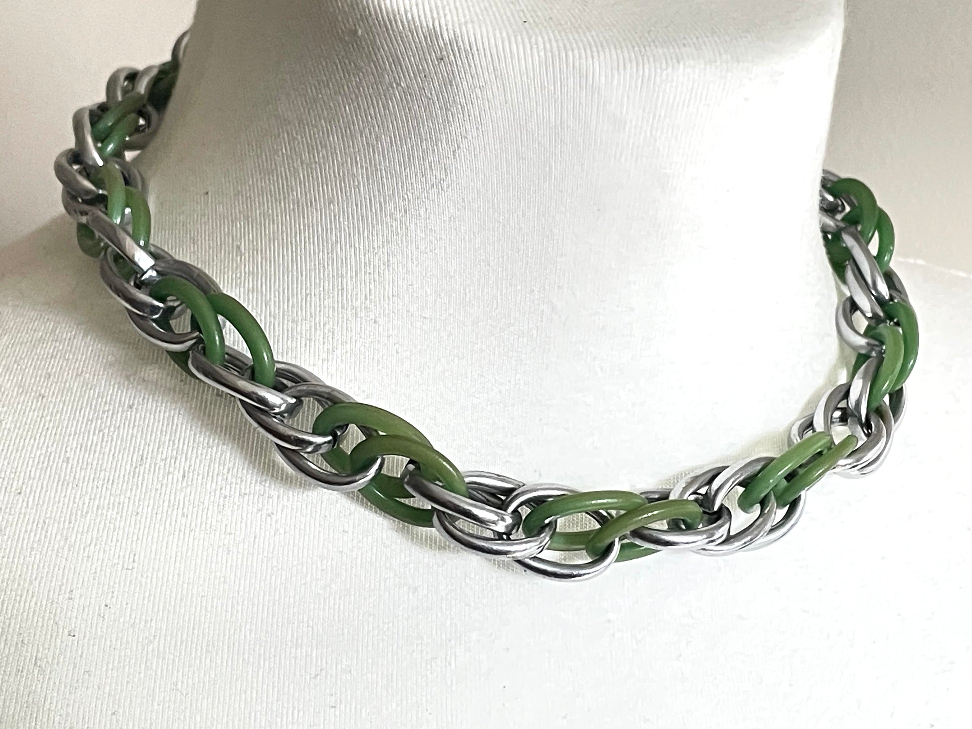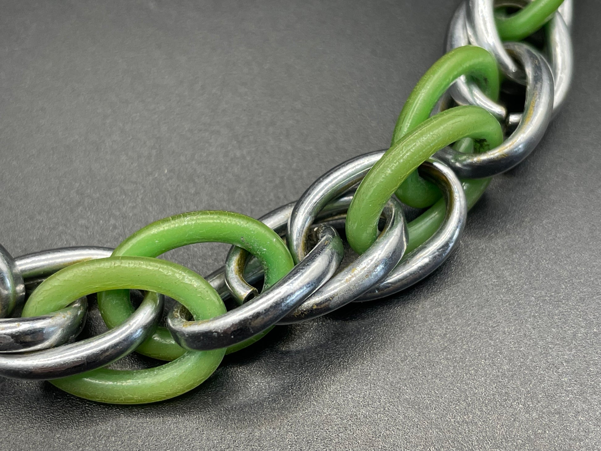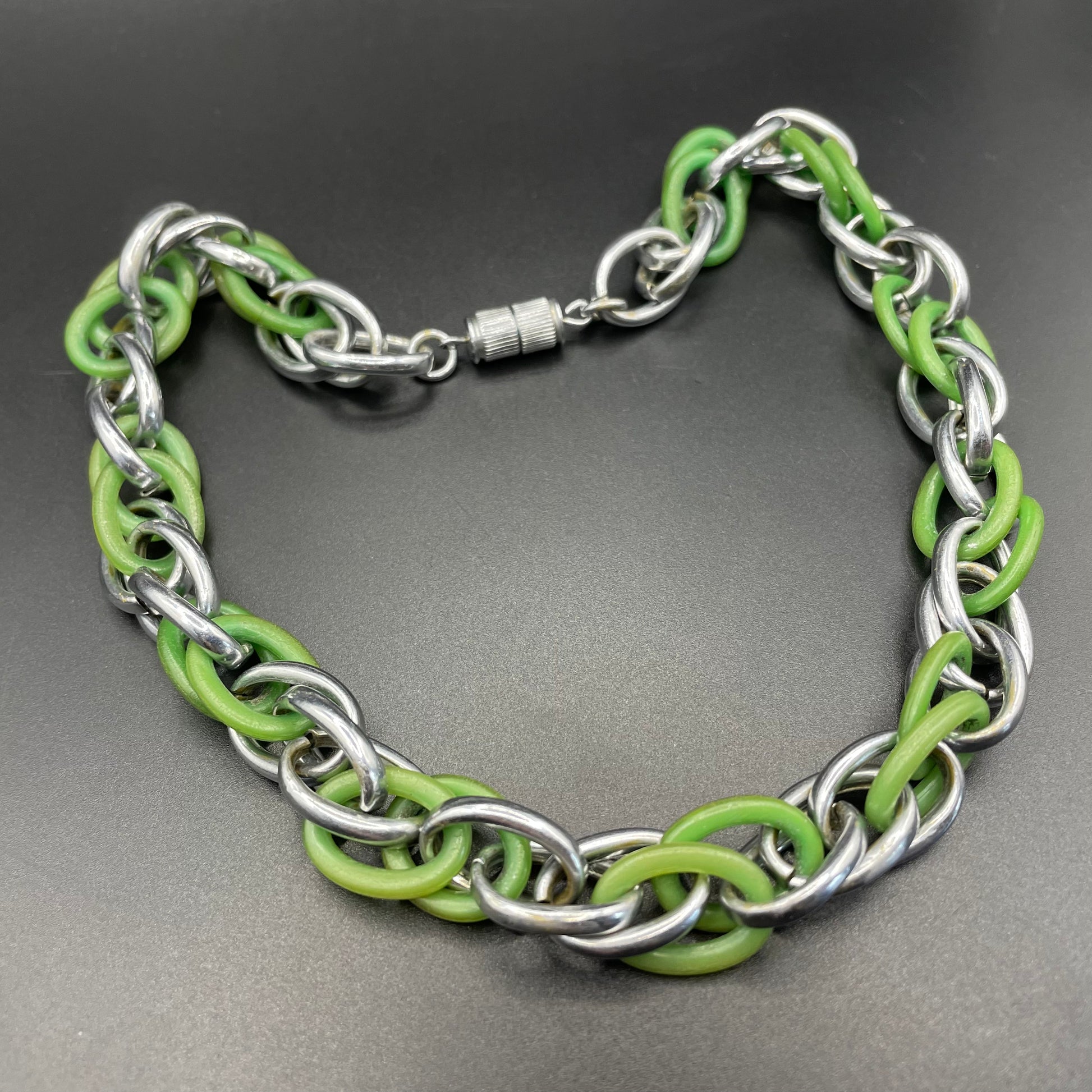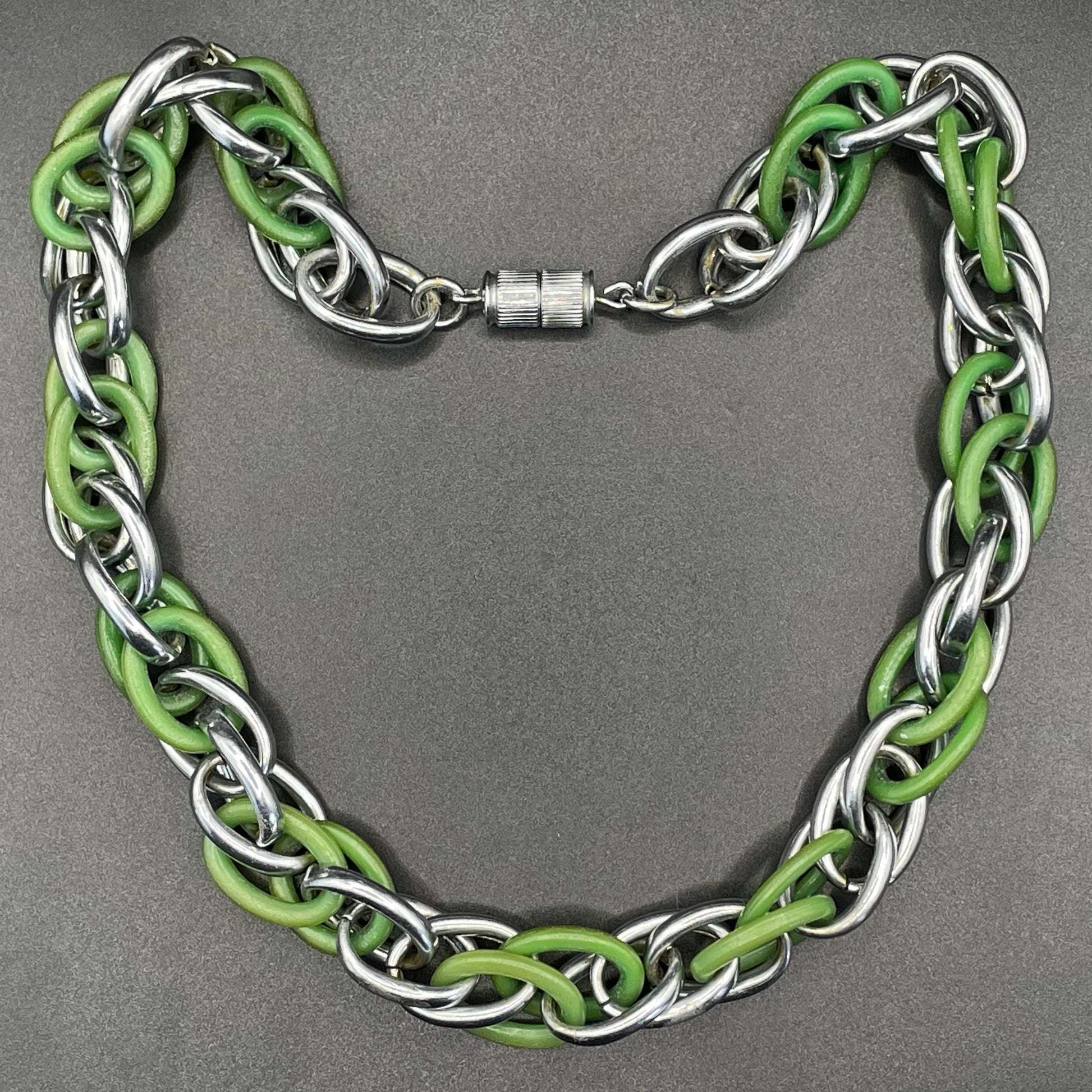 Vintage Jakob Bengel Art Deco machine age geometric silver tone chrome and green galalith interlocking ring chunky chain style necklace