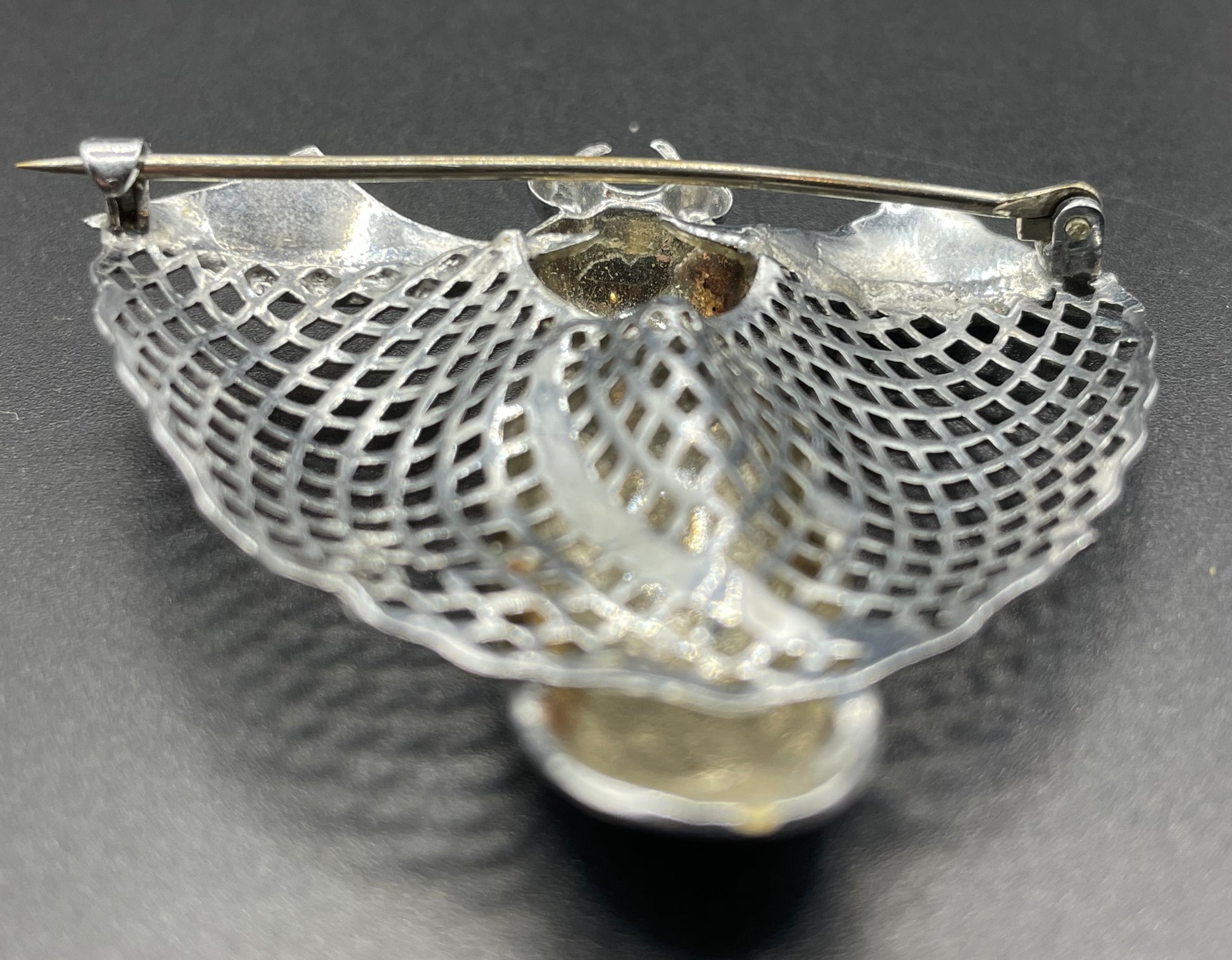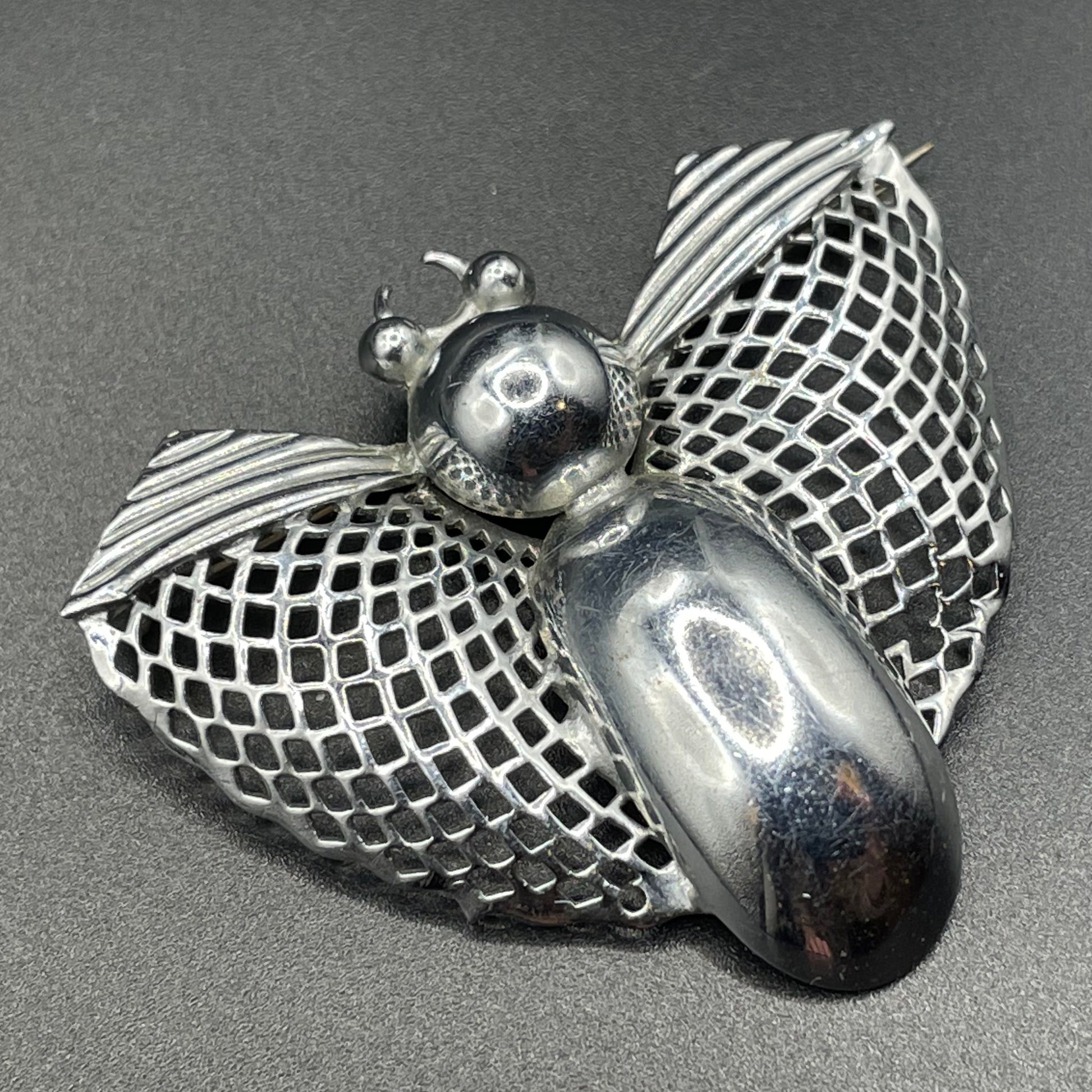 Large vintage Art Deco brooch in shiny silver tone chrome, depicting a moth or butterfly. The design uses different shapes and textures of space age shiny chrome beautifully, with smooth curves next to pierced metal cross hatching, next to corrugated surfaces.