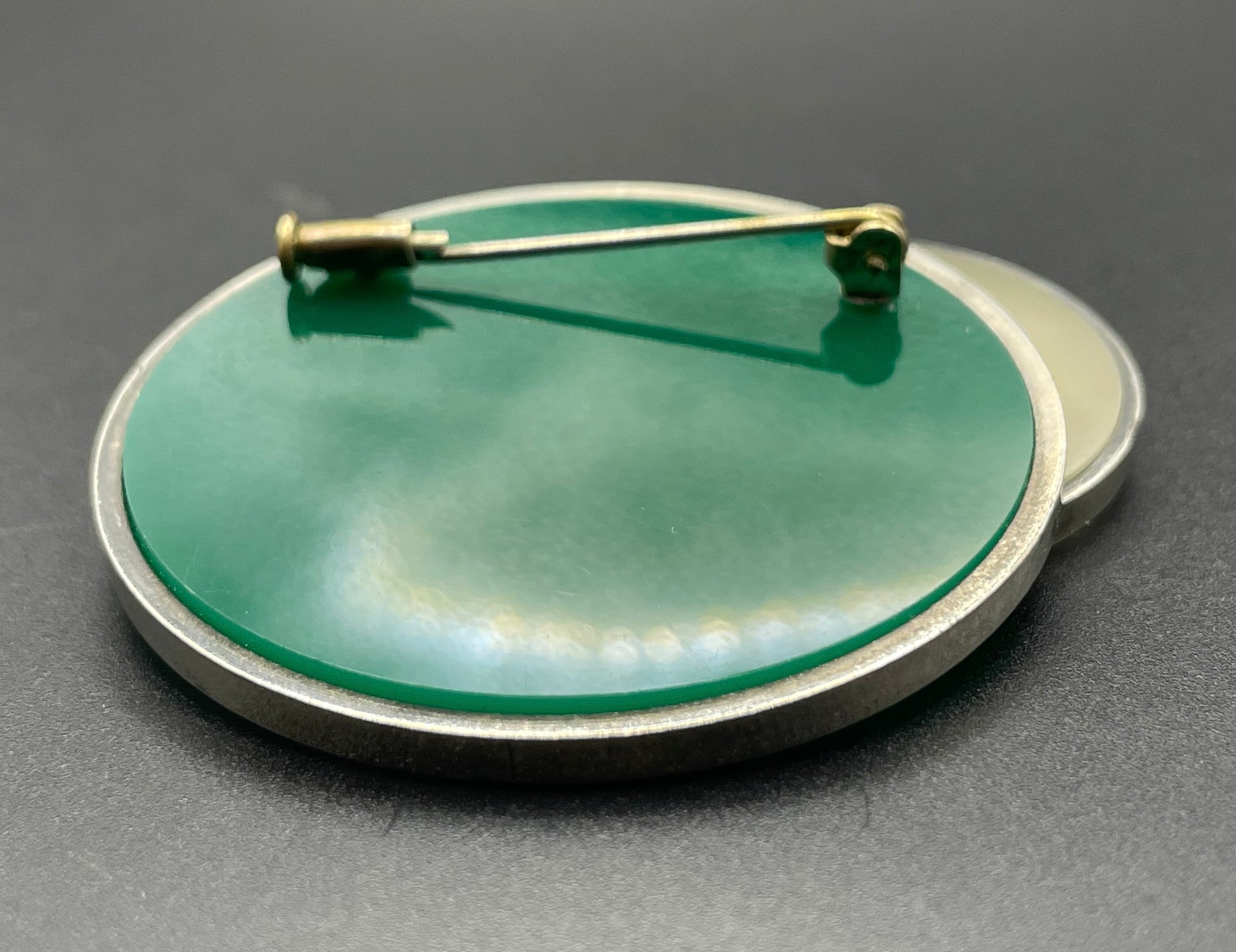 Vintage large Art Deco Bauhaus design green glass and silver tone (probably low grade silver) brooch with trombone clasp