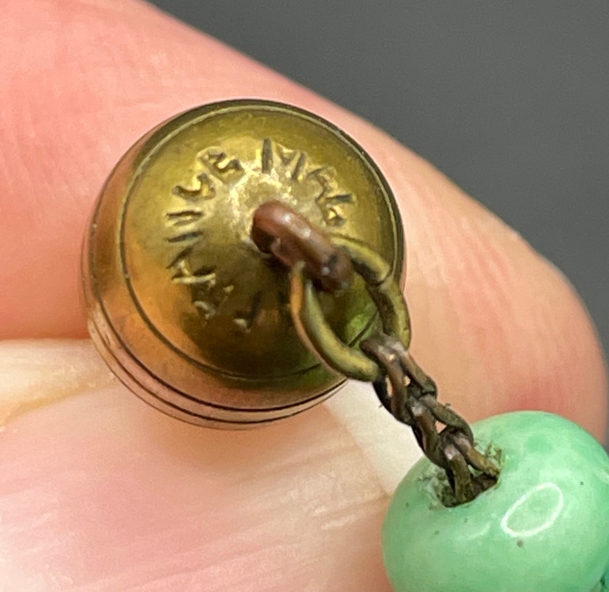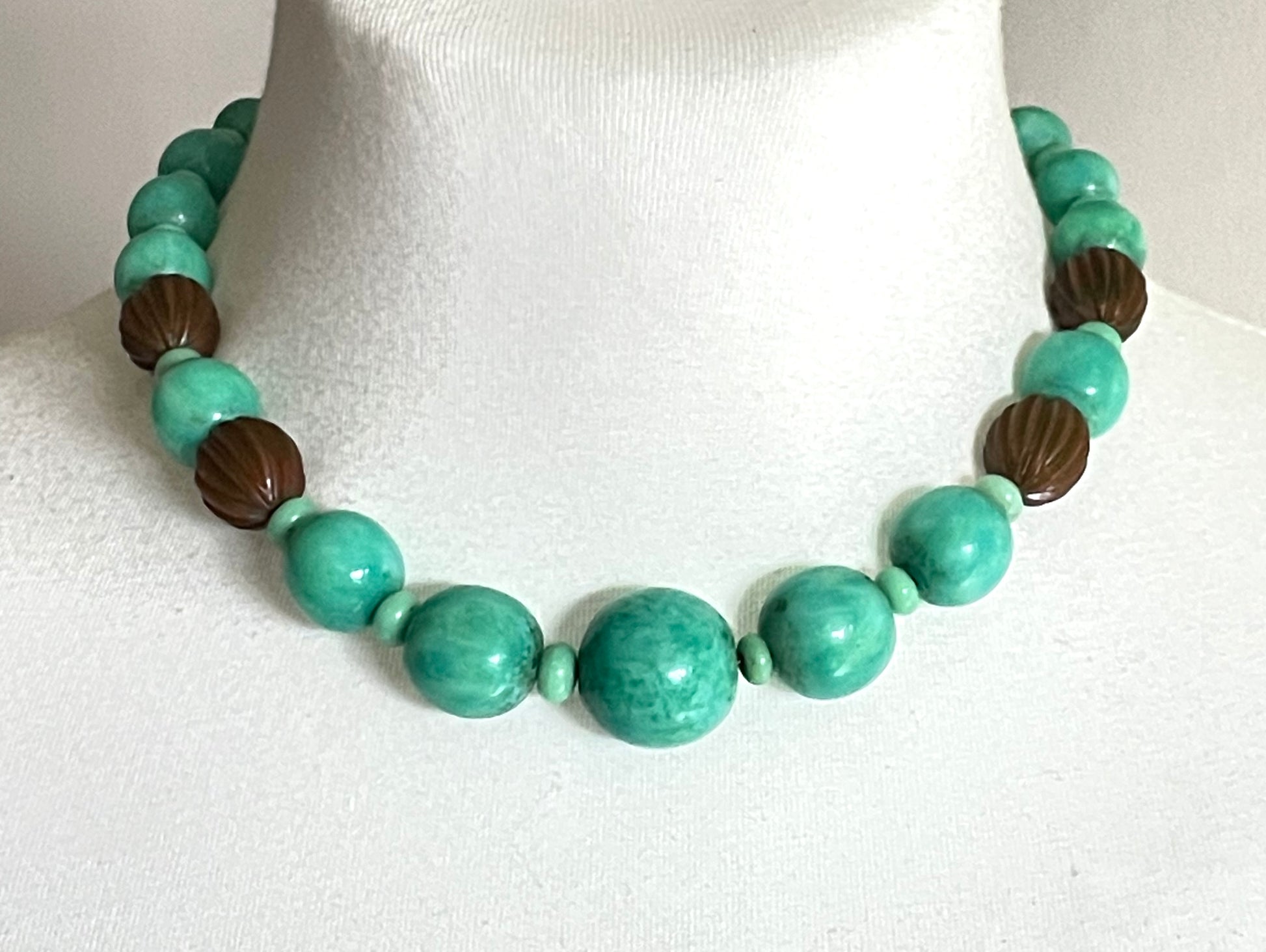 Vintage Louis Rousselet Art Deco green Peking style glass and carved galalith bead necklace, Made in France beehive clasp, foxtail chain