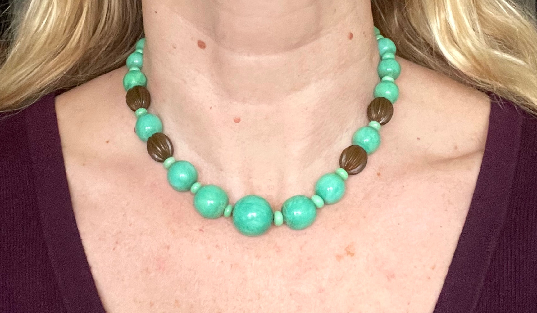 Galalith is an early casein-based plastic, a lot like Bakelite. The four greeny brown, organic looking galalith beads are beautifully moulded.
