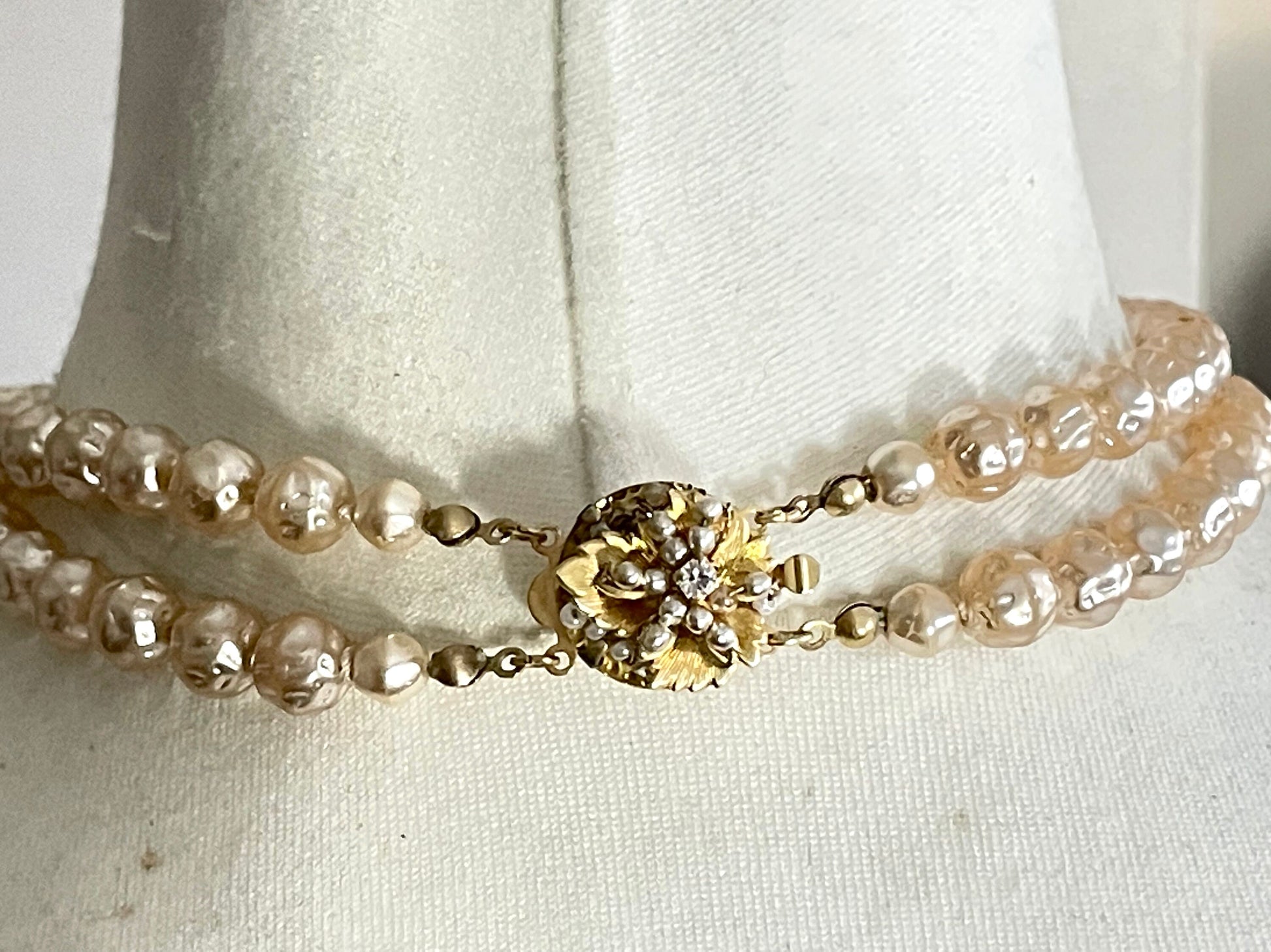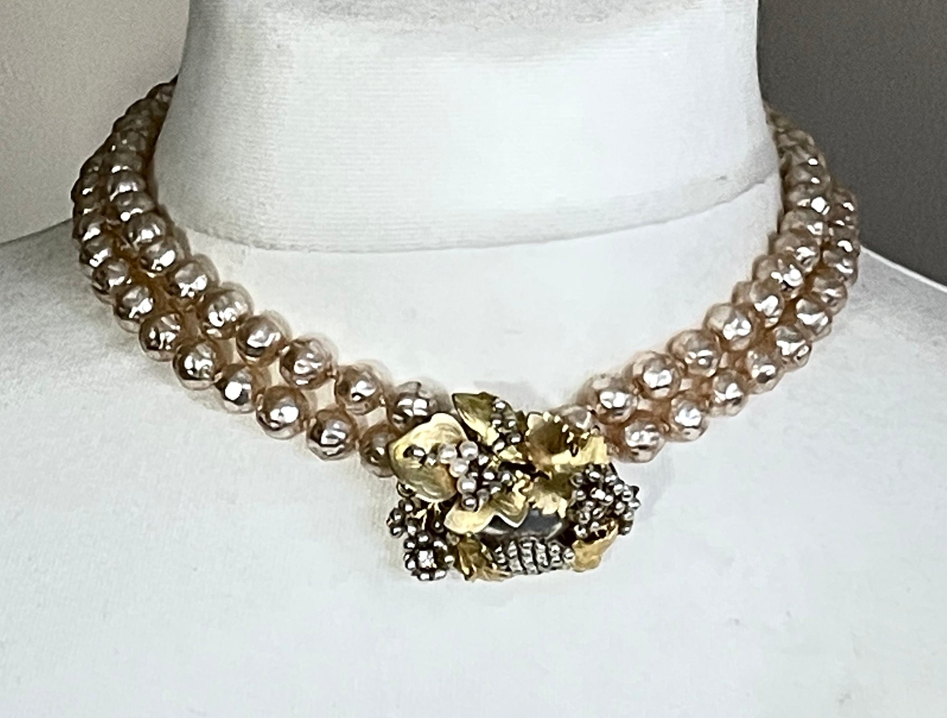 Vintage Miriam Haskell pale pink dimpled baroque pearl double strand necklace with ornate centrepiece and box clasp