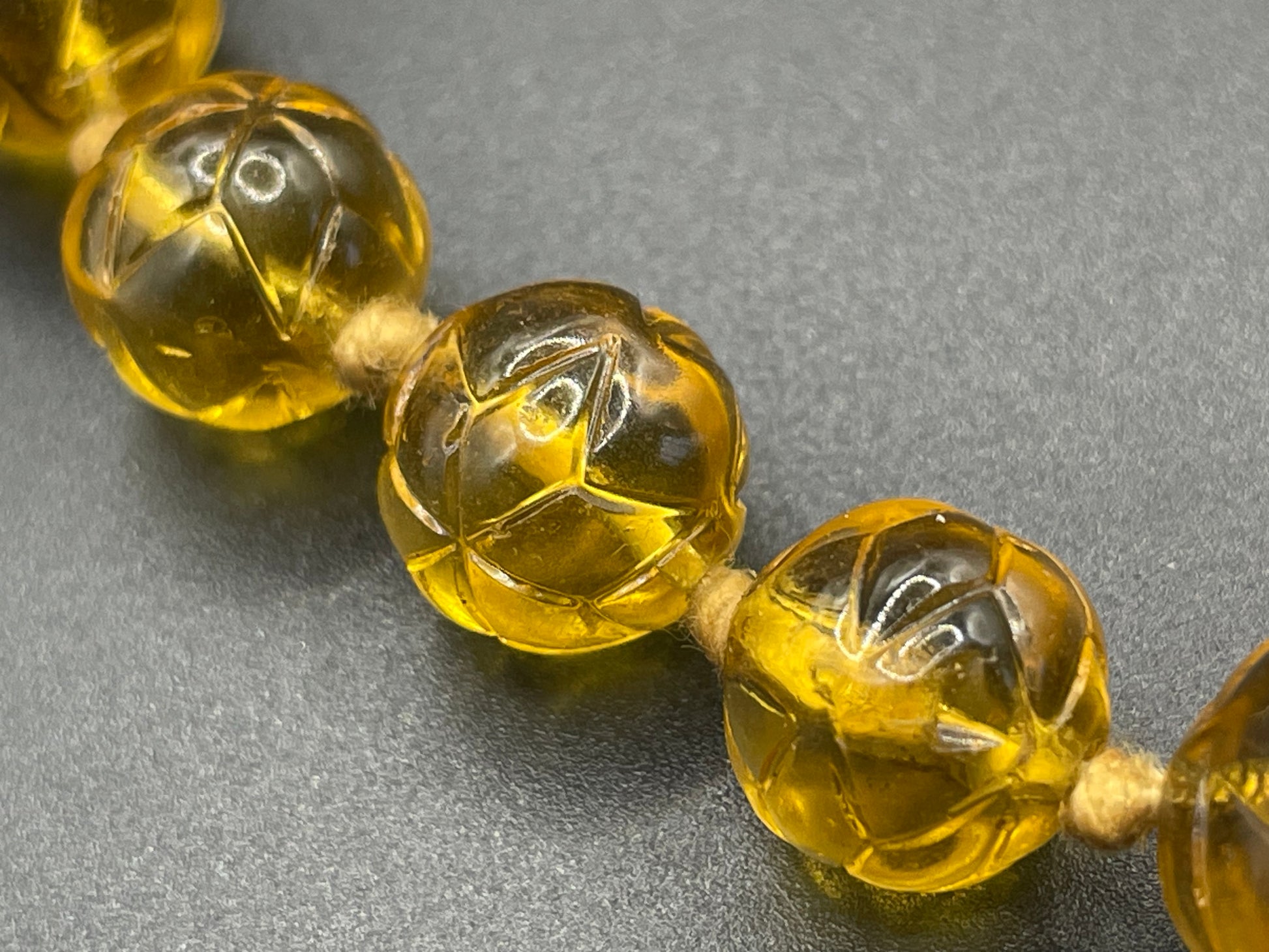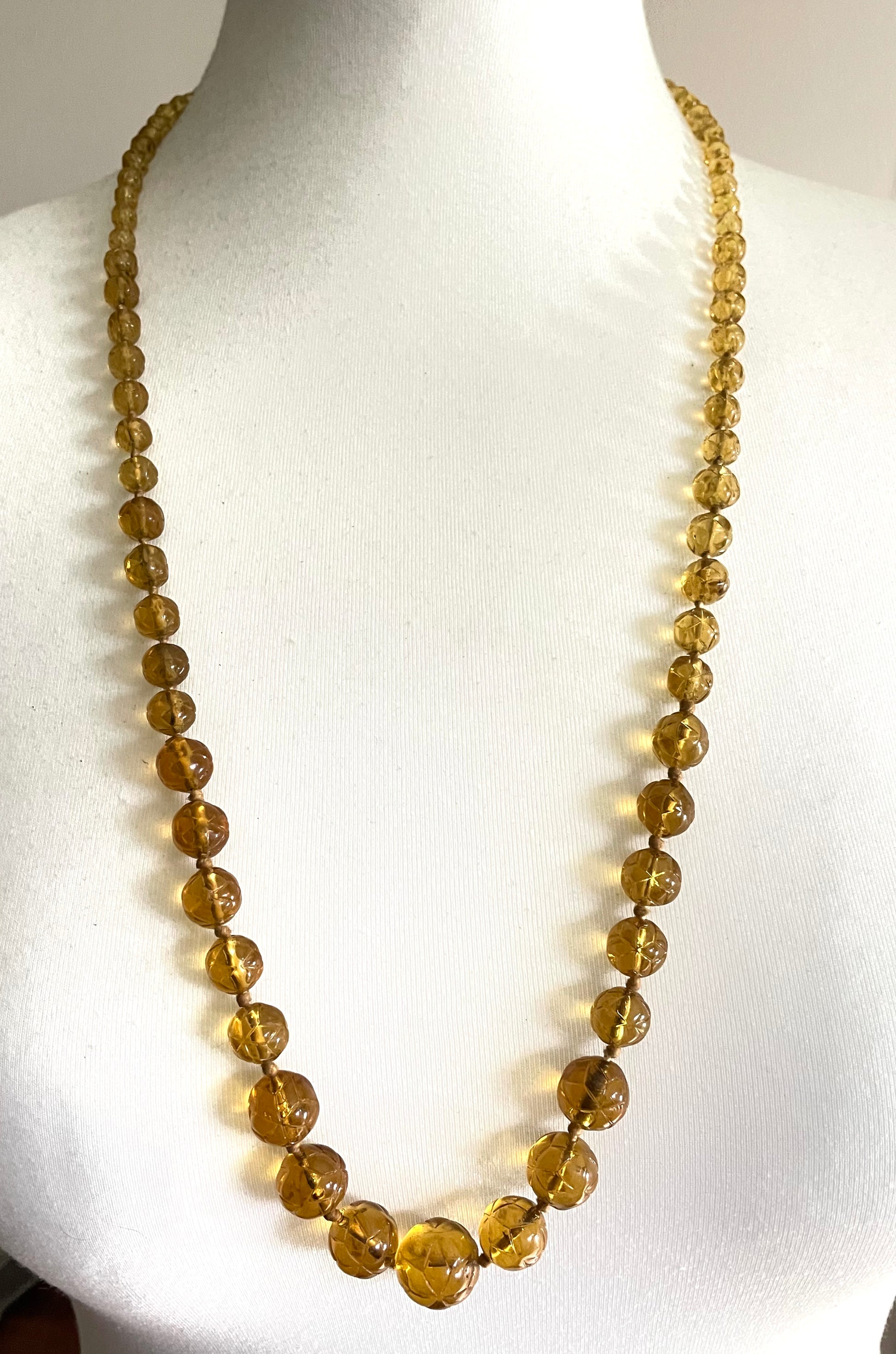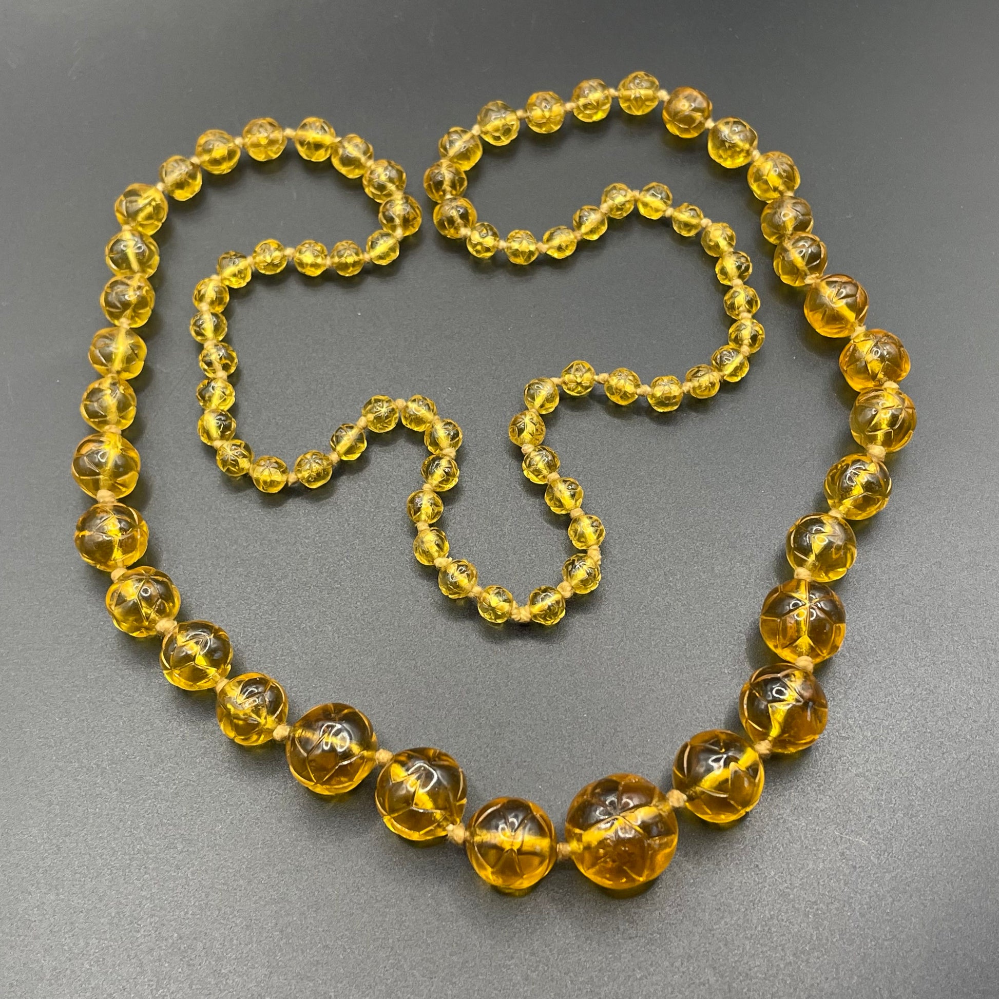 Vintage moulded pressed glass citrine yellow / orange graduated bead flapper necklace mid to longer length
